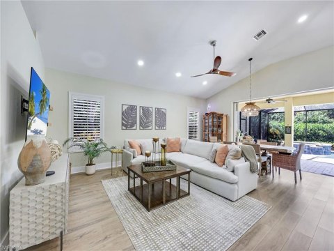 Bonita Shores Bonita Springs Homes for Sale: AMAZING RENOVATION & GORGEOUS CURB APPEAL! 1.2 MILES TO THE BEACH!! Noteworthy updates include a new roof in 2023, impact windows and sliders, a tankless water heater installed in 2021, and a 2020 AC unit. 2 fully remodeled baths - main bath is a STEAM SHOWER. The interior showcases a spacious great room with vaulted ceilings and exquisite detailing, complemented by “wood look” tiled flooring. The Shaker-style kitchen, the heart of the home, features an island with quartz countertops and an elegant tiled backsplash. A private guest wing offers its own entrance, a morning kitchen, and a serene patio off the bedroom, ideal for a peaceful retreat. Two additional bedrooms boast vaulted ceilings, ceiling fans, and generous closet space, providing a bright and airy feel. Outdoors, enjoy the Naples lifestyle with a newly renovated pool and spa adorned with mosaic tiles, stone coping, and a paver deck. The screened lanai overlooks the beautifully landscaped yard, creating a serene outdoor haven. A custom-built fire pit invites relaxation while you savor stunning sunsets over the lake from the western-exposure backyard. Additional outdoor features include a shed, LED landscape lighting lushly landscaped. Neighborhood has a community center, boat ramp and perfectly located steps to open waters, boating, kayaking, paddle boarding activities in this northern Collier County community.