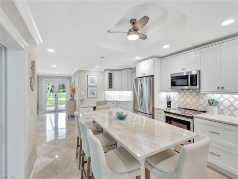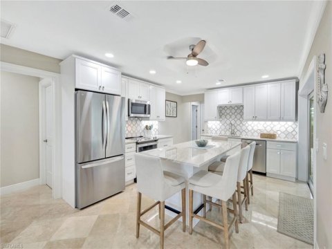 View Details Bonita Shores Bonita Springs Homes: Discover the ideal blend of modern luxury and coastal charm in this beautifully remodeled three-bedroom, 2.5-bath residence, just minutes from the beach. Go inside to an open, airy layout with soaring volume ceilings, warm LED lighting, and premium LVP flooring throughout. The stunning new kitchen features an oversized island with Mystic Pearl Arista quartz countertops and is a spot for family gatherings and entertaining. Other kitchen upgrades include custom shaker-style cabinetry with stylish hardware, a farmhouse sink, a timeless tiled backsplash, built-in wine cooler and top-of-the-line appliances. The well-designed utility room offers a full-size LG stackable washer and dryer, folding station and ample storage. Additional upgrades include all new interior and closet doors, and fully renovated baths. The foyer accommodates a convenient powder room with access to the two-car attached garage. Go outside to your private oasis, complete with a heated pool and spa, paved deck and screen-enclosed lanai, ideal for relaxing or hosting friends year-round. A newer metal roof added in 2024 gives great curb appeal, peace of mind and long-term value. This move-in-ready home delivers comfort, style and an unbeatable location. Bonita Shores offers a member-only private boat launch with Gulf access for easy boating and a Collier County location. Close to Barefoot Beach and local restaurants, this one is an opportunity not to be missed!