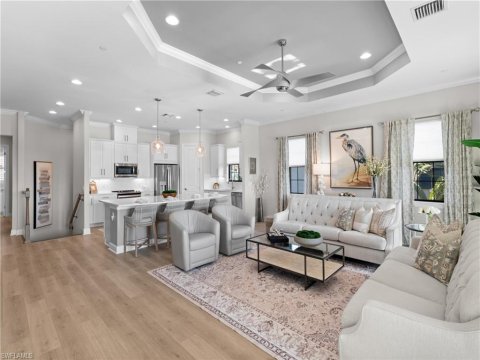Esplanade Naples Condos for Sale: Welcome to The Gulf Life! This stunning coach home is located within the prestigious Esplanade Golf & Country Club in Naples, Florida. Step into luxury with this beautifully appointed 3 bedroom + den, 2 1/2 bath residence offering over 2,300 square feet of open-concept living. Designed for both style and elegance, the home features hurricane-impact windows and doors throughout and is thoughtfully decorated in a coastal beach-style theme, blending airy tones, natural textures, and a relaxed yet sophisticated ambiance that perfectly compliments the Naples lifestyle. The bright, spacious great room flows seamlessly into the chef’s kitchen, complete with granite countertops, GE stainless steel appliances, an oversized center island, and abundant cabinet space—perfect for entertaining or casual gatherings. Elegant upgrades abound: a dramatic feature wall with an electric fireplace, custom cabinetry and shelving, tray ceilings, stylish lighting, and a stained solid-wood stairwell elevate the living experience. The primary suite boasts a spa-inspired bathroom and custom walk-in closets, while the additional bedrooms and versatile den provide space for guests, a home office, or formal dining. Enjoy the outdoors from a generous screened-in lanai overlooking a peaceful lake, offering the perfect setting for morning coffee, evening cocktails, or simply relaxing with a view. As a resident of Esplanade, you’ll enjoy a lifestyle that feels like a permanent vacation. Amenities include a resort-style pool with cabanas and the Bahama Bar, a 15,000 sq ft clubhouse with restaurant, wine-tasting room, wine lockers, and café, plus the Koquina Day Spa, a state-of-the-art fitness center, tennis and pickleball courts, bocce courts, dog parks, and over 14 miles of walking and biking trails. This home is more than just a place to live—it’s an invitation to experience the very best of Naples living. Don’t miss your chance to own this exceptional residence in one of Southwest Florida’s most sought-after communities.