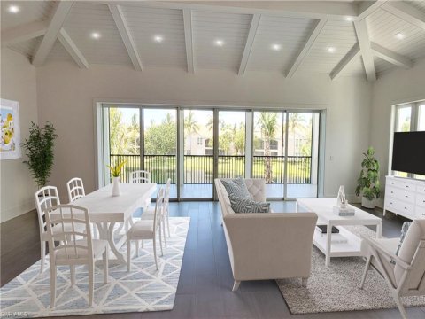 Callista Fiddler's Creek Naples Condos for Sale: Relish the embodiment of the Naples resort lifestyle! In a quiet neighborhood, this second-floor, lakefront, coach home has been lavishly remodeled to surpass the surrounding basic, ongoing new construction. Upgrades include beautiful wood flooring throughout most of the home, wood steps, wrought-iron staircase, quartz countertops, 42-inch white custom cabinets with soft-close drawers, JennAir stainless appliances, designer crown molding throughout, plantation shutters and decorative wood walls. Hurricane-impact windows and doors throughout, and electric storm screens on lanai provide an added level of safety. Newly installed elevator, HVAC and more. The formal living room adds a touch of elegance to this magnificent home. The primary suite opens into the lanai with lake views and features two spacious walk-in closets. The primary bath has dual sinks on opposite walls with an oversized shower and soaking tub. The large second bedroom features en-suite bath with private Juliette balcony. Third bedroom has decorative wood-trimmed walls. The half bath can be returned to full bath if desired. Tastefully decorated with upscale furnishings and designer treatments provide immediate enjoyment for discerning individuals. Fiddler’s Creek is a guard-gated, patrolled, resort community featuring a nature park with boardwalk and gazebo, 54,000-square-foot clubhouse, six Har-Tru tennis courts, bocce ball, four pickleball courts, state-of-the-art fitness facility and full-service spa, resort-style multi-pool swimming complex with cascading waterfalls and whirlpool, a variety of clubs, classes and seminars, year-round social activities, events and themed dinner parties. Culinary choices include Caxambas for fine dining, casual alfresco at The Gator Grille and beachfront at Sale e Pepe.