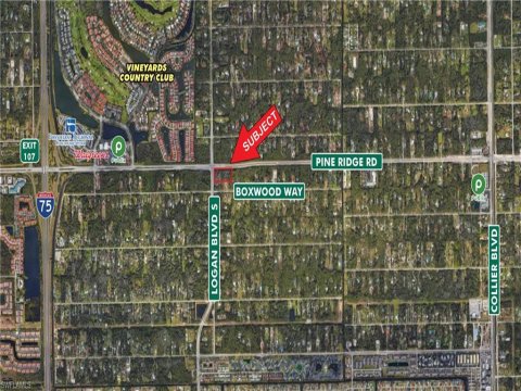 Golden Gate Estates Naples Land for Sale: This 2.8± net acres is situated at the SE corner of the signalized intersection of Pine Ridge Road and Logan Boulevard S, a high traffic intersection boasting almost 70,000 vehicles per day and surrounded by both established and growing residential communities. Excellent visibility and access from three road frontages, Pine Ridge Road, Logan Boulevard S and Boxwood Way. Subject to amending the GGAMP (Golden Gate Area Master Plan), the current Estate District zoning has the potential of being developed into an ALF project, Place of Worship, School, Nursing Home, and more. The site also offers the potential for Commercial, Gas Station, Car Wash, Drug Store, and Retail use, subject to rezoning as well as amending the GGAMP. PLEASE SEE THE ATTACHED "SUPPLEMENT" FOR MORE DETAIL.