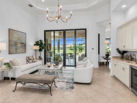 Lakoya Lely Resort Naples Homes for Sale: 6477 Costa Circle embodies a level of refinement rarely found in Lely Resort. Set within the exclusive enclave of Lakoya, this custom Greenbriar II by Stock Signature Homes pairs architectural integrity with a curated aesthetic that elevates every room. A hand-forged Cantera iron door opens to interiors defined by thoughtful craftsmanship—24-inch diagonal stone flooring, tailored millwork, and a luminous flow of natural light. The kitchen serves as both a functional workspace and a work of art, showcasing stacked illuminated cabinetry, a walnut butcher-block island, hand-painted Tabarka tile, a Viking gas cooktop, Monogram appliances, and a California Closets pantry designed for effortless organization. Sophisticated detailing continues throughout: an antique-mirror feature wall in the dining room, living-room beams with integrated LED lighting, and a bespoke pool bath finished with artisanal tilework. The primary suite stands apart as a serene retreat, enriched with Venetian plaster walls in the bath and dual closets by California Closets. Beyond the glass, more than 2,400 square feet of lanai space creates an exceptionally private sanctuary. A rectilinear saltwater pool and spa anchor the outdoor living experience, surrounded by mature tropical landscaping and the luxury of true western exposure for nightly sunsets. The 710-square-foot covered area is finished with a cypress ceiling, custom cabinetry, wet bar, sink, refrigerator, and a built-in TV—an outdoor living room designed for year-round enjoyment. Additional features include solid-core doors, impact-resistant windows and doors, hot-water recirculation, custom lighting, upgraded window treatments, and a finished garage with workbench. The result is a residence that feels bespoke at every turn. Within minutes of downtown Naples and the Gulf, and complemented by world-class golf, tennis, spa, and dining amenities, this home speaks to the buyer who values craftsmanship, privacy, and a sophisticated resort lifestyle.