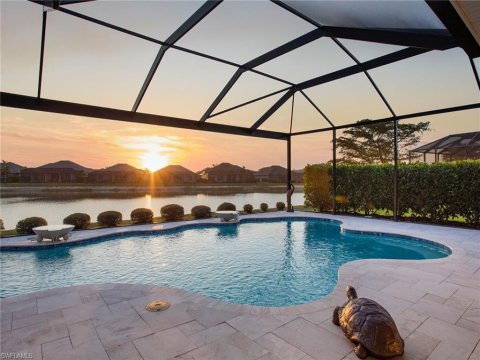 Canoe Landing Naples Reserve Naples Homes: Discover your tropical retreat in Naples Reserve's coveted Canoe Landing. This stunning Stock Development home sits on a beautifully landscaped corner lot and showcases over $220k in builder upgrades. Enjoy your own private paradise with an oversized resort-style pool (14 X 29) and spa (6 X 6), surrounded by botanical garden-style landscaping and breathtaking long lake sunset views. Additional highlights include: Storm smart screens, garage mini split system, plantation shutters, custom family room built-in with fireplace, custom closets, a coffee bar in walk-in pantry and overhead storage racks in the garage. All this is found within Naples' premier resort community, offering an exceptional lifestyle of beauty, privacy, and relaxation. *NO FLOOD INSURANCE REQUIRED-LOMR on record!