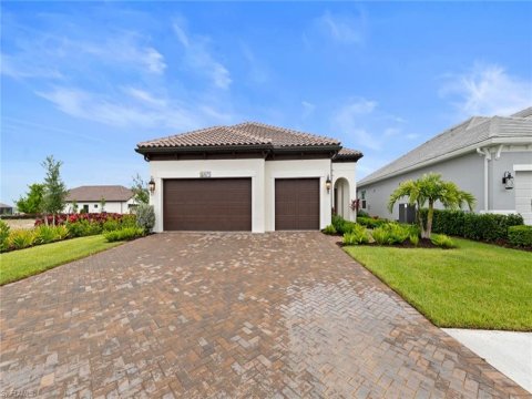 Skysail Naples Homes Under Contract: Ready Now! This brand-new Triumph single-family home by Neal Communities is available now in the highly desirable SkySail community, featuring a Northern Italian elevation. Situated on Lot 106, this beautifully upgraded 4-bedroom, 2.1-bath, 2-car garage home offers luxury, style, and functionality throughout. The open-concept design boasts a gourmet kitchen package with quartz countertops, GE stainless steel appliances, 42” upper cabinets with dovetail drawers and soft-close doors, designer-selected backsplash, roll-out shelves, and a spacious center island—perfect for entertaining. Elegant details like upgraded tile flooring throughout, coffered ceiling, 8-foot doors, and a pocket sliding glass door leading to the screened-in lanai elevate the living experience. Built with impact-resistant windows this home combines beauty and peace of mind. SkySail is a natural gas community with low HOA fees and a wealth of amenities, making it the perfect place to call home. Schedule your private showing today and experience the comfort and convenience this home has to offer! The images are not an exact representation of this feature home and the feature home will not be sold furnished, nor is an outdoor kitchen included. This home is being built on Homesite 106.