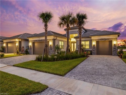 Valencia Trails Naples Homes for Sale: Former developer-owned, fully furnished and professionally decorated Sanddollar model, this turnkey residence has been hardly lived in and beautifully enhanced by the owner. Ideally on a lushly landscaped cul-de-sac within a former Parade of Homes enclave, the setting offers privacy and showcase appeal. New community in a no-flood zone. Beautiful open floor plan includes all furniture and accessories as seen, complete with upgrades galore by renowned builder/developer GL Homes is now available for sale in the 55-plus new, resort-style gated community, Valencia Trails. This former model is 2,469 square feet with two bedrooms plus den/optional third bedroom, 2.5 baths, extended/oversized and screened picturesque lanai with stunning private views of the preserve, and rear and side door entry leading to a beautiful multi-level custom pavers patio with romantic bougainvillea arbor, decorative chandelier and fire pit, all visible from front entry. Absolutely stunning and spacious open floor plan with soaring 14-foot entryway ceilings. Upgraded lighting, generous custom built-in closets, coffered ceilings, upgraded millwork and bath fixtures. Oversized dining area, and beautifully integrated custom wine bar/coffee station. Gorgeous contemporary kitchen features recessed lighting, upgraded appliances, oversized island and plenty of cabinetry. Reasonable dues, and no annual fees or membership. Dues include central station alarm system with a medical alert system, rubbish removal, landscape maintenance services and staffed main gate. Enjoy your new state-of-the-art clubhouse featuring a restaurant and bar, resort-style pool, lap pool, resistance pool, gym, live music, art classes, cooking classes, day spa, tennis, pickleball, group activities, numerous clubs, Broadway-style shows, trips, visiting farmers markets, vendor shopping, large and small dog parks, and miles of recreational/biking trails. Easy maintenance and luxury lifestyle, one of a kind. Enjoy your three clubhouse pools and let someone else handle the maintenance. Save the headache, hassle and thousands of dollars moving your furniture.