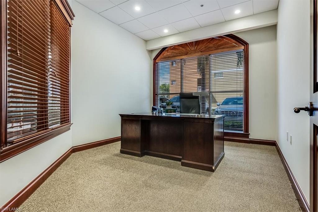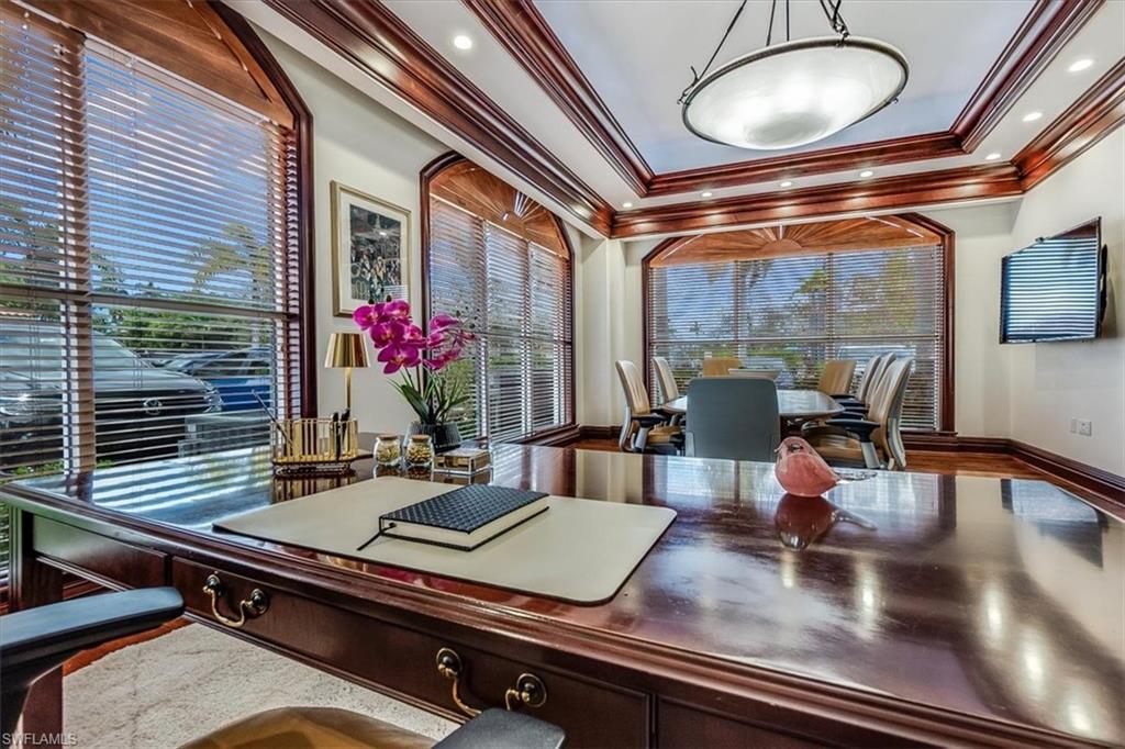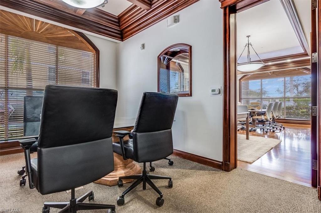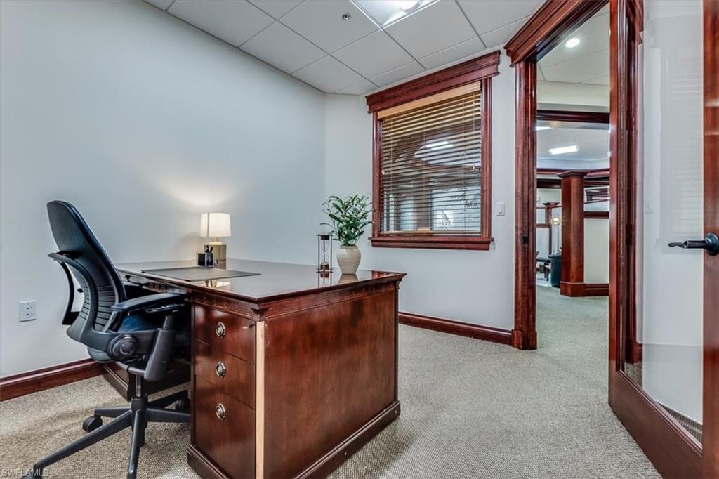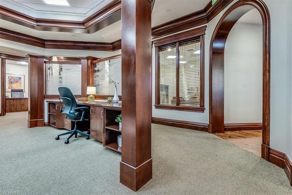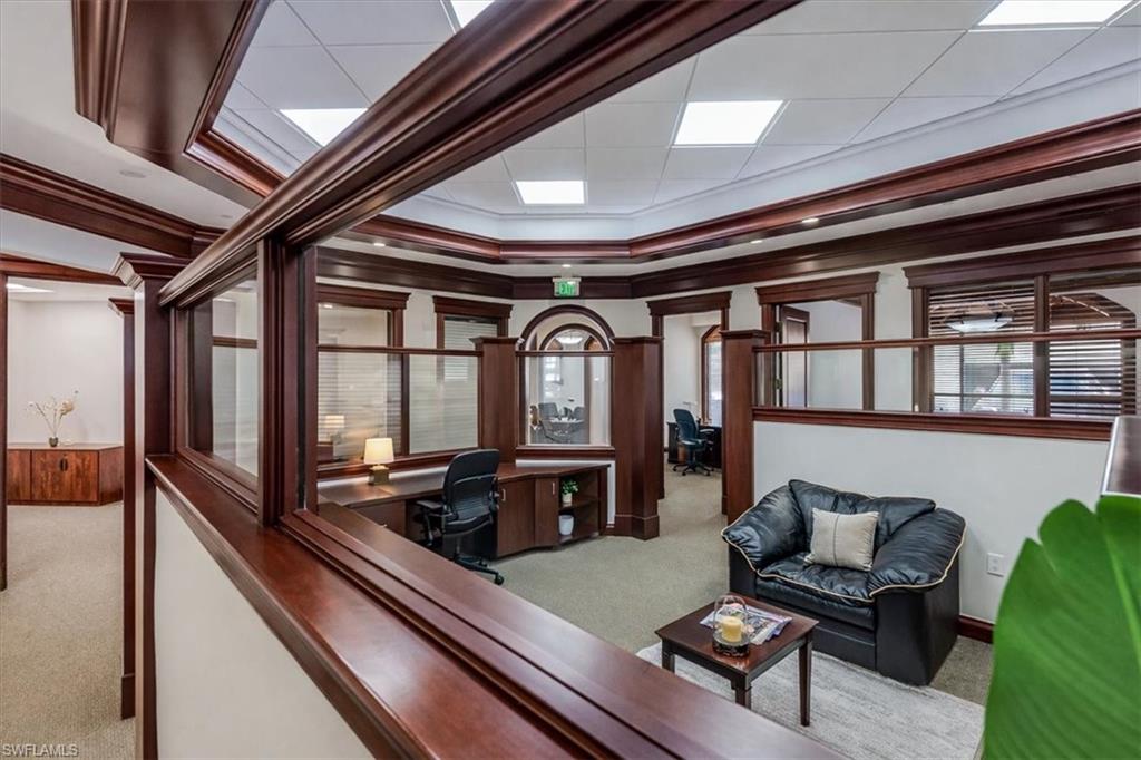 This sophisticated and character-rich executive office suite is a rare opportunity to acquire. Prestige address on US 41 near Downtown Naples. It features over 3000 square feet of thoughtfully designed layout including 10 large private offices, with two extra-large offices that can easily function as conference rooms or boardrooms, offering flexibility for meetings, presentations, and collaborative use. At the center of the suite is a flex collaboration lounge, ideal for team interaction, and overflow workspace. Additional amenities include a spacious and classy lobby, a kitchenette, and coffee bar, floor to ceiling windows, elegant crown molding and refined wood millwork, making it ideal for a distinguished and sophisticated workplace that reflects professionalism and success. This distinguished building has the perfect privacy/and exclusivity with a blend of well established tenants with little signage and a beautiful building lobby. A great fit for a family office, wealth management, boutique law/ CPA firms, Insurance companies, Business consultants. This space is also well-suited for an occupant who can utilize multiple private offices or Medical, health or Wellness without needing heavy daily traffic. There are 2 Deeded exclusive covered parking spaces and shared public parking for the building.