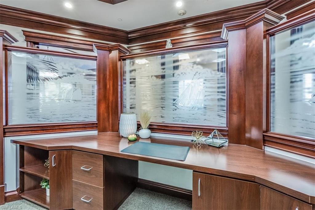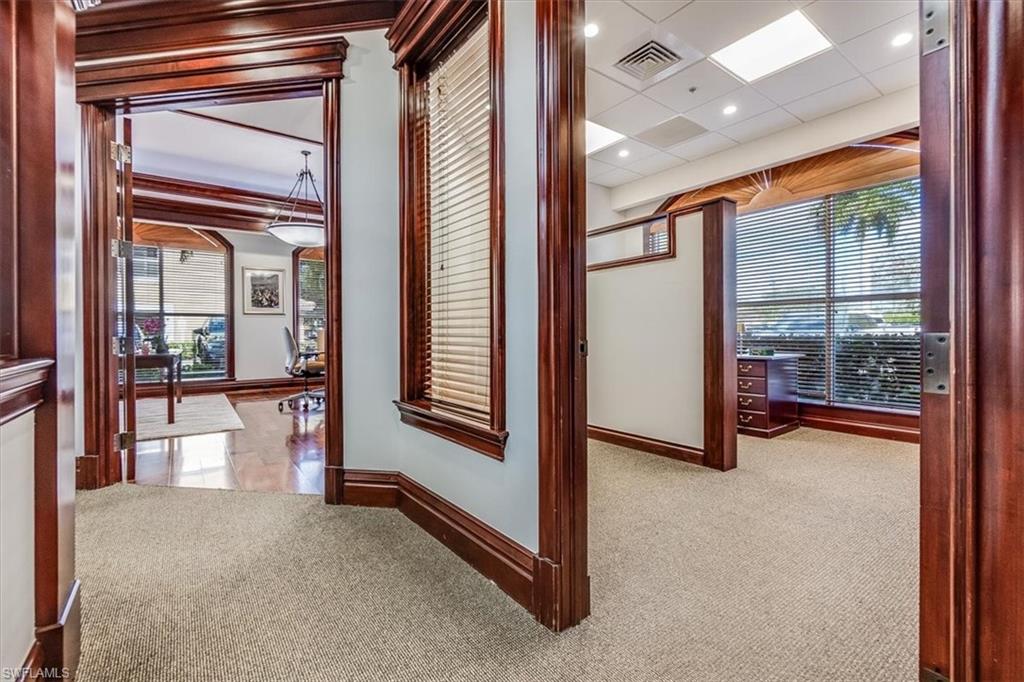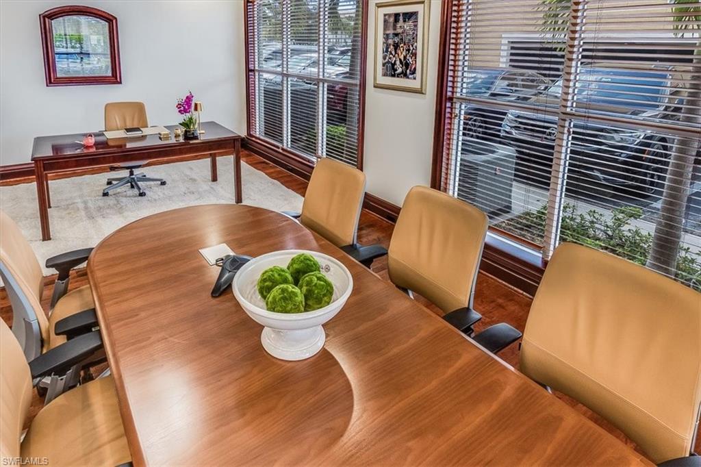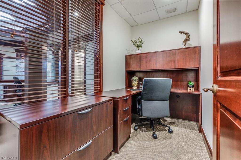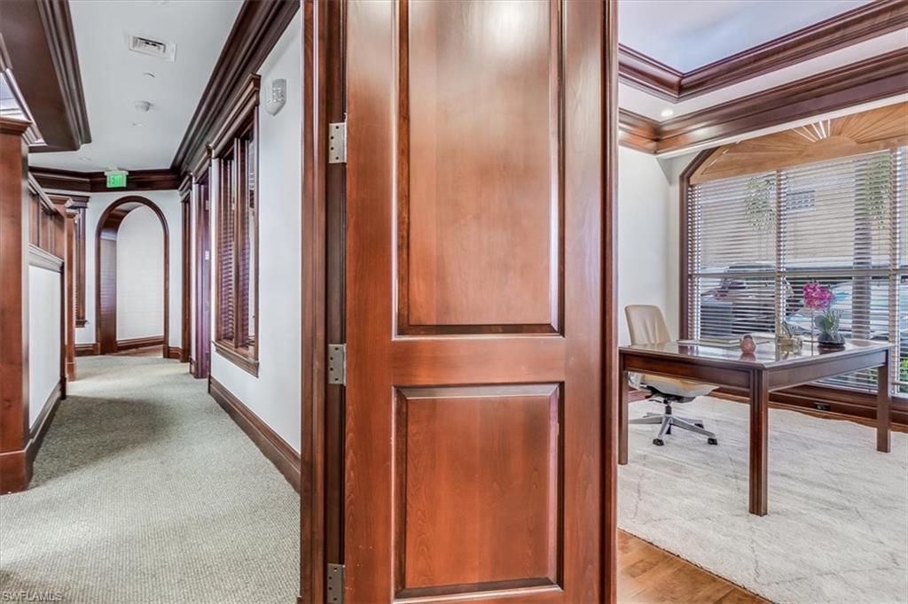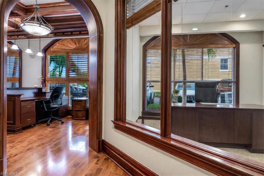 This sophisticated and character-rich executive office suite is a rare opportunity to acquire. Prestige address on US 41 near Downtown Naples. It features over 3000 square feet of thoughtfully designed layout including 10 large private offices, with two extra-large offices that can easily function as conference rooms or boardrooms, offering flexibility for meetings, presentations, and collaborative use. At the center of the suite is a flex collaboration lounge, ideal for team interaction, and overflow workspace. Additional amenities include a spacious and classy lobby, a kitchenette, and coffee bar, floor to ceiling windows, elegant crown molding and refined wood millwork, making it ideal for a distinguished and sophisticated workplace that reflects professionalism and success. This distinguished building has the perfect privacy/and exclusivity with a blend of well established tenants with little signage and a beautiful building lobby. A great fit for a family office, wealth management, boutique law/ CPA firms, Insurance companies, Business consultants. This space is also well-suited for an occupant who can utilize multiple private offices or Medical, health or Wellness without needing heavy daily traffic. There are 2 Deeded exclusive covered parking spaces and shared public parking for the building.