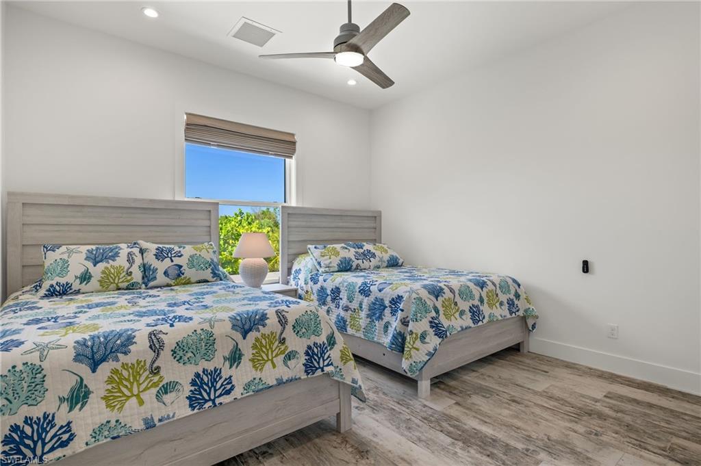 Built in 2021 with emphasis on high quality materials and a thoughtful floor plan, this beautiful Gulf access pool home features a metal roof, two story pool cage, all impact windows and doors, high ceilings, eight foot solid core wood doors, quartz countertops, custom wood cabinets, wood plank tile throughout, an interior staircase, front and back screened porches, and a heated salt water pool. It is situated on a double lot with Gulf access through Dinkins Bayou and offers an incredible setting that features native vegetation and abundant wildlife. Located along the bike path on the west end of the island, pulling out of the driveway you'll have immediate access to the miles of paths that extend from the lighthouse to Captiva. With Sanibel's spectacular Blind Pass Beach only a mile away and a Gulf access canal in the backyard, this property offers an ideal setting to enjoy exceptional island living.