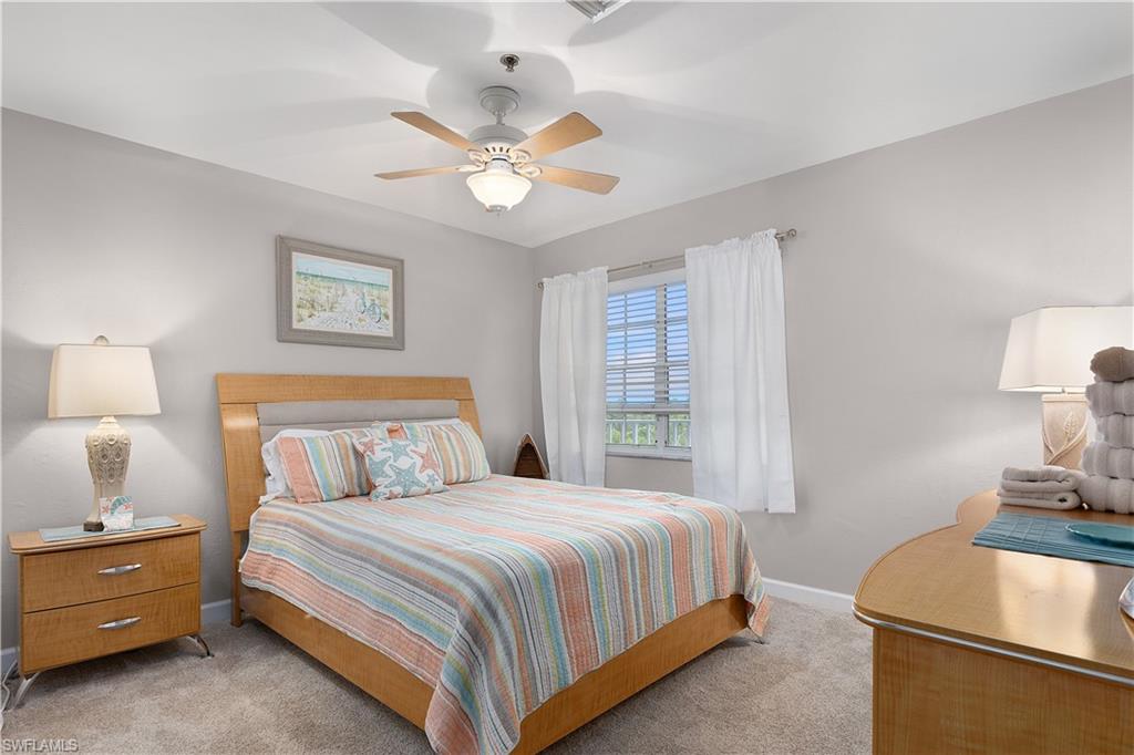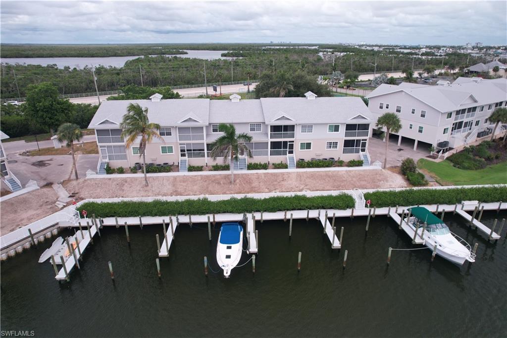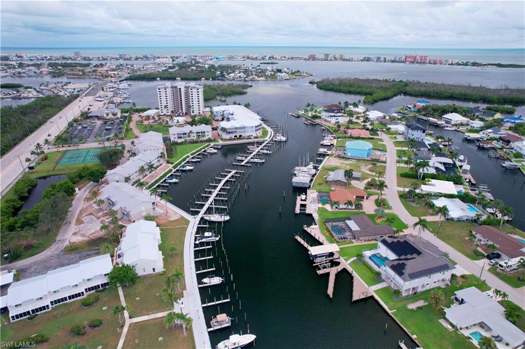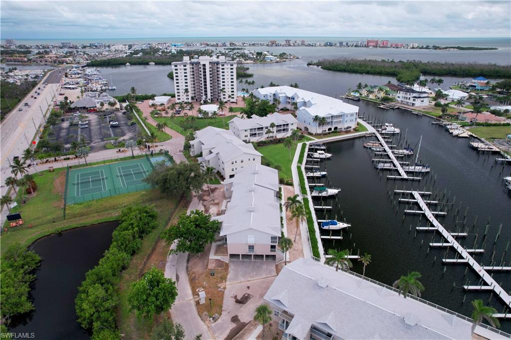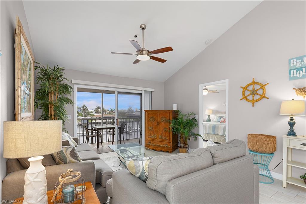 This is a boater's paradise! Unwind on your screened balcony/lanai, gazing over the marina and your boat in its DEEDED SLIP just below. A quick boat ride takes you to the Gulf and all the attractions of Fort Myers, Sanibel, Pine Island, and Cape Coral – endless exploration awaits! Or, bike or stroll just over a mile to Fort Myers Beach, Margaritaville, shops, and a wide array of restaurants. Pinchers restaurant is conveniently located next door. As an END UNIT, you'll enjoy abundant natural light from an extra slider and Juliet balcony. The top-floor location enhances this bright space with vaulted ceilings and Gulf breezes. Combined with the coastal decor, it creates an immediate vacation ambiance. The open and airy layout is perfect for entertaining. This fully turn key 3-bedroom, 2-full-bath unit features a beautiful kitchen with a snack bar and center island, open to the dining and family room with stunning views. The primary suite boasts a private bath with a large vanity, tiled shower with glass surround, and a spacious walk-in closet. A split bedroom design offers two additional bedrooms, a coastal bathroom, and in-unit laundry. Boardwalk Caper provides a wealth of community amenities, such as several swimming pools, tennis courts, shuffleboard, basketball/pickleball courts, and a marina. You'll also appreciate the private locked storage unit, deeded parking spot beneath the unit, available guest parking, and a community locked storage area in the adjacent building for extras like bikes. Tour this lovely condo and discover the joys of Florida living! Enjoy boating, swimming, nearby beaches, and relaxation!