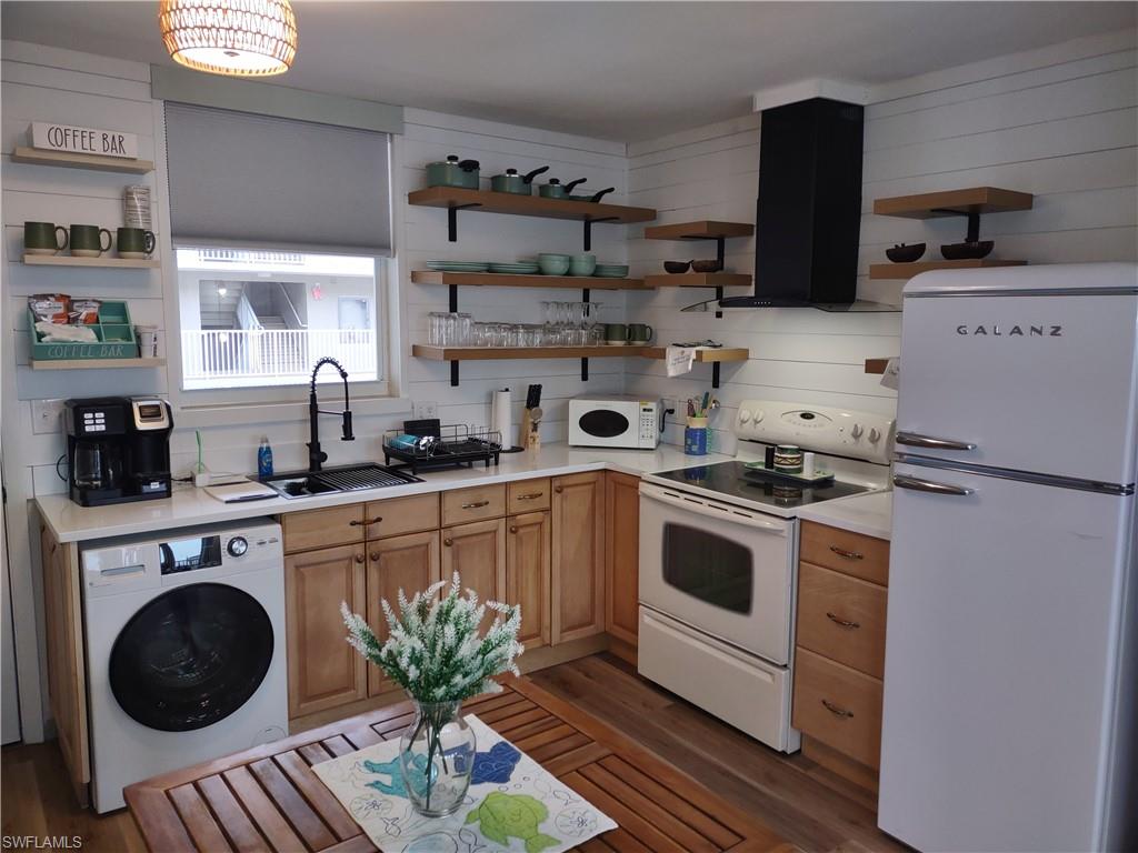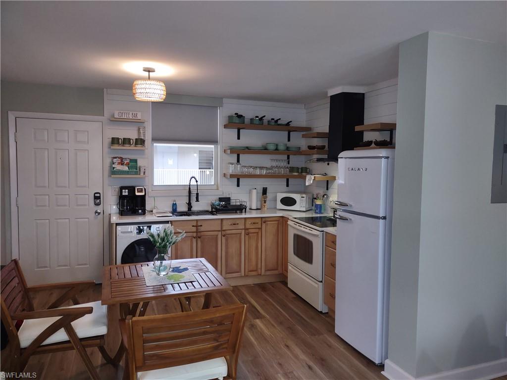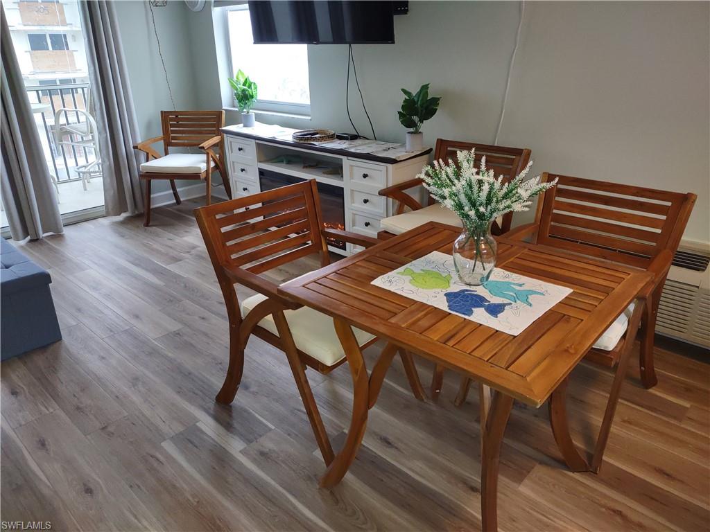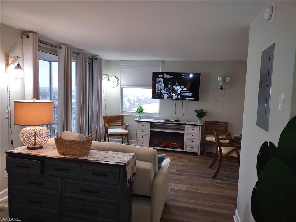Discover Your Coastal Paradise at Bonita Beach and Tennis Club - Completely renovated beachfront condo which includes a new break panel, new furniture, paint, flooring, new countertop, and patio sliding glass door and impact windows. Steps from Barefoot Beach. Beautiful sunsets, sunrises of beach & bay from new screened balcony. Fireplace for those cool nights or just for the ambiance. Retro Kitchen. King-sized adjustable bed/ premium bedding. Bath with upgraded tile shower. LR has pull-out full-size sofa with a 50-inch TV. 2 Heated Pools and Jacuzzi. One of the pools is accessible by wheelchair. Walk to Docs and Coconut Jacks' Restaurants. Jet ski and boat rentals across at the beach. This unit is a must-see unit. Call to today to set up your private showing.
