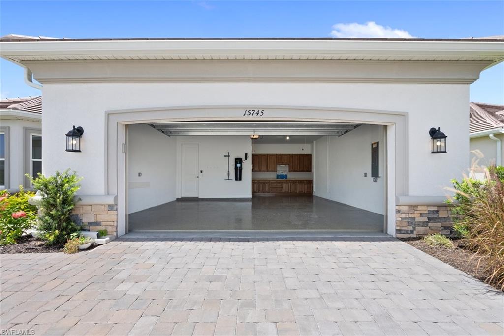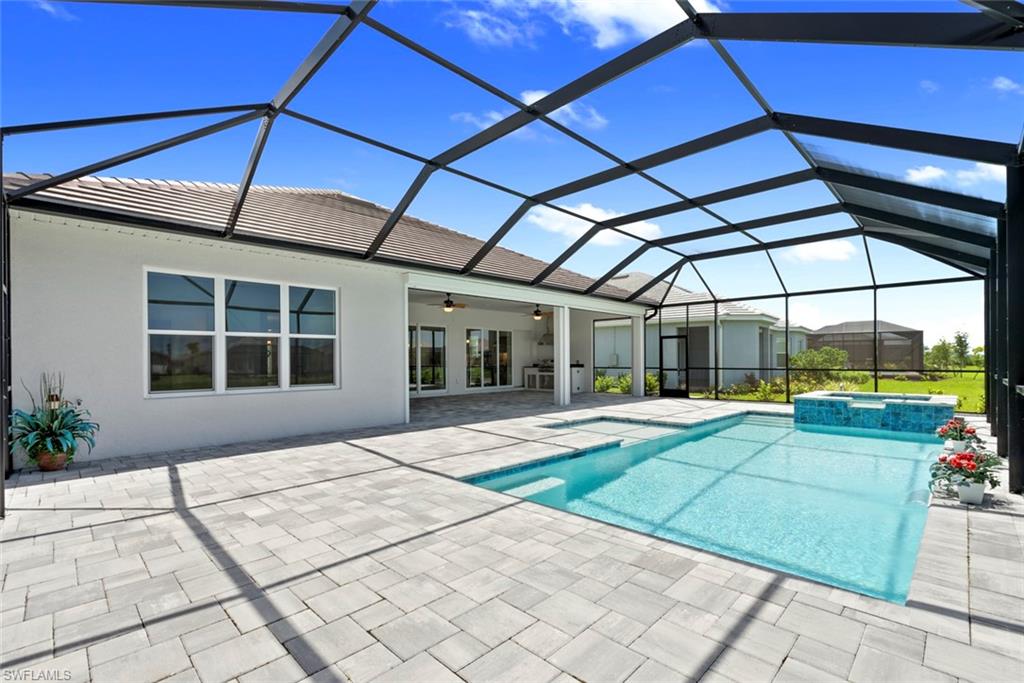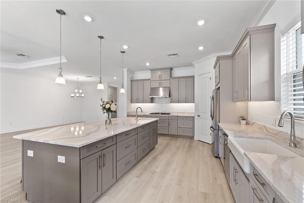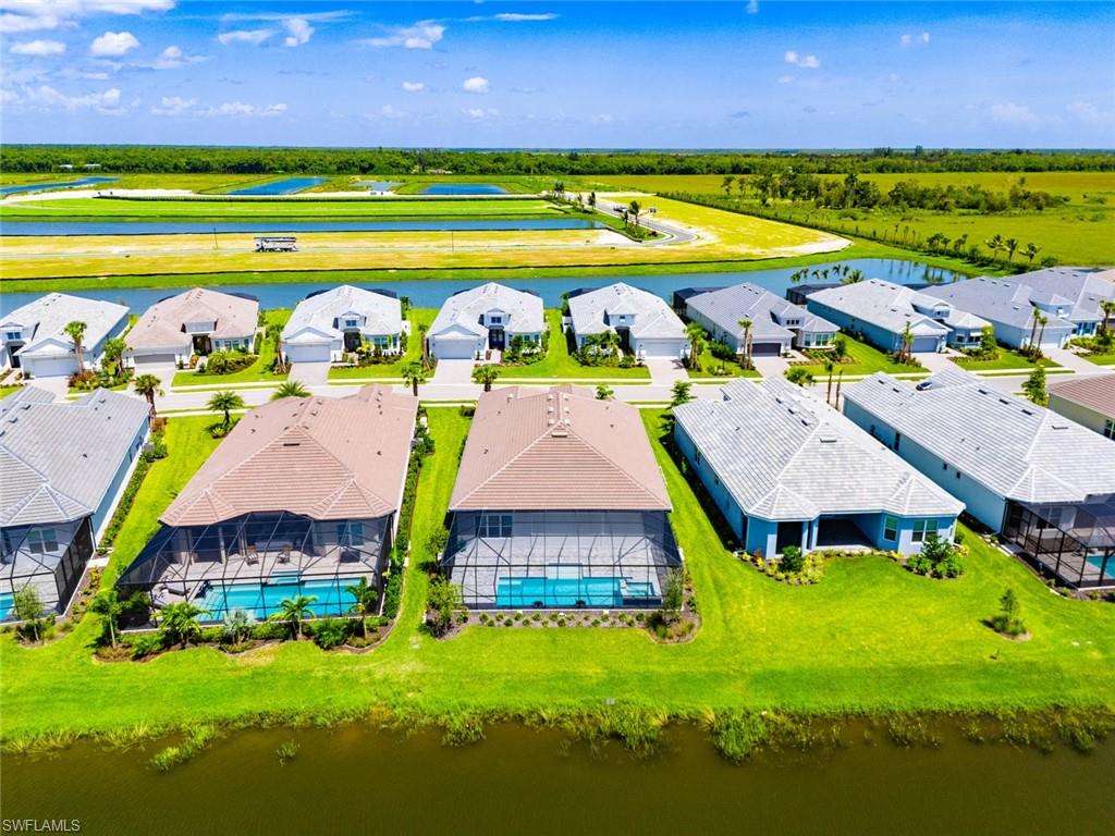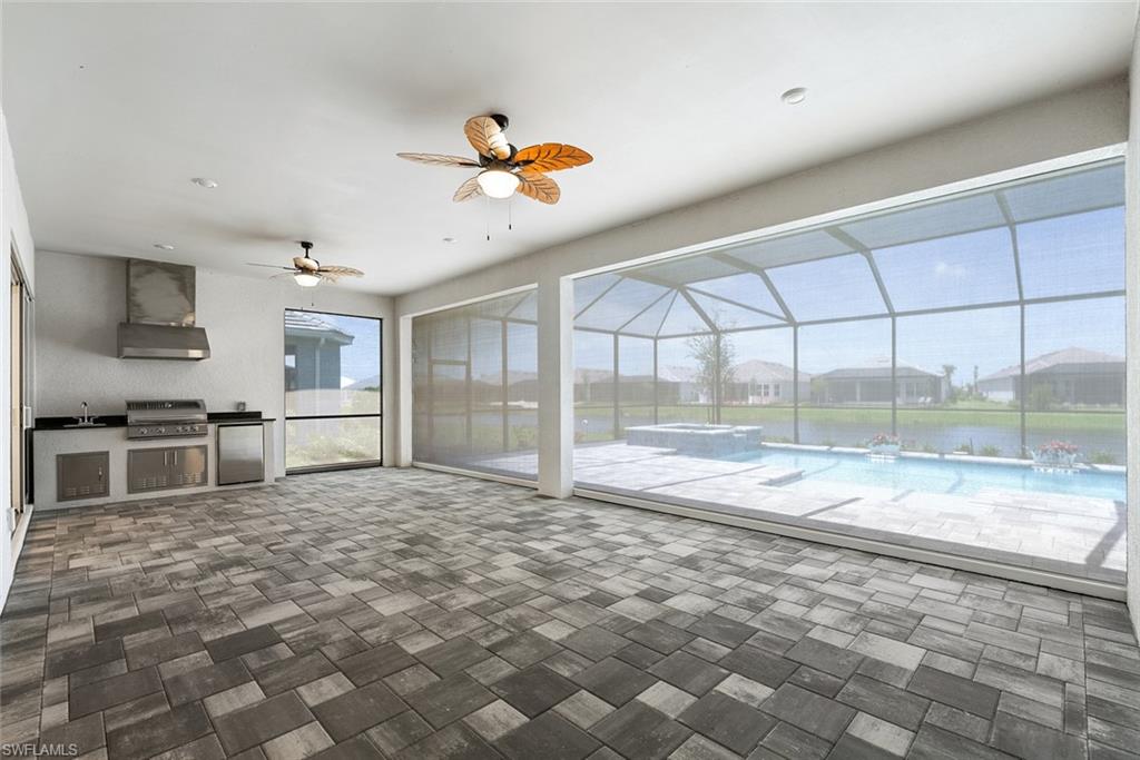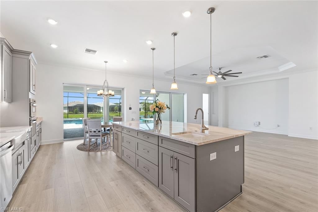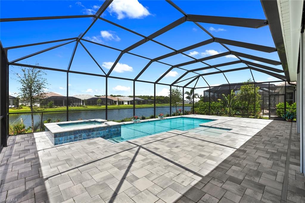 Discover luxury living and resort-style amenities in the highly sought-after gated community of Esplanade by the Islands. This recently completed Pallazio home 2024 is ideally situated on a quiet cul-de-sac and boasts 3,071 sq. ft. of elegant living space, featuring 3 spacious bedrooms, 3 full bathrooms, and a large den—designed to combine comfort, privacy, and flexibility. Enjoy breathtaking lakefront views with western exposure from your custom heated natural gas pool, complete with an extended deck, automatic pool filler, sun shelf, and electric hurricane shutters. The outdoor living space is further enhanced by a fully equipped outdoor kitchen with a natural gas grill, making it perfect for entertaining and everyday relaxation. Inside, the extended gourmet kitchen is a chef’s dream, featuring a natural gas cooktop, upgraded quartz countertops, under-cabinet lighting, soft-close cabinetry, abundant base cabinet storage, and an additional island counter sink. The open floor plan is finished with luxury vinyl floors, impact-rated doors and windows, tray ceilings with crown molding, and solid-core interior wood doors. Additional upgrades include a tankless natural gas water heater, central vac system, brand new washer and dryer, and stylish paddle fans throughout. The 2.5 tandem garage offers epoxy flooring, built-in cabinets with a work counter, and a pull-down stairway to attic storage, providing both functionality and style. Living in Esplanade by the Islands means access to world class amenities, including the Bahama Bar, full-service spa, infinity pool, tennis, pickleball, bocce ball, and more. Plus, an additional restaurant and state-of-the-art culinary center are currently under construction. With low HOA fees and a prime location just minutes to Marco Island and downtown Naples, this home truly offers it all. Don’t delay—get your slice of paradise today!