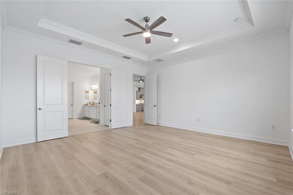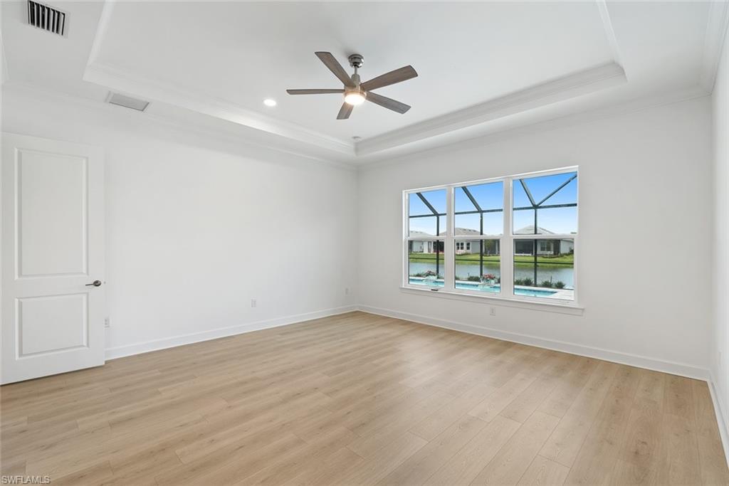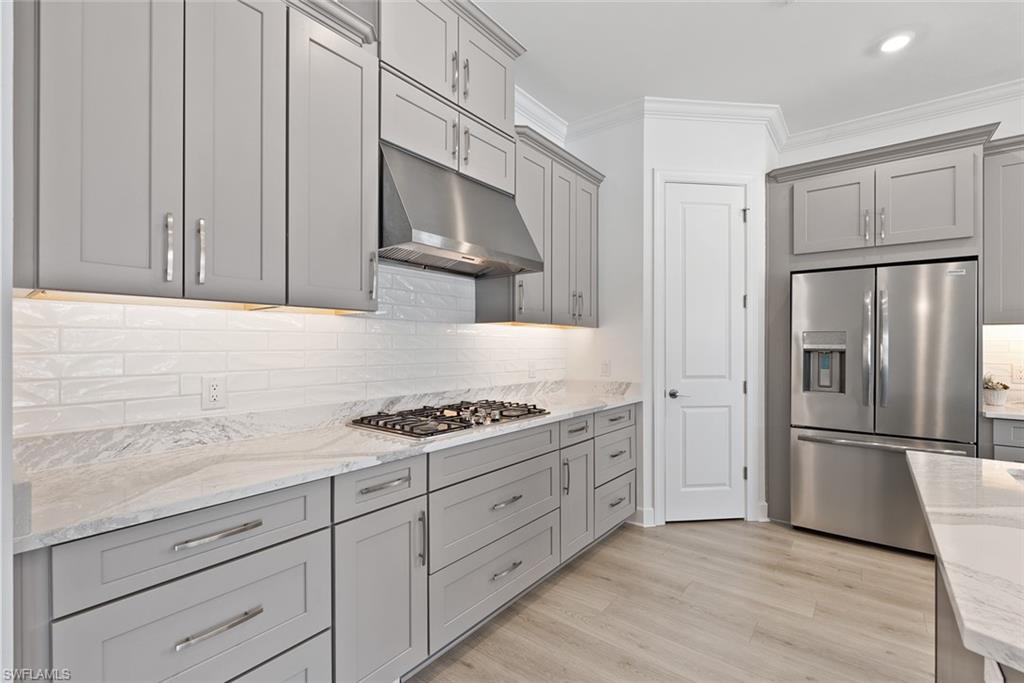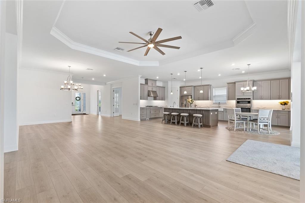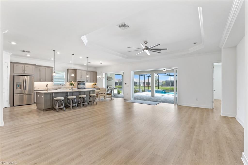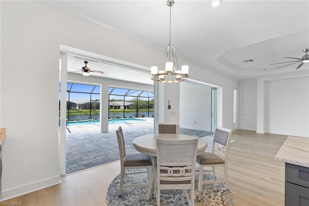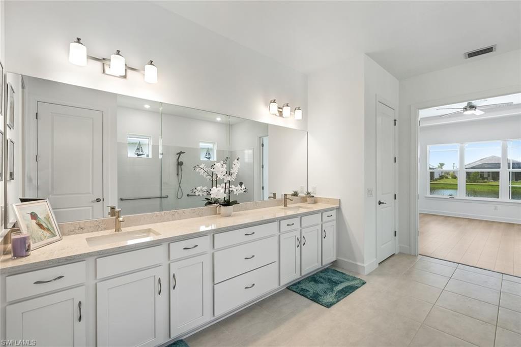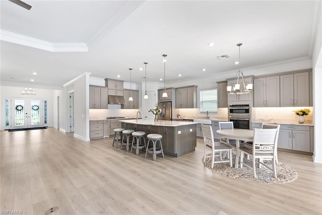 Discover luxury living and resort-style amenities in the highly sought-after gated community of Esplanade by the Islands. This recently completed Pallazio home 2024 is ideally situated on a quiet cul-de-sac and boasts 3,071 sq. ft. of elegant living space, featuring 3 spacious bedrooms, 3 full bathrooms, and a large den—designed to combine comfort, privacy, and flexibility. Enjoy breathtaking lakefront views with western exposure from your custom heated natural gas pool, complete with an extended deck, automatic pool filler, sun shelf, and electric hurricane shutters. The outdoor living space is further enhanced by a fully equipped outdoor kitchen with a natural gas grill, making it perfect for entertaining and everyday relaxation. Inside, the extended gourmet kitchen is a chef’s dream, featuring a natural gas cooktop, upgraded quartz countertops, under-cabinet lighting, soft-close cabinetry, abundant base cabinet storage, and an additional island counter sink. The open floor plan is finished with luxury vinyl floors, impact-rated doors and windows, tray ceilings with crown molding, and solid-core interior wood doors. Additional upgrades include a tankless natural gas water heater, central vac system, brand new washer and dryer, and stylish paddle fans throughout. The 2.5 tandem garage offers epoxy flooring, built-in cabinets with a work counter, and a pull-down stairway to attic storage, providing both functionality and style. Living in Esplanade by the Islands means access to world class amenities, including the Bahama Bar, full-service spa, infinity pool, tennis, pickleball, bocce ball, and more. Plus, an additional restaurant and state-of-the-art culinary center are currently under construction. With low HOA fees and a prime location just minutes to Marco Island and downtown Naples, this home truly offers it all. Don’t delay—get your slice of paradise today!