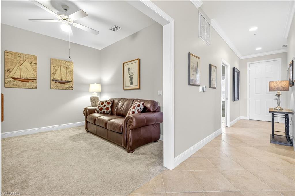 Make this exceptional condo your year-round or winter home. At approximately 1600 sq ft, this 2-bedroom with a den/flex room and open kitchen lives very comfortably! Located in Vasari Country Club, a bundled golf community, all residents have full year-round golf privileges included. Additionally, reciprocals are available in the summers and afford members the opportunity to golf at many other private clubs in the area. This condo has been very well cared for and is being sold turnkey/everything included. Two pools available: satellite pool with hot tub, loungers, umbrellas, restrooms, covered tables and chairs for cards, eating, etc. is just a two minute walk from this condo and the main pool is next to the Bistro where you can order food and beverages poolside. Vasari residents enjoy a beautiful 18-hole golf course, the "Bistro" outdoor bar and grill, indoor fine dining with veranda seating, an indoor bar, card rooms, 3 bocce courts, 6 tennis courts, a community pool and spa, a workout facility, and a plan for pickleball is in process. Vasari is conveniently located between Bonita Springs and North Naples. Just 5 miles due west to beautiful white sand beaches, sparkling waves, and gorgeous sunsets. Whether looking for great seafood restaurants, boat or ski jet rental, cultural activities, a day at the beach, great shopping, a beach bar, etc.....we have it all!