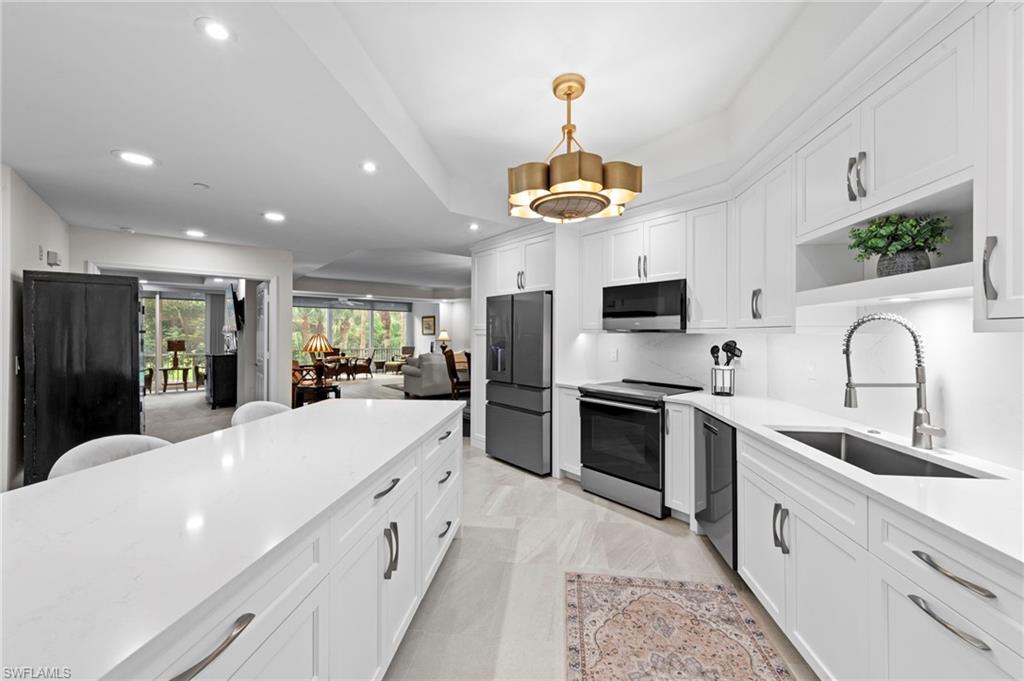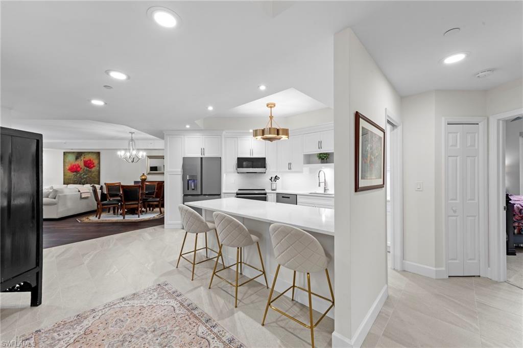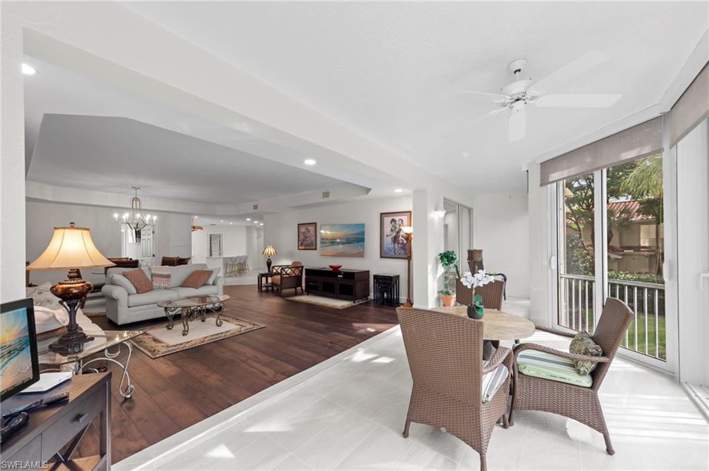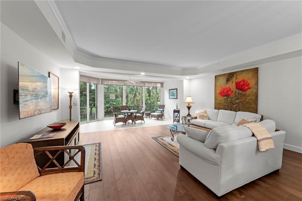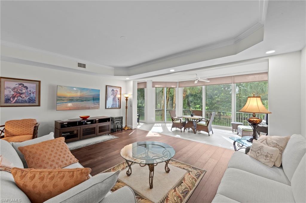 Welcome to this beautifully renovated condo at The Crescent in Pelican Bay, where modern upgrades meet the best of resort-style living in Naples. From the inviting entry you are drawn through the unit to the glass & screened enclosed sunroom offering tropical vistas over the garden areas and fairway. The redesigned kitchen shines with white cabinetry, quartz countertops, and premium stainless appliances, while new hardwood and tile floors flow seamlessly throughout. Expanded living areas with hurricane-rated doors add both space and security. The primary suite offers a relaxing retreat with a remodeled bath, quartz counters, updated shower and tub, and custom closets. Guests will feel right at home with spacious bedrooms, including one with its own ensuite. Recent updates like new A/C and hot water heater (2023) keep the home efficient and worry-free. The Crescent offers its own clubhouse, pool, spa, and fitness center, plus all the Pelican Bay perks—private beach access with beachfront dining, tennis, miles of walking and biking paths, with canoes and kayaks for residents. Just minutes to Waterside Shops and Mercato. This is the perfect blend of comfort, convenience, and Florida lifestyle in one of Naples’ most sought-after communities. The Crescent in Pelican Bay received no damage from last 3 hurricanes and no water intrusion in garage.