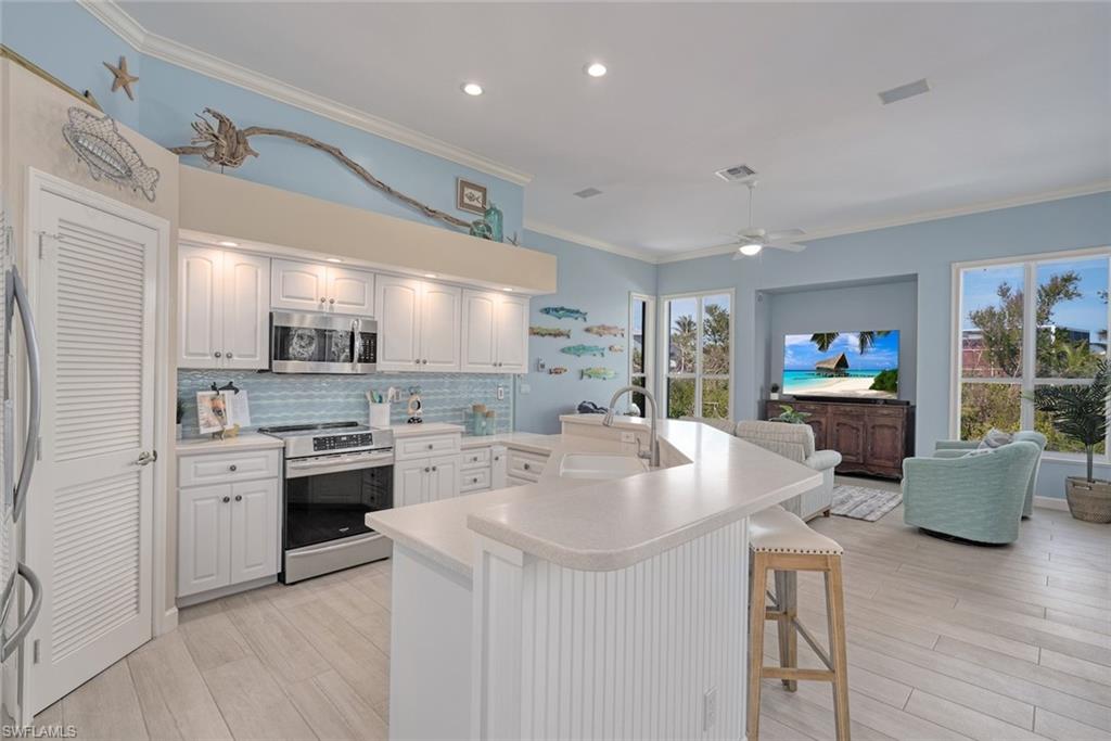 Boaters and beach lovers — this is THE ONE! Welcome to Your Tropical Retreat on Sanibel Island! $100K Price increase reflects the installation of all new Marvin impact windows and doors a homeowner cost of $142K! This stunning 3-bedroom + den, direct Gulf-access home offers the ultimate in island living. Located just minutes from the Bay and the Gulf of Mexico, your private composite wood boat dock with 7.0 K lb lift sets the stage for unforgettable days on the water — whether you're boating, fishing, shelling, or simply soaking in the serene beauty of Sanibel. Just steps from the beach, you can hear the waves from your front door, while your back deck offers front-row seats to Florida’s incredible wildlife — dolphins, manatees, nesting birds, and more. Perfectly positioned to capture breathtaking sunrise and sunset views, this home invites you to live in harmony with nature. Inside, you'll find a meticulously maintained and thoughtfully designed layout featuring soaring ceilings, plank tile flooring throughout, and abundant natural light. The spacious kitchen is a chef’s dream — complete with modern finishes, generous counter space, and a welcoming flow for entertaining. The primary suite is a luxurious sanctuary with ample closet space, a separate soaking tub, a custom glass walk-in shower, and gorgeous quartz countertops embedded with sea shells — a true coastal touch. Each of the three bedrooms includes walk-in closets for plenty of storage, while the den offers versatility as an office, gym, or easily a fourth bedroom. A 2-car attached garage provides plenty of space for vehicles and toys, and an expansive lower-level storage/workshop area is ideal for hobbies or stowing all your gear. Built solid with concrete construction and a newer metal tile roof (2022), this home is designed to weather the elements with ease. The Seller has already paid for premium Marvin Coastline impact windows and doors, scheduled for professional installation by Sanibel Glass on December 15th — delivering peace of mind and added value. Survey available that shows outline of pool. Located on Sanibel’s desirable west end, where “island time” begins, you’re steps from the beach, close to over 26 miles of bike paths, and just minutes from the restaurants and shops of Captiva Island. This is more than a home — it’s a lifestyle. Experience the very best of island living today.