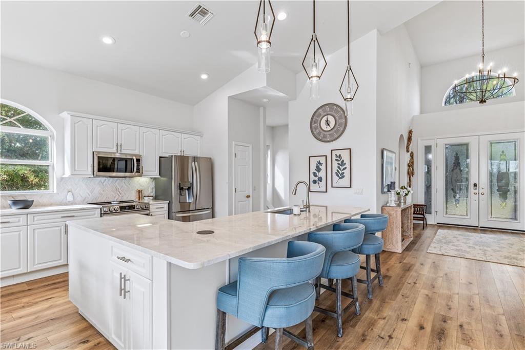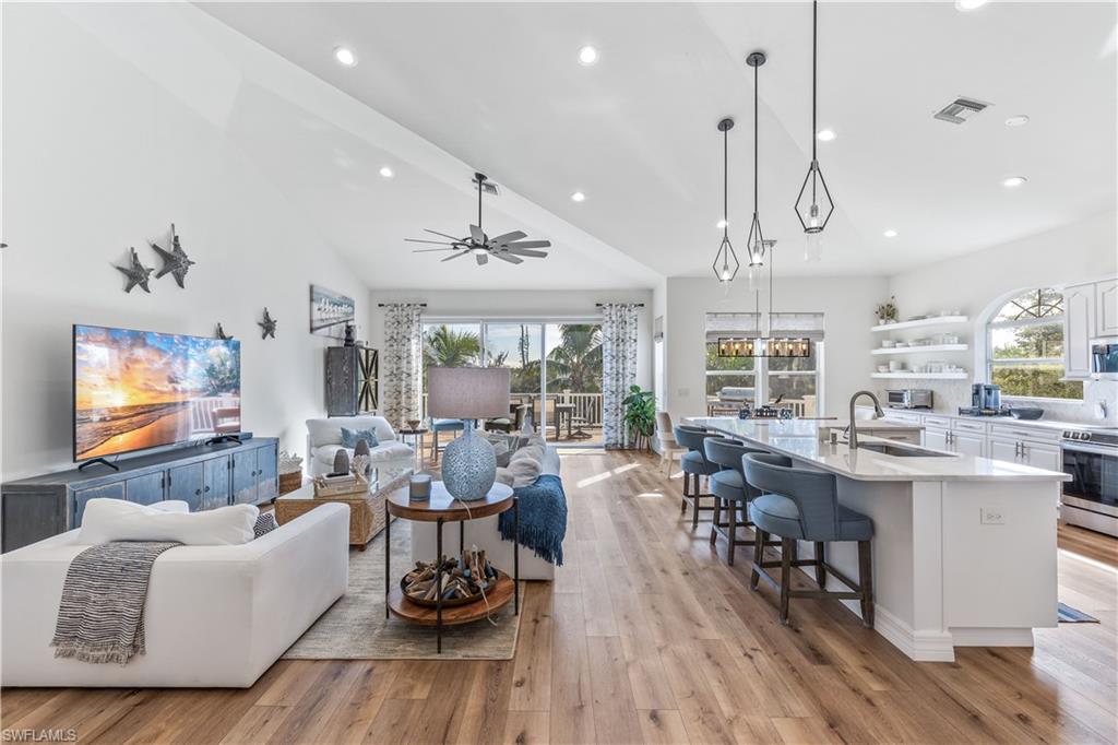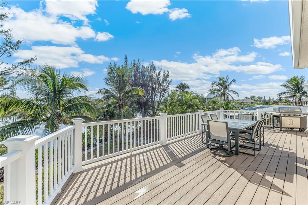Escape to paradise in this immaculate, Key West-style home, perfectly situated on Sanibel Island overlooking a beautiful freshwater lake. This 3-bedroom, 2-bath retreat offers the epitome of relaxed elegance in a convenient, central location. Step into an open, airy floor plan enhanced by the dramatic entrance featuring two nine-foot etched glass doors opening into a spacious foyer. Throughout the home, you'll find beautiful floors and luxurious interiors. The gorgeous, remodeled kitchen is a chef's dream, boasting a large entertainment island, crisp white cabinets, stainless steel appliances, and stunning white/grey quartzite countertops. Both the primary and guest bathrooms have also been tastefully remodeled. Entertaining or simply unwinding is easy on the spacious sun deck that overlooks the tranquil lake, ideal after a day of shelling or enjoying the beach life. This home is as practical as it is beautiful, featuring a metal roof, a convenient elevator, a double car garage, and a man cave/workshop with ample storage. For peace of mind, all windows and doors are hurricane-rated (non-impact to 120 mph wind load), ensuring the house remains bright and airy almost any time of day. Sold turnkey furnished with beautiful, high-end coastal furnishings (with some exceptions), this home shows like a dream and is ready for immediate enjoyment. Every detail, from the stylish furniture to the tasteful decor, has been carefully considered. This is your invitation to a tranquil island lifestyle, where thoughtful upgrades meet the laid-back beauty of coastal Florida. With close proximity to the beach, don't miss this opportunity to experience the ultimate island lifestyle. Schedule your tour today!