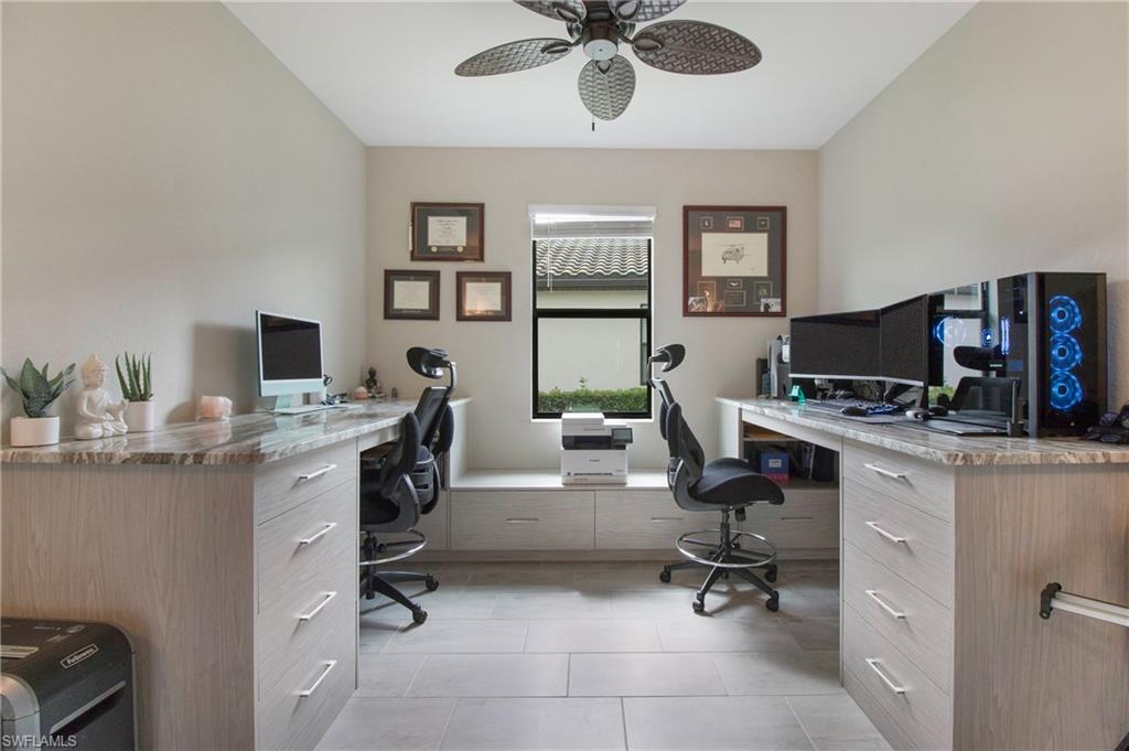 Step into refined resort-style living at The Place at Corkscrew! Your dream home awaits inside this prestigious gated community, offering an extraordinary lifestyle of sophistication, comfort, and Active Amenities! This elegant Summerville II model spans 2,445 sq. ft., presenting 3 spacious bedrooms plus den, 3 Baths, 3 Car Garage Pool and Spa with a Fenced backyard and SUNSET VIEWS! Featuring TWO Ensuites, a Primary ensuite and a second ensuite to ensure ultimate comfort! Furniture is negotiable! A front screened enclosure welcomes you with continuous plank tile flooring, where design meets functionality. The seamless open-concept floor plan flows from kitchen to living and dining, opening through 3 sliding doors to your private pool retreat! Relax beneath a generous covered lanai and expansive screened enclosure with multiple seating areas, perfect for entertaining or lounging around your heated SALTWATER pool and spa. At the heart of this home lies a gourmet chef’s kitchen with gleaming granite countertops, stainless steel appliances, white cabinetry (upgraded undermount and overmount LED lighting) with soft-close drawers, and a roomy walk-in pantry. A large island anchors the space, ideal for gatherings and conversations. The living room features a CUSTOM FULL-WALL STORAGE & SHELVING UNIT with LED lighting and matching granite. Nearby, a CUSTOM office inspires creativity or remote work, boasting soft-close cabinetry, 2 desk stations, and granite finishes. The luxurious primary suite is a true escape, enhanced by a designer feature wall, offering a spa-like ensuite bath with dual sinks, a spacious shower, and a brand NEW custom frameless glass door. The thoughtful split layout ensures guest privacy. Outdoors, your backyard oasis is complete with a saltwater heated pool and spa, expansive covered lanai leading to the rear screen door to the fenced yard—ideal for pets! Custom CURBED LANDSCAPING and landscape up-lighting enhances the curb appeal beautifully. Upgrades include a SIX CAMERA MULTI-VIEW from ANYWHERE SECURITY SYSTEM, WHOLE-HOME WATER FILTRATION system, REVERSE OSMOSIS, a 500-gallon buried propane tank, and automatic Briggs & Stratton GENERATOR for peace of mind, plus fiber optic connectivity with backup power. At The Place, AMENITIES ABOUND: a resort-style zero-entry pool with 100’ water slide, Bourbon bar, café, restaurant, 2-story fitness center, tennis, pickleball, bocce, basketball, dog park, volleyball, and a covered children’s play area. With sidewalks on EVERY street The Place is ideal for runners, walkers, pet owners, and safety! So invite all of your friends over for Pickleball, walk to Yappy Hour and take a swim in the pool with an extra large driveway where they can all park. Your new home will be the ideal gathering spot! All within minutes to RSW Airport, Coconut Point, Miromar Outlets, and Gulf beaches! Don’t miss the chance to own this thoughtfully upgraded pool home—luxury, leisure, and location await!