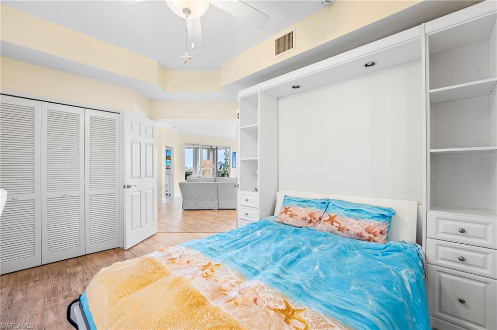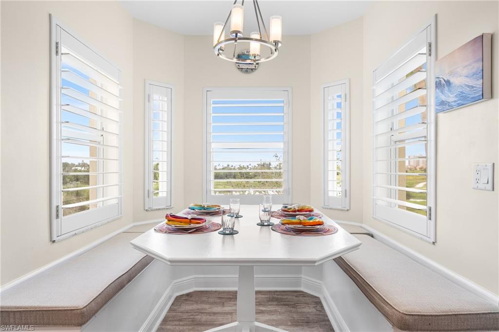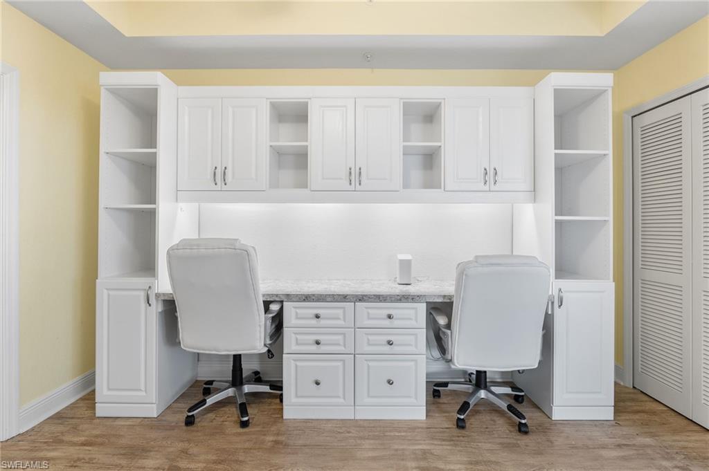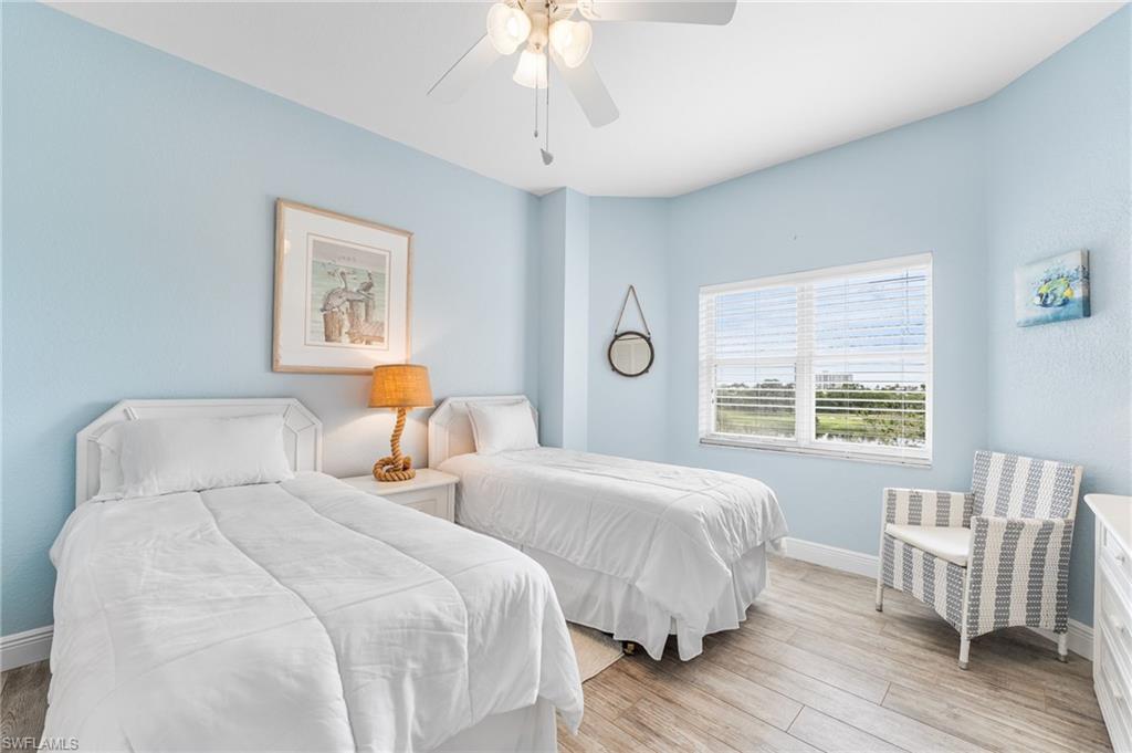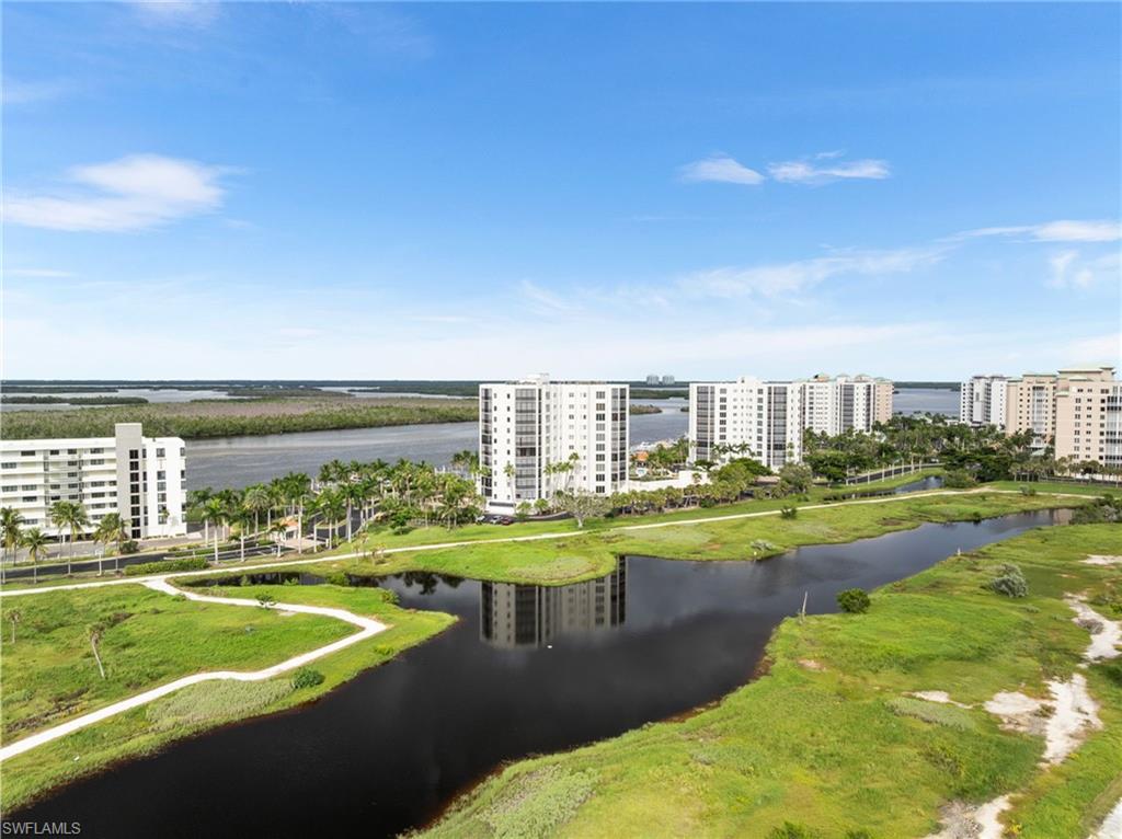 Beautiful Waterside 3 bed, 3 bath condominium that has a panoramic view of a large green nature preserve with lots of bird life and a skyline of beachfront condo on the Gulf of Mexico. You can enjoying sitting on the lanai watching the winter sunset skies and a bright natural ambience! This property is being offered turnkey furnished with tasteful modern furnishings! The kitchen has soft touch cabinetry and beautiful polished granite countertops. The large bay windows are tinted to keep the heat out and no need for curtains. The third bedroom has a queen size murphy bed and built in office space for two! It's the perfect office and spare bedroom. You have storage outside by the packing space and on the 2nd floor for easy convenience. You have one assigned covered parking space. Social room and exercise room are on the first floor. There are also guest suites on the first floor available to rent if the three bedrooms are not enough to handle guests or family. Waterside 1 is the first building as you go through the Guard Gate AC 2025 Electric panel 2024