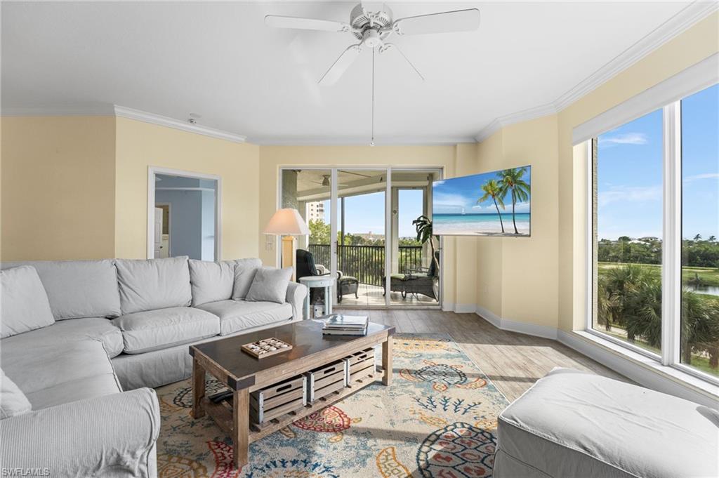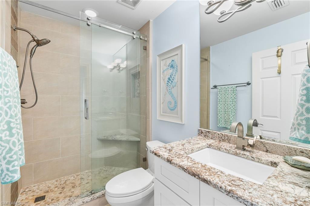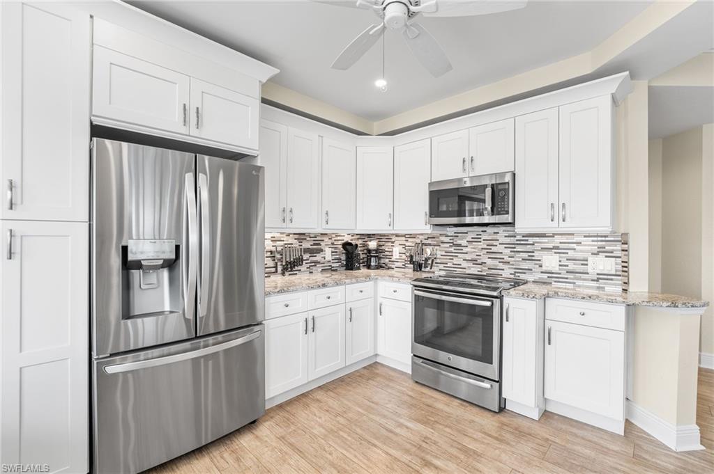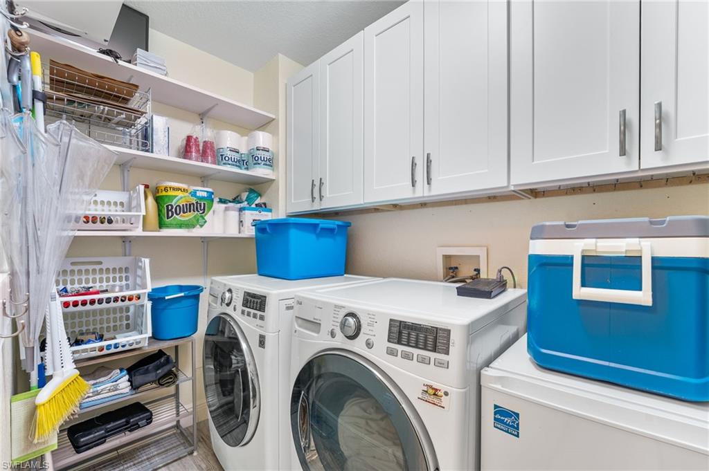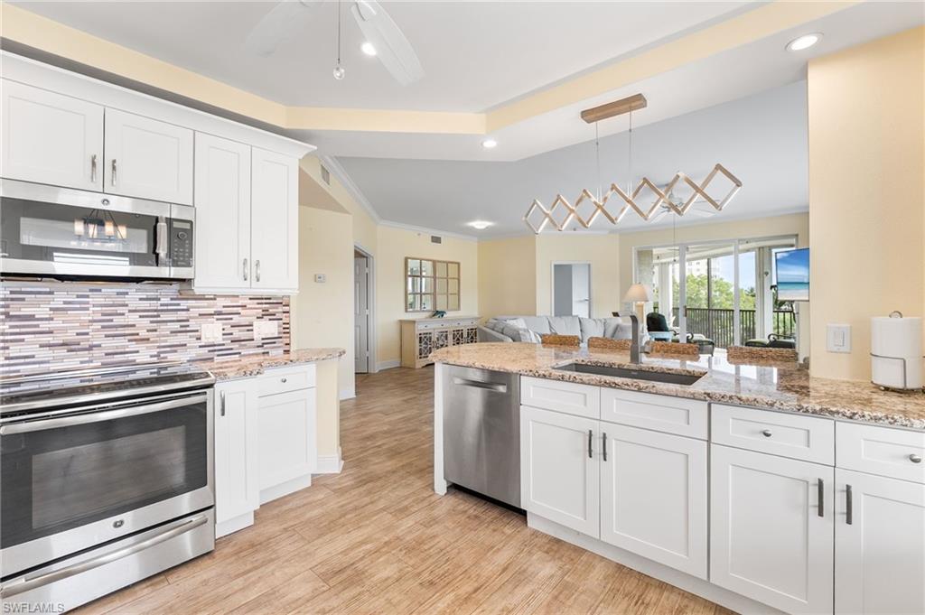 Beautiful Waterside 3 bed, 3 bath condominium that has a panoramic view of a large green nature preserve with lots of bird life and a skyline of beachfront condo on the Gulf of Mexico. You can enjoying sitting on the lanai watching the winter sunset skies and a bright natural ambience! This property is being offered turnkey furnished with tasteful modern furnishings! The kitchen has soft touch cabinetry and beautiful polished granite countertops. The large bay windows are tinted to keep the heat out and no need for curtains. The third bedroom has a queen size murphy bed and built in office space for two! It's the perfect office and spare bedroom. You have storage outside by the packing space and on the 2nd floor for easy convenience. You have one assigned covered parking space. Social room and exercise room are on the first floor. There are also guest suites on the first floor available to rent if the three bedrooms are not enough to handle guests or family. Waterside 1 is the first building as you go through the Guard Gate AC 2025 Electric panel 2024
