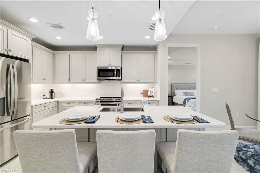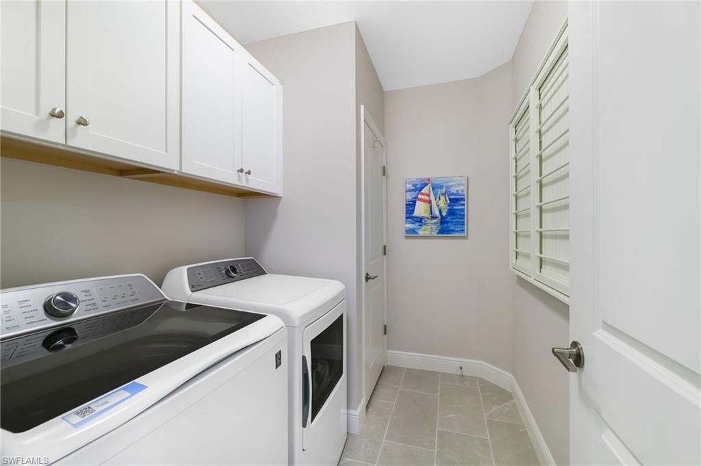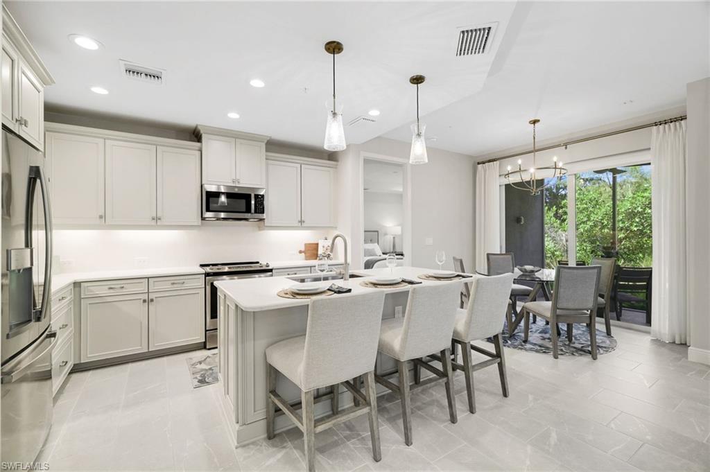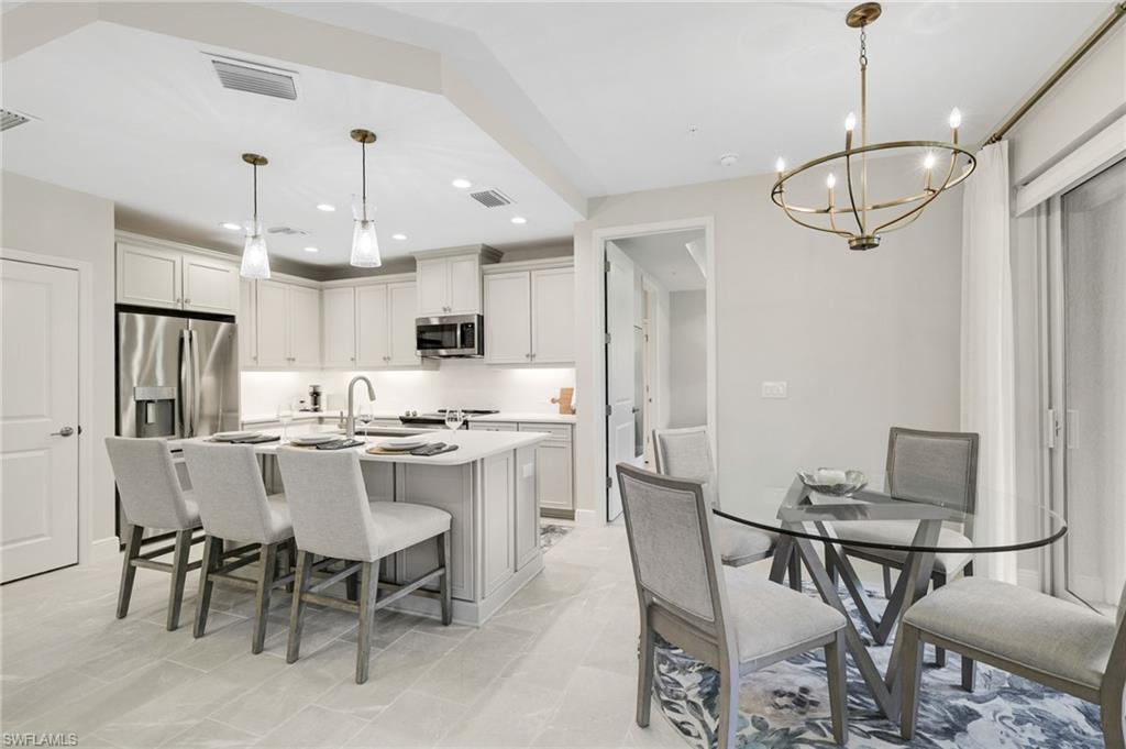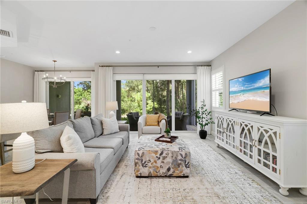Welcome to this IMMACULATE and beautifully maintained first-floor PRESERVE view carriage home in the desirable Seychelles community of Naples. Built in 2023, this stunning 2-bedroom, 2-bathroom end-unit Keswick model offers comfortable, stair-free living in a serene and private setting. The home features modern finishes throughout and an attached 1-car garage with epoxy flooring, blending style and functionality. The resort-style gated community features a heated tropical pool and spa, a fully equipped fitness center, a beautifully appointed community room, a firepit, and a gas grill—perfect for social gatherings. Ideally located just minutes from downtown Naples’ renowned restaurants and shops, white sand beaches of Naples and Marco Island, and the world-famous US Open Pickleball courts. This home offers true maintenance-free living, with the HOA covering cable, internet, building insurance and maintenance, landscaping, pest control, gated entry, and full access to all clubhouse amenities. The kitchen features quartz countertops with a breakfast bar, under-cabinet lighting, stylish pendant lights, soft neutral painted cabinetry, stainless steel appliances, and a convenient pantry closet. Adjacent to the kitchen is an inviting dining area, highlighted by a modern chandelier and direct access to the private, peaceful lanai overlooking the CONSERVATION PRESERVE where you can relax, listen to birds, and watch the wildlife inside the 20/20 screens. The lanai is also accessible from the living room through a wall of impact-rated sliding glass doors. The bright and airy living room offers recessed lighting and windows that fill the space with natural light, complemented by custom draperies, plantation shutters, and Hunter Douglas blinds. The spacious primary bedroom features elegant tray ceilings, plush carpeting, an oversized walk-in closet, and a private en-suite ¾ bathroom complete with a double vanity, frameless tile shower, and a separate water closet for added privacy. The second bedroom also offers carpeting, recessed lighting, and generous closet space. It is conveniently located just steps from a full bathroom with a single vanity and a tub/shower combo, as well as the adjacent laundry room, which is equipped with overhead cabinetry for added storage and organization. **Don't forget to watch the video of this stunning resort-style home in a prime Naples location.