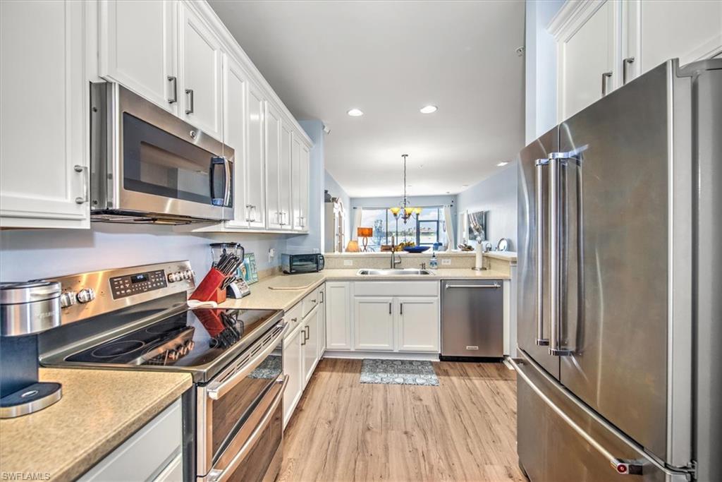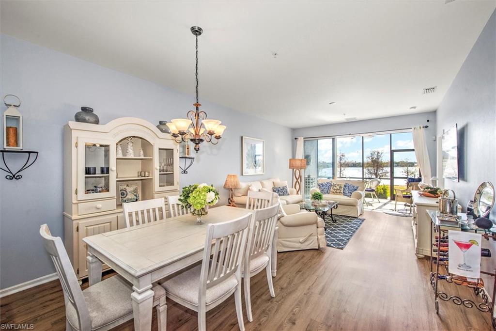 Immaculate LAKE front condo sold FULLY FURNISHED and TURNKEY with an elegant coastal vibe. GOLF MEMBERSHIP included (bundled) and enjoy the wide lake views and birdlife from the south facing screened lanai. Upgrades include luxury vinyl plank flooring throughout, HVAC (AC) 2022, New Water Heater 2024, Stainless appliances 2021 incl dual drawer oven; Washer/Dryer 2023; kitchen cabinets professionally painted and glazed; large square sink in kitchen; new vanities in bathrooms; new lighting and new glass shower door. Large screened balcony with travertine flooring. IMPACT DOORS AND WINDOWS! Open concept floor plan showcases the lake views. Spacious primary bedroom overlooks the lake and features his and hers walk-in-closets. Split bedroom floor plan allows for extra privacy. Plus there is a bonus room for a den or office. 2 deeded parking spots - one is a covered carport - and there is lots of guest parking! The property makes a great year round or seasonal residence. Flexible lease terms (30 days min) and 6 times per year make it a suitable investment property too. The community features an 18-hole championship golf course, Aqua Driving Range, and an extensive golf practice area; tennis and bocce courts; and fully equipped fitness center. The recently renovated clubhouse is the heart of the community, offering a delightful restaurant, a poolside bar, and a resort-style swimming pool. Enjoy the vibrant lifestyle that Vasari Country Club offers, conveniently located west of I-75 for easy access to shopping, dining, and the beautiful beaches of Bonita Springs.