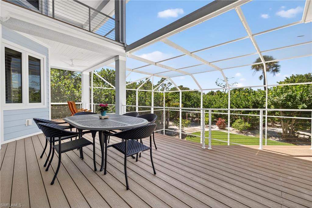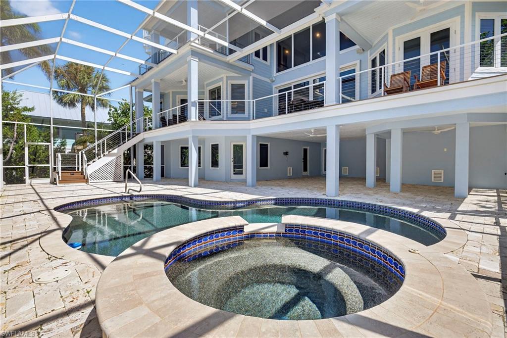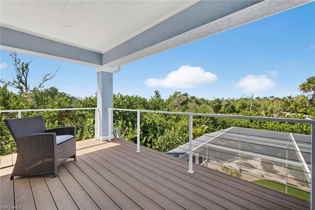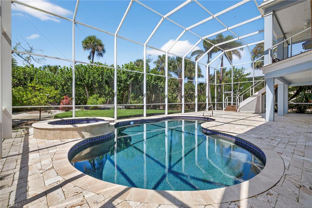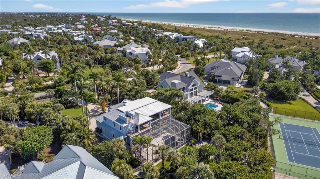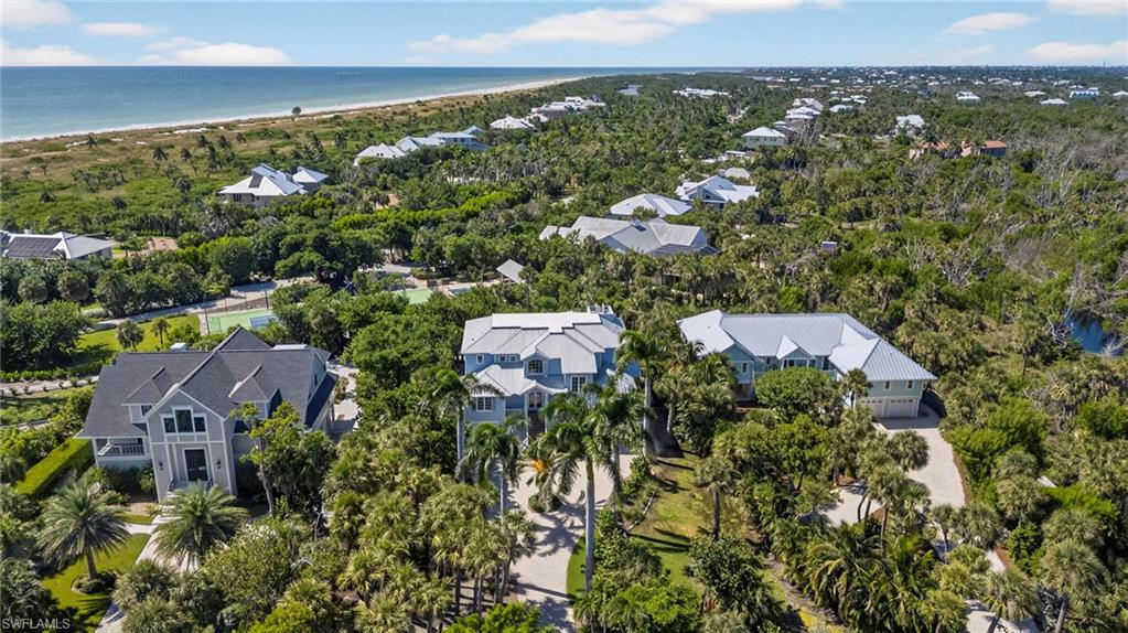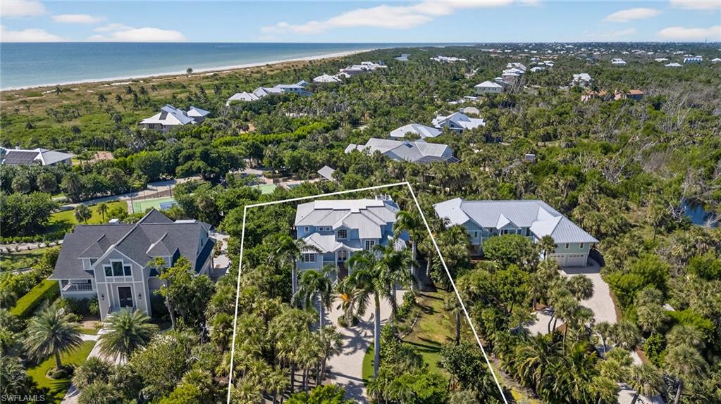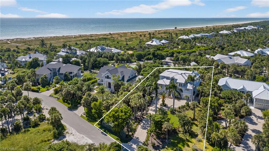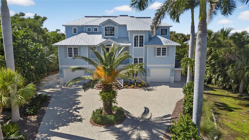 Tucked in the exclusive enclave of Seaspray, this exquisite residence embodies a balance of modern coastal luxury and timeless island charm. Just three lots from Sanibel’s famed, award-winning beaches, the home is so close to the Gulf you can hear the rhythmic surf and the call of seagulls and eagles overhead, all while being only a short distance from sun-soaked days on the sand. Built in 2011, the home offers peace of mind with stalwart construction, impact-rated doors and windows, and materials designed to endure, from durable Hardie board siding and composite decking to sleek aluminum railings and a metal roof. Inside, more than 3,550 square feet of inspired living space unfolds in light-filled elegance. A soaring great room with two-story ceilings showcases inlaid wood and accent beams, while a dramatic gallery walkway overlooks the space, adding architectural intrigue. Gleaming wood floors lead to an open-concept kitchen where light-toned cabinetry, a shimmering glass tile backsplash, and stainless-steel appliances create a fresh, inviting atmosphere ideal for family dinners or an evening of entertaining. With four spacious bedrooms, four full baths (all en suite) and a powder room, the home was designed for grand entertaining and private retreats. Expansive decks extend from every level, while a rooftop sundeck crowns the residence with sweeping wraparound Gulf views—an extraordinary vantage point for fiery sunsets and starlit evenings. Outdoors, the resort-style pool and spa are framed by a generous paver deck and protected within a two-story screen enclosure, with elevated pool equipment. For effortless convenience, an interior staircase connects the home’s main levels to dual garages and an enclosed lower level, all set on an impressive 0.57-acre lot. An elevator shaft is designed into the home making the addition of a residential elevator almost effortless. Every detail, from the composite finishes to the timeless architectural lines, was crafted to enhance beauty and resilience. In Seaspray—a private beachfront community along Sanibel-Captiva Road—this home offers not only luxury but also a lifestyle defined by serenity, exclusivity and direct connection to the sea.