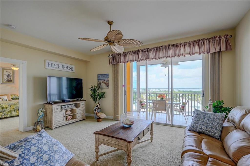 Catch all the waterfront action from this turnkey furnished CORNER, PENTHOUSE (6th floor) Casa Marina condo with UNDER-BUILDING PARKING! Estero Bay and main/intersecting canal views. Watch for dolphins and manatees and be entertained by the boating parade. Details: • 2 bedroom / 2 bath, 1200+ sq. ft.; corner penthouse unit • Large under-building parking space • Southern, eastern and northern exposure • Crown molding & fluted door casings; 5 ½” baseboard trim; granite window sills • Kitchen: stainless steel appliances; granite countertops; tiled backsplashews; 2-tier crown lighted tray ceiling; updated cabinetry • Spacious owner’s suite with updated 3-piece bath, walk-in closet and private lanai access • Updated guest bath • A/C condenser and air handler replaced March, 2024 • Washer & dryer replaced in 2023 • Lanai runs length of unit and has electric shutters • Manual shutters on windows • Amenities: community pool, deeded beach access, fishing pier and Bay Beach Commons (pickleball, tennis and bocce ball courts; putting and chipping greens; paths). • 14 day rentals allowed (minimum) • Pet friendly • Quick access to Bonita Springs/Naples shopping, restaurants and entertainment Casa Marina Yacht Club dock 15/16 available as optional purchase.