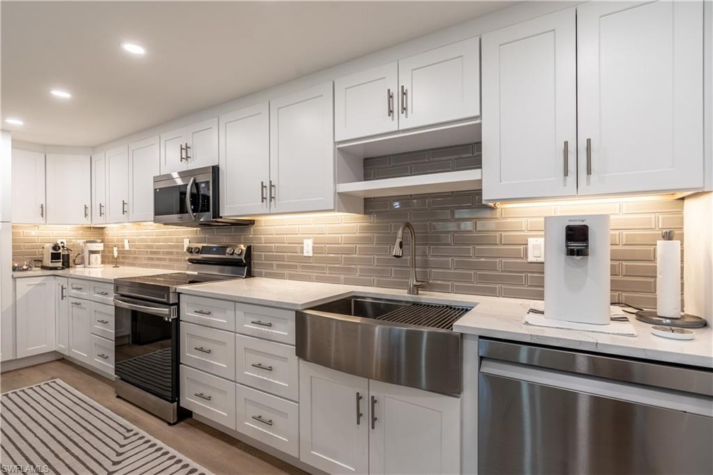 Experience coastal luxury at its finest in this beautifully renovated 2-bedroom, 2-bath condo, perfectly situated in one of Old Naples’ most coveted neighborhoods. Just moments from pristine Gulf beaches, 5th Avenue South dining, boutique shopping, and world-class entertainment, this residence blends modern elegance with timeless Naples charm. Step inside to discover a bright, open-concept floor plan featuring brand-new luxury finishes throughout. The gourmet kitchen showcases custom cabinetry, quartz countertops, stainless-steel appliances, and a spacious island ideal for entertaining. The living and dining spaces flow seamlessly, enhanced by recessed lighting, wide-plank flooring, and abundant natural light.