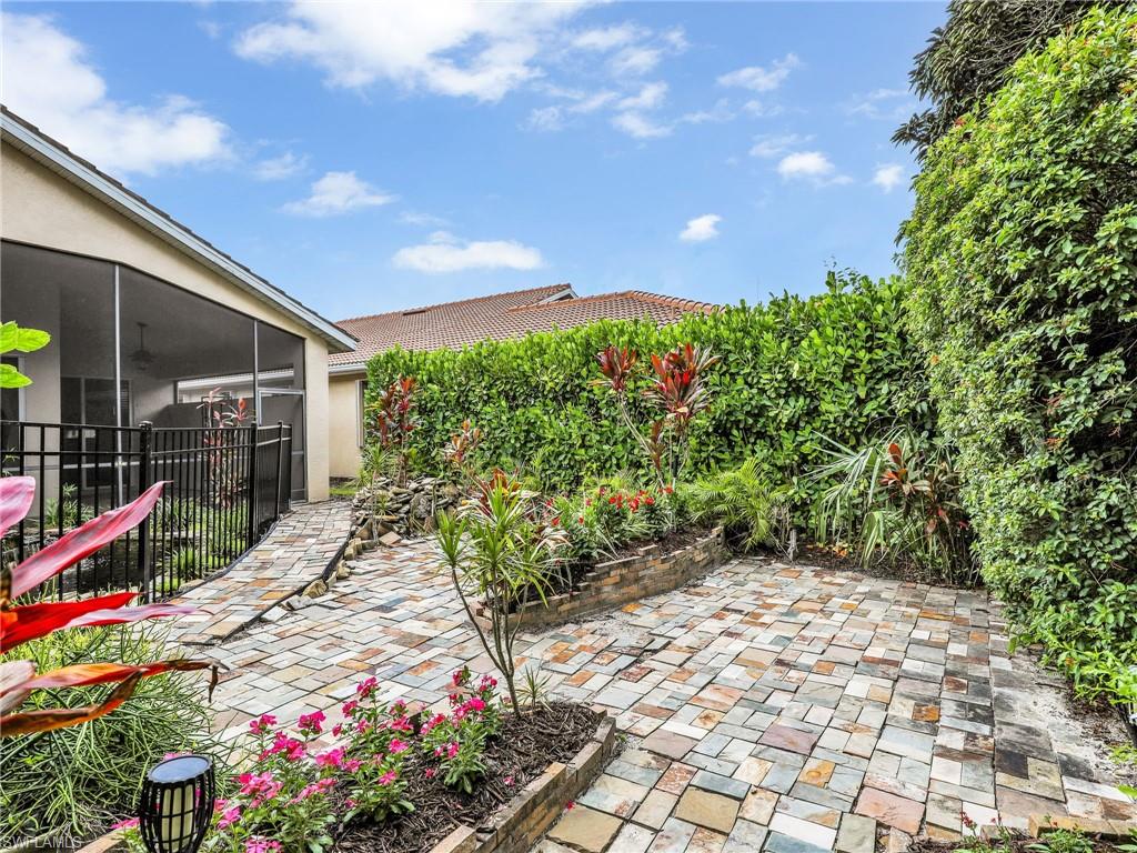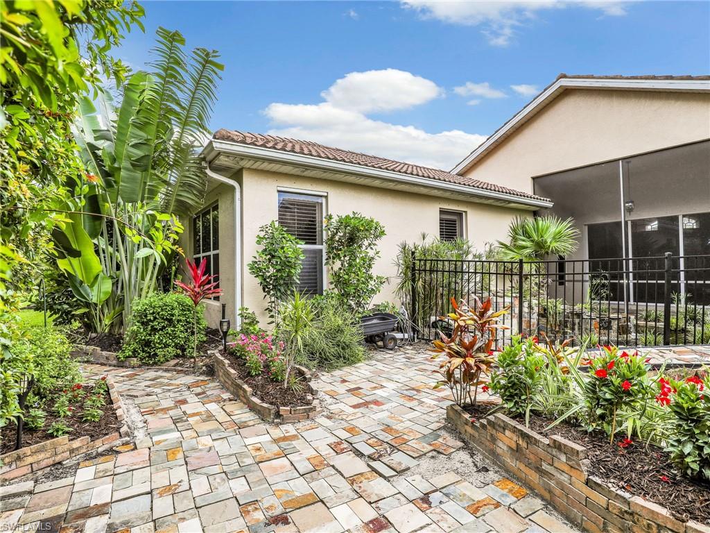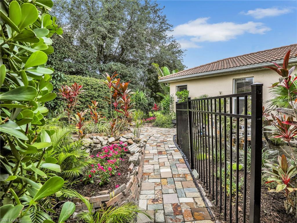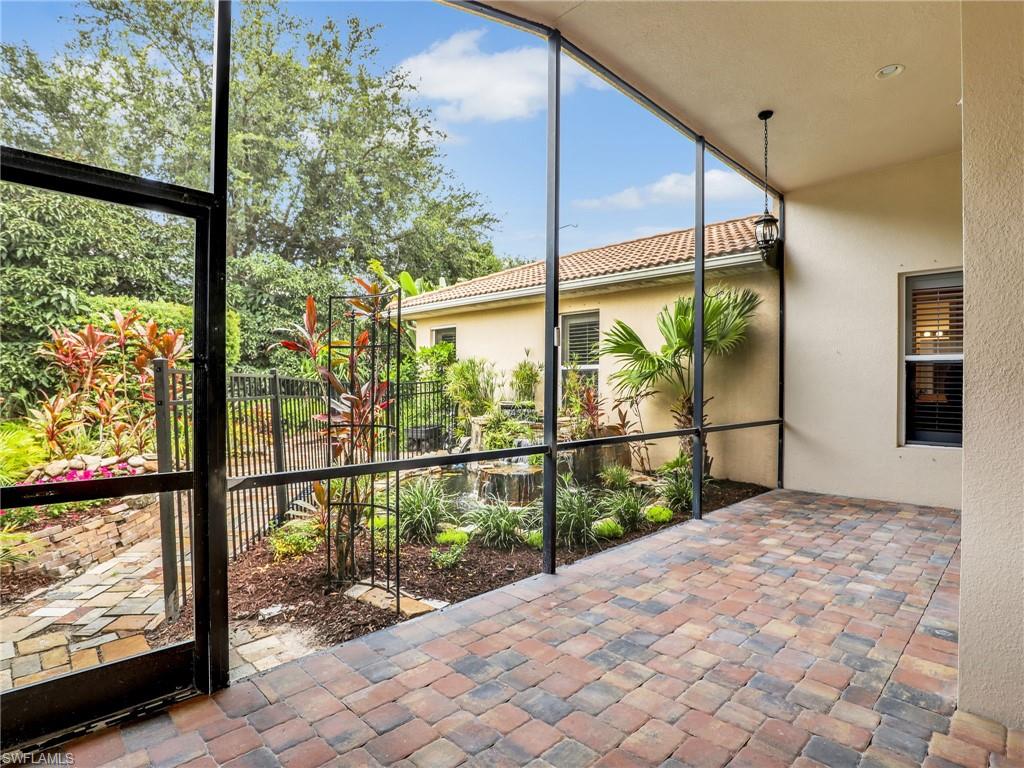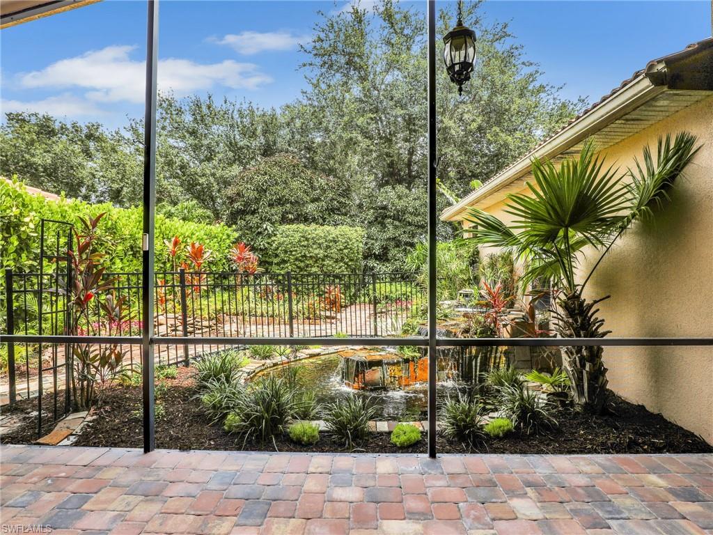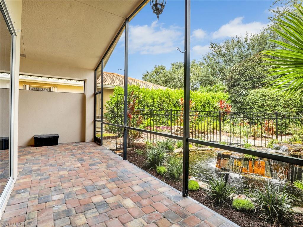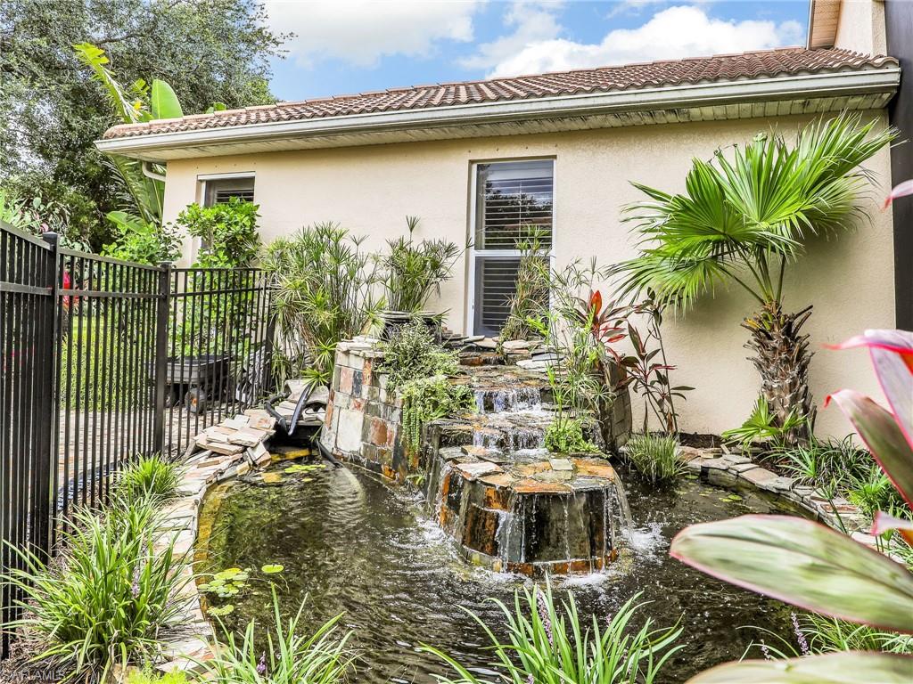 Distinctive Toll Brothers residence in Belle Lago with a custom-designed backyard unlike any other. One-story home with two bedrooms plus optional third/office, two baths, and a two-car garage. Tray ceilings, crown moulding, 8-ft doors, plantation shutters, and large beige tile throughout. A panoramic multi-tier waterfall flows beside the main rooms and screened lanai into a pond, viewable from multiple interior angles. Natural-gas kitchen with granite counters, stainless appliances, and wraparound breakfast bar. Open great room with 3-panel sliders framing wide pond and waterfall views. Whole-house Generac gas generator (2024) auto-transfer backup for storms. HVAC replaced 2023. Laundry with utility sink, gas dryer, and matching washer. Private guest wing functions like a mother-in-law suite. Owner’s suite has dual step-in closets, a refined bathroom, and views of the pond and rear landscaping. Backyard offers exceptional privacy with dense tropical hedging along sides and rear. Community pool a short stroll away. Belle Lago offers resort amenities in a gated setting near US-41, I-75, Hertz Arena, Gulf Coast Town Center, Miromar Outlets, Coconut Point; beaches ~20 min away.