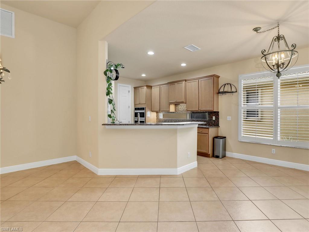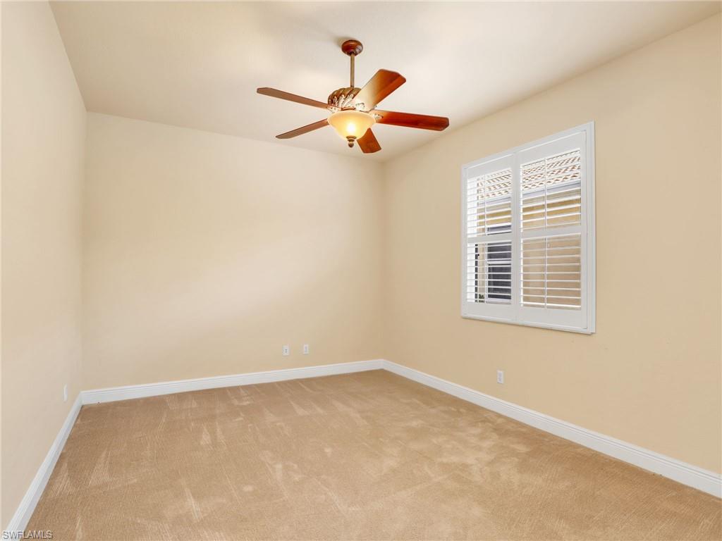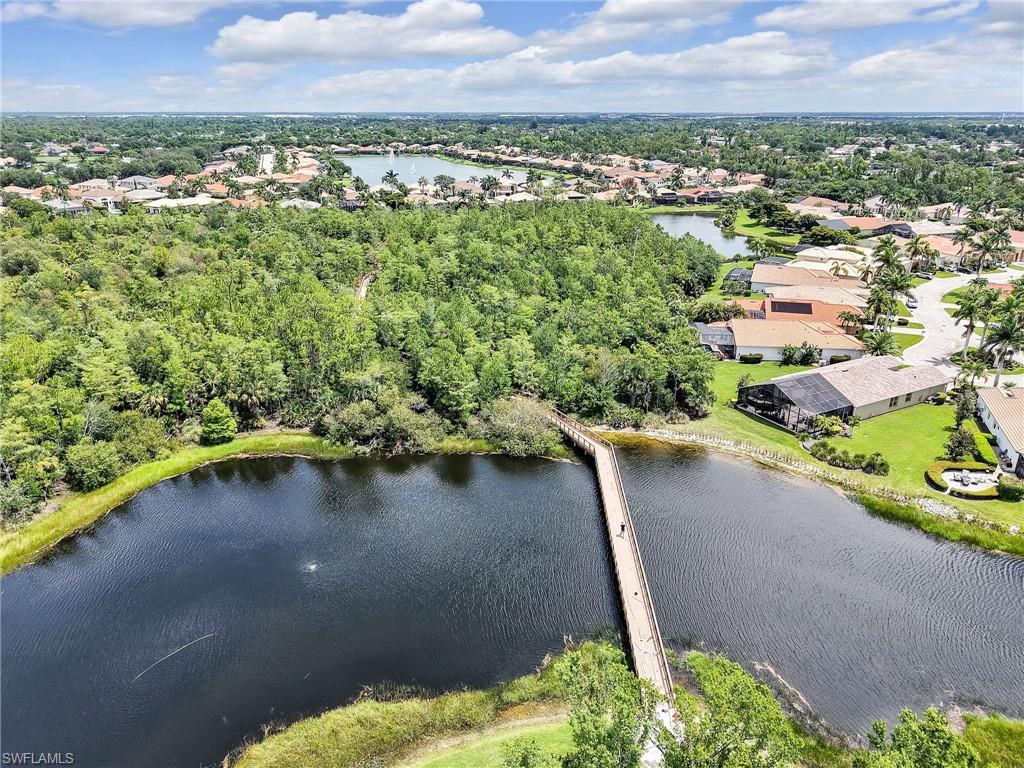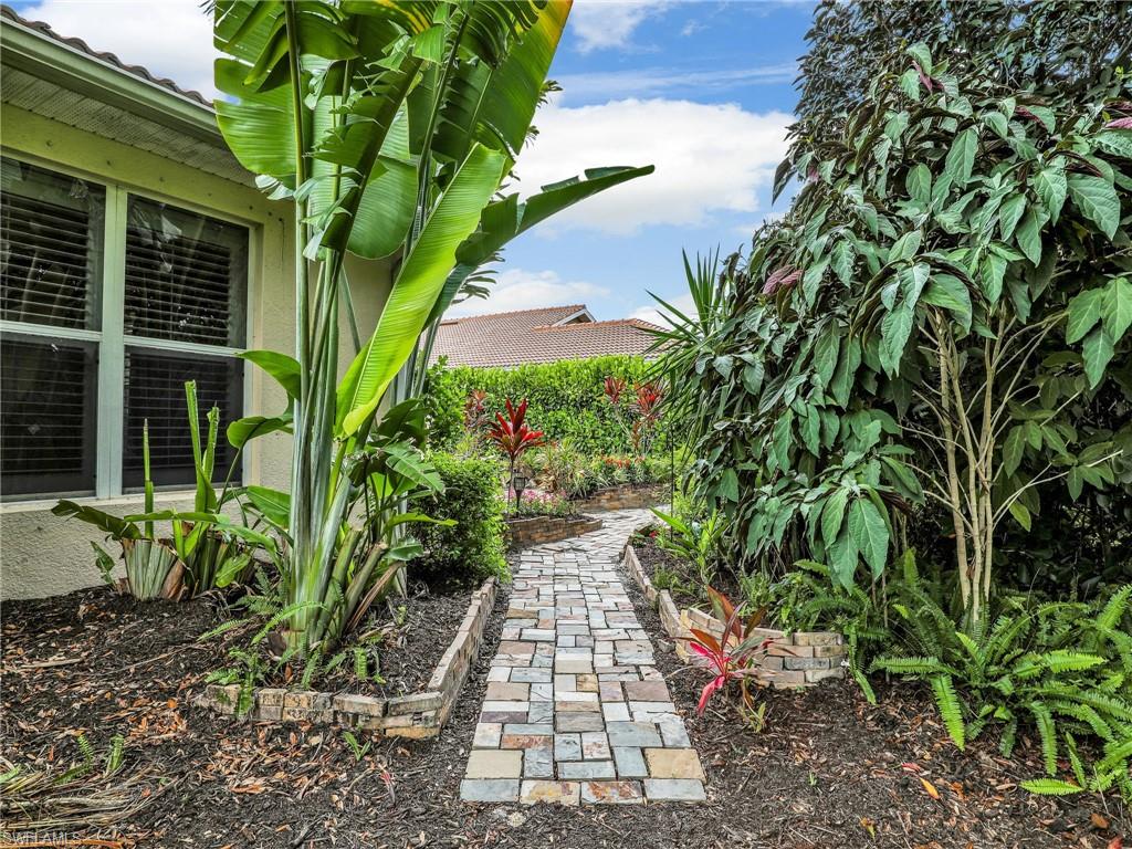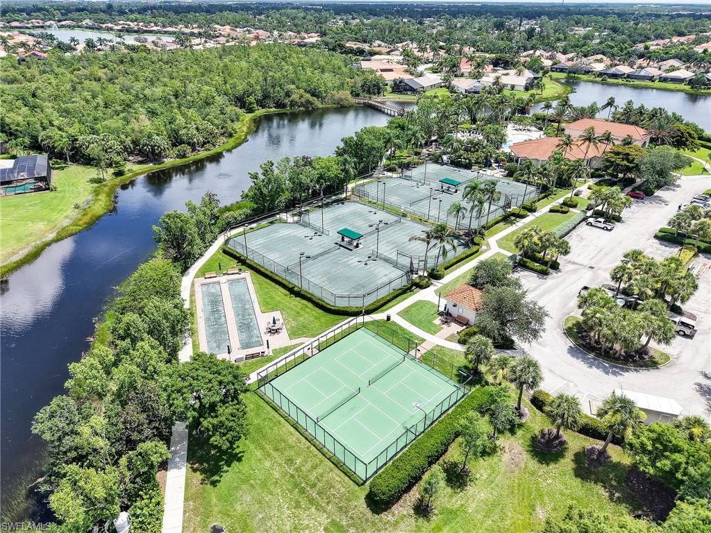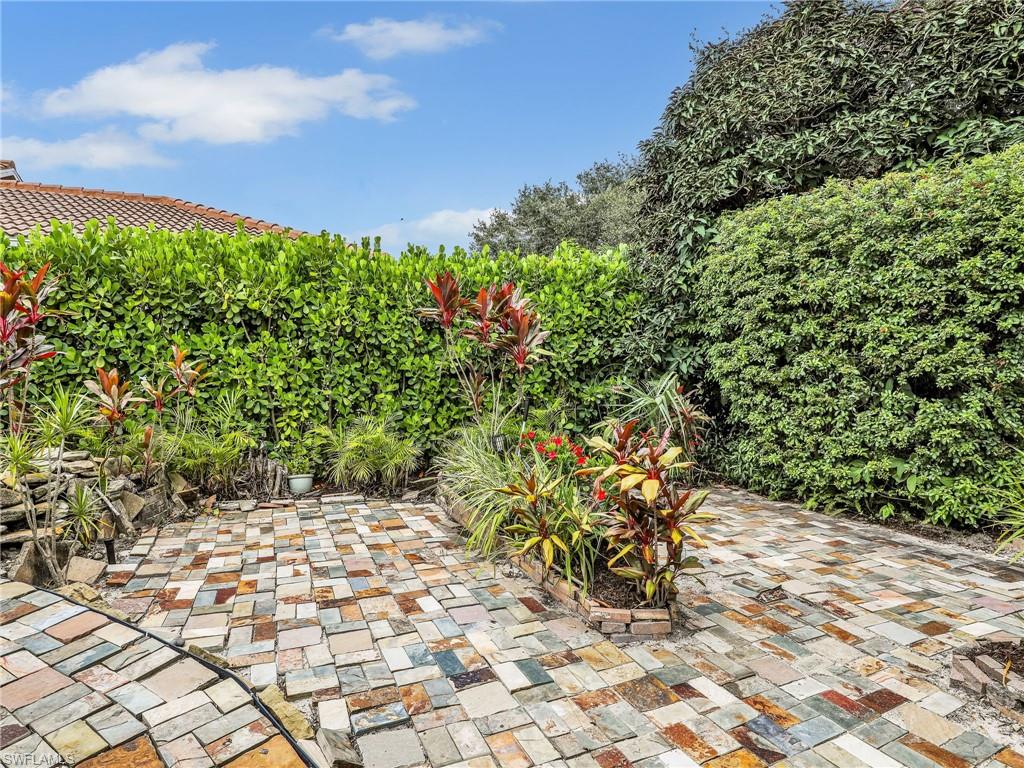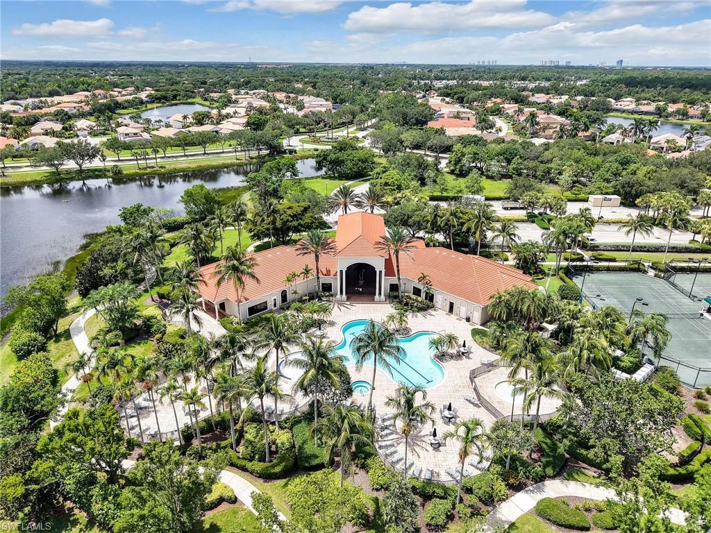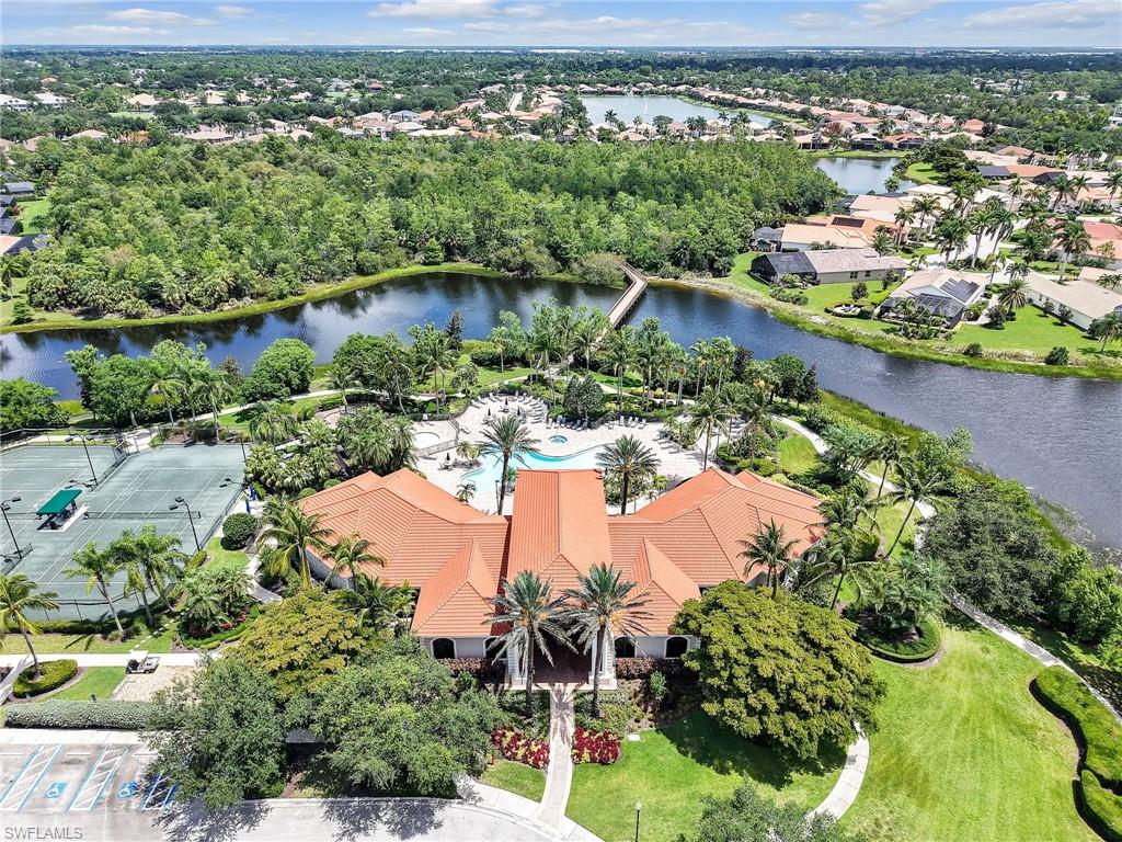 Distinctive Toll Brothers residence in Belle Lago with a custom-designed backyard unlike any other. One-story home with two bedrooms plus optional third/office, two baths, and a two-car garage. Tray ceilings, crown moulding, 8-ft doors, plantation shutters, and large beige tile throughout. A panoramic multi-tier waterfall flows beside the main rooms and screened lanai into a pond, viewable from multiple interior angles. Natural-gas kitchen with granite counters, stainless appliances, and wraparound breakfast bar. Open great room with 3-panel sliders framing wide pond and waterfall views. Whole-house Generac gas generator (2024) auto-transfer backup for storms. HVAC replaced 2023. Laundry with utility sink, gas dryer, and matching washer. Private guest wing functions like a mother-in-law suite. Owner’s suite has dual step-in closets, a refined bathroom, and views of the pond and rear landscaping. Backyard offers exceptional privacy with dense tropical hedging along sides and rear. Community pool a short stroll away. Belle Lago offers resort amenities in a gated setting near US-41, I-75, Hertz Arena, Gulf Coast Town Center, Miromar Outlets, Coconut Point; beaches ~20 min away.