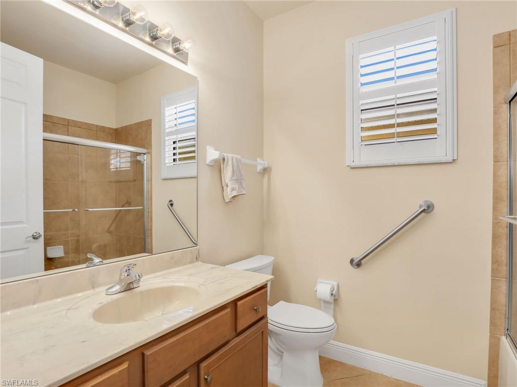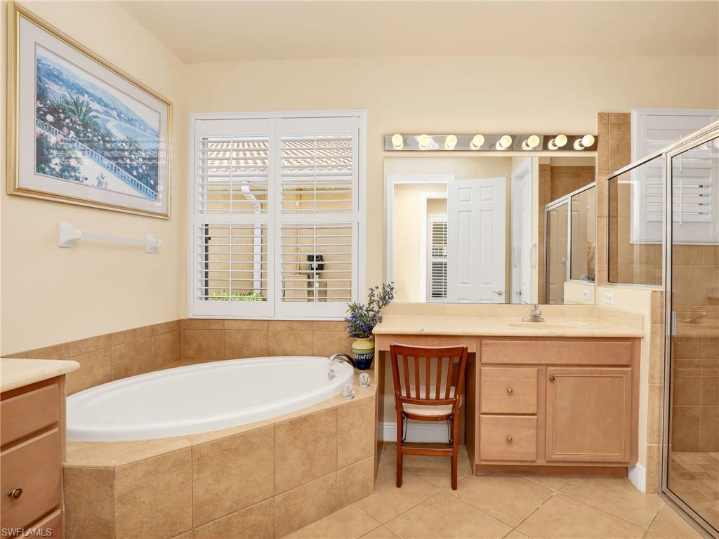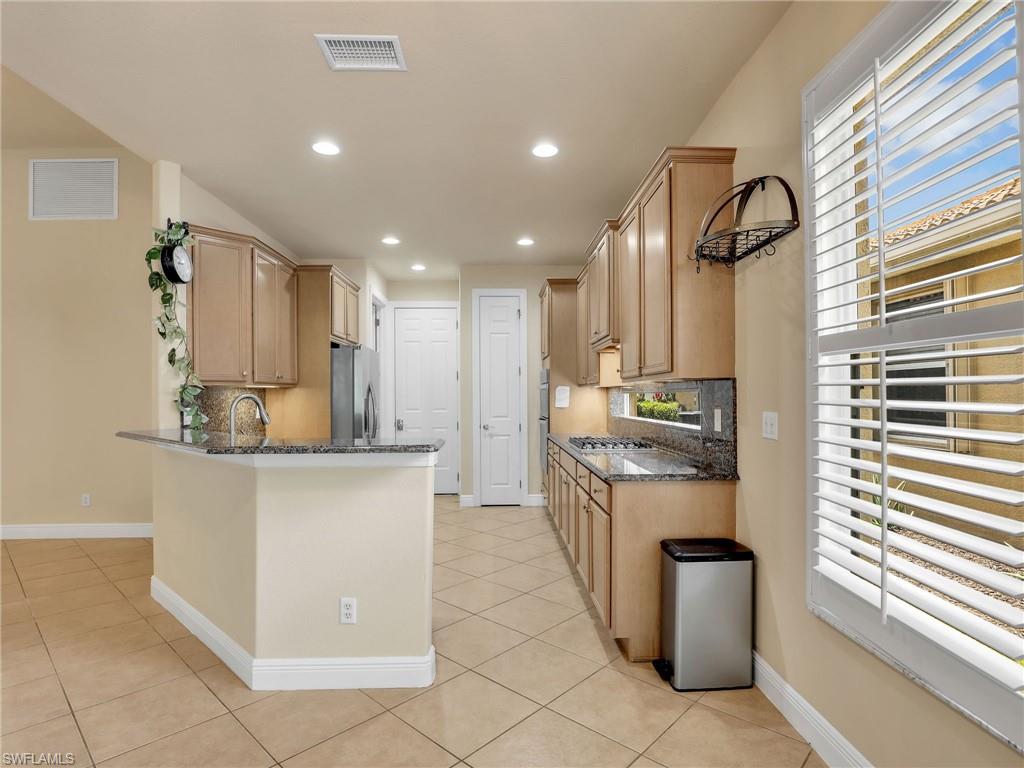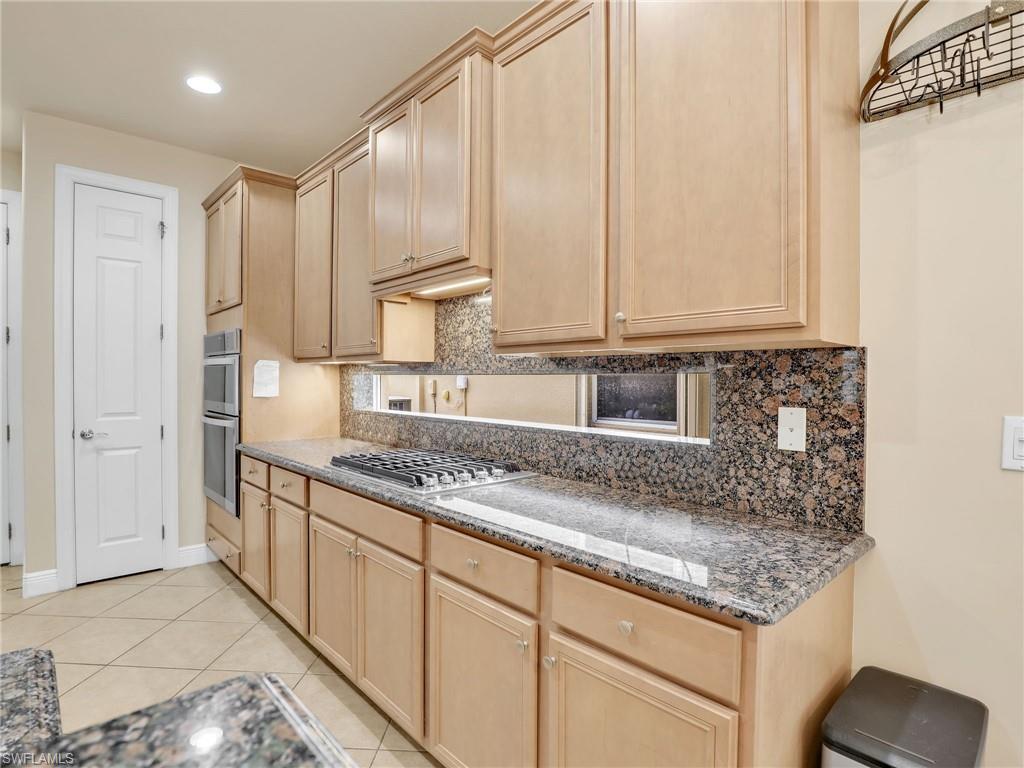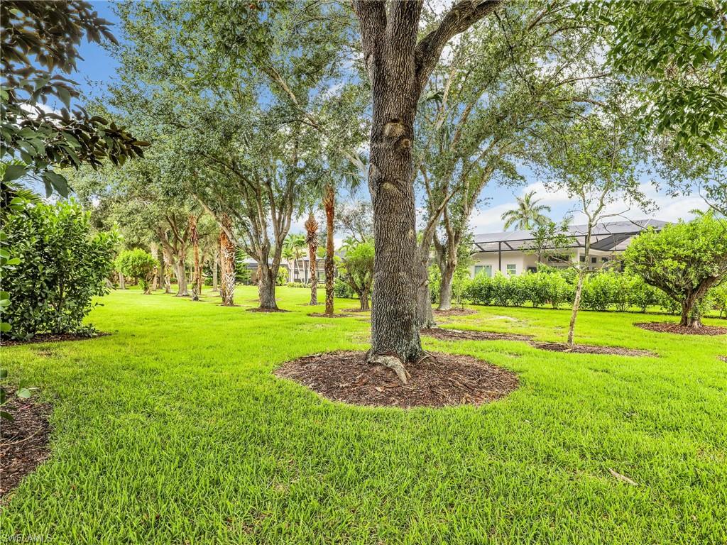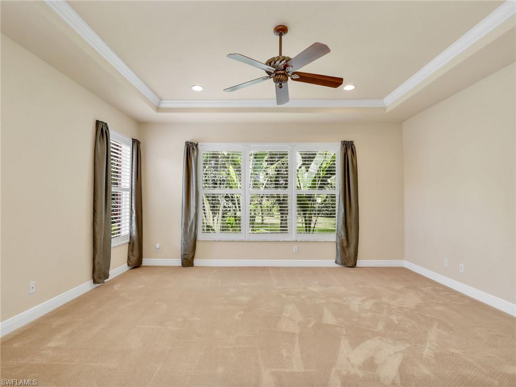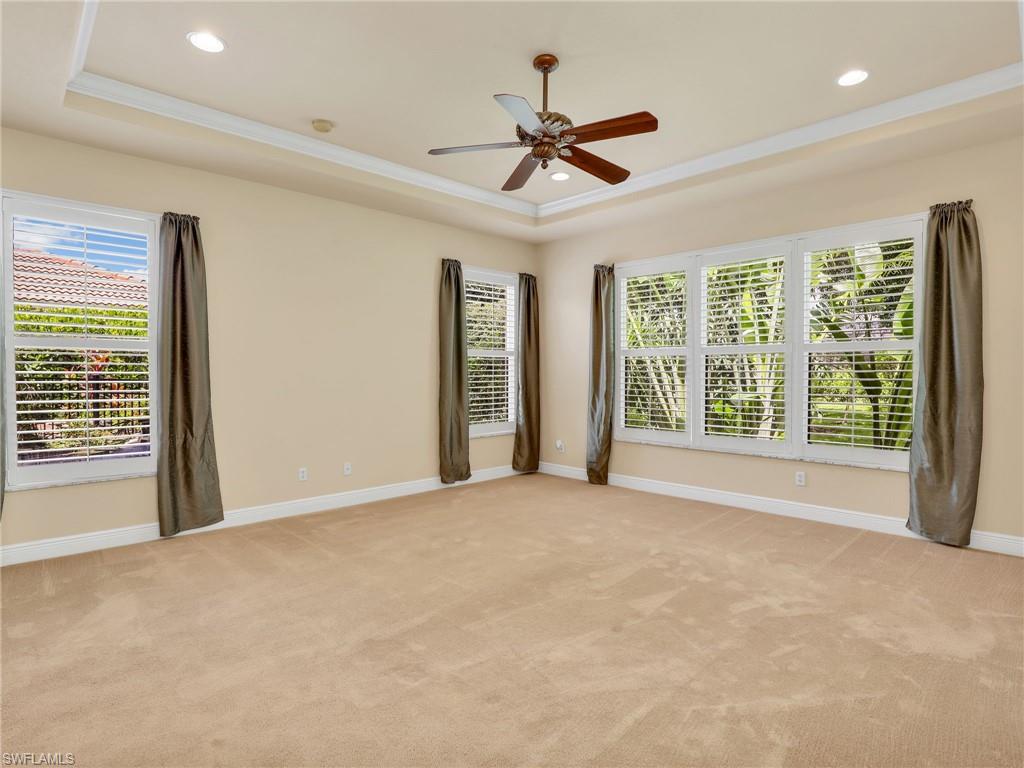 Distinctive Toll Brothers residence in Belle Lago with a custom-designed backyard unlike any other. One-story home with two bedrooms plus optional third/office, two baths, and a two-car garage. Tray ceilings, crown moulding, 8-ft doors, plantation shutters, and large beige tile throughout. A panoramic multi-tier waterfall flows beside the main rooms and screened lanai into a pond, viewable from multiple interior angles. Natural-gas kitchen with granite counters, stainless appliances, and wraparound breakfast bar. Open great room with 3-panel sliders framing wide pond and waterfall views. Whole-house Generac gas generator (2024) auto-transfer backup for storms. HVAC replaced 2023. Laundry with utility sink, gas dryer, and matching washer. Private guest wing functions like a mother-in-law suite. Owner’s suite has dual step-in closets, a refined bathroom, and views of the pond and rear landscaping. Backyard offers exceptional privacy with dense tropical hedging along sides and rear. Community pool a short stroll away. Belle Lago offers resort amenities in a gated setting near US-41, I-75, Hertz Arena, Gulf Coast Town Center, Miromar Outlets, Coconut Point; beaches ~20 min away.