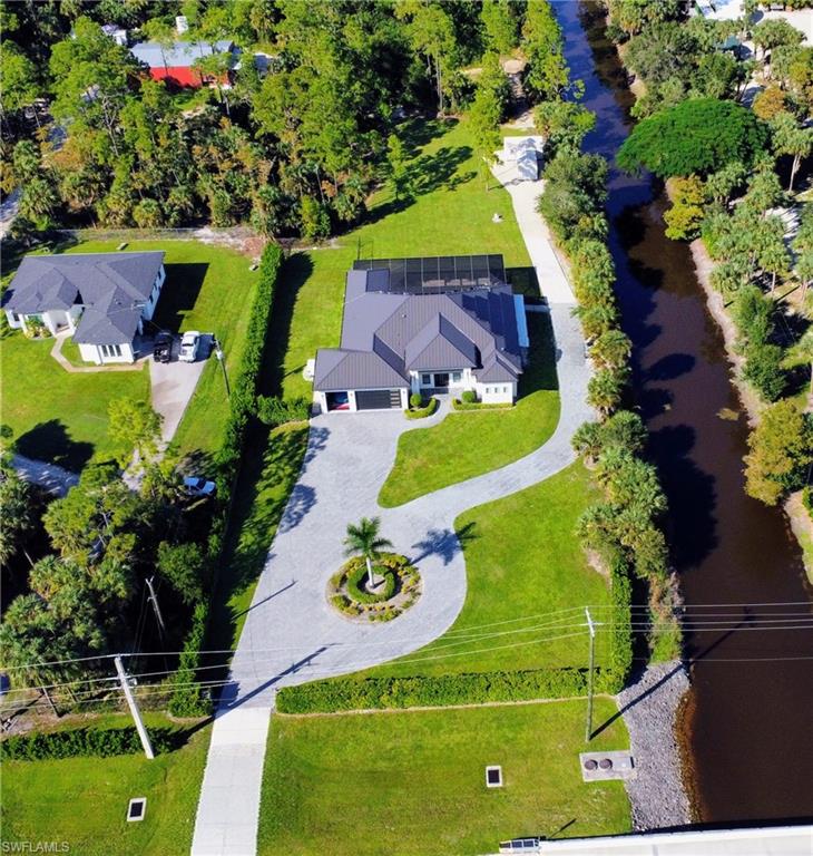Experience unparalleled luxury and privacy in this custom-built 4-bedroom plus Den, 3-bathroom contemporary estate, perfectly set on 100% upland, 2.74 gated acres along a tranquil canal in Golden Gate Estates. Completed in 2021, this home boasts exceptional infrastructure including a resilient metal roof, energy-efficient solar panels, and a whole house generator for complete peace of mind. For ultimate protection, the entire home features impact doors and windows. The property offers an impressive and secure entrance with a private gate and an expansive pavered wrap around driveway. The heart of the home is the upgraded chef's kitchen, featuring a large island and a large walk-in pantry, perfect for gourmet cooking. The magnificent interior showcases high ceilings and beautiful coffered ceilings throughout. The massive primary suite provides a true sanctuary, complete with a huge walk-in closet with a dedicated sitting area. Modern convenience is further enhanced by a tankless water heater. Outdoor living is elevated with a screened lanai, pool, spa, and a complete outdoor kitchen. The grounds feature a private fenced area, ideal for pets or play, and offer exclusive walking trails through the back acreage. Car enthusiasts will love the oversized 3-car garage, converted into an air-conditioned "dream garage," complemented by two additional air-conditioned storage units for climate-controlled storage. This estate is a rare find, combining expansive acreage, high-end upgrades, and waterfront.
