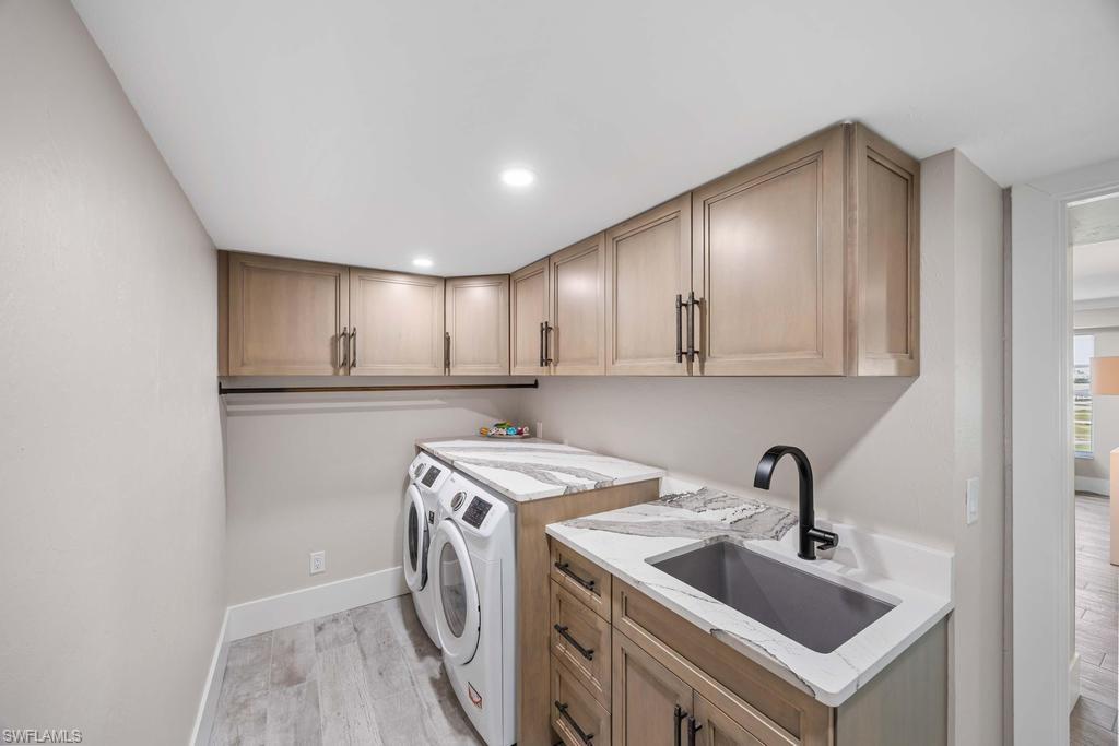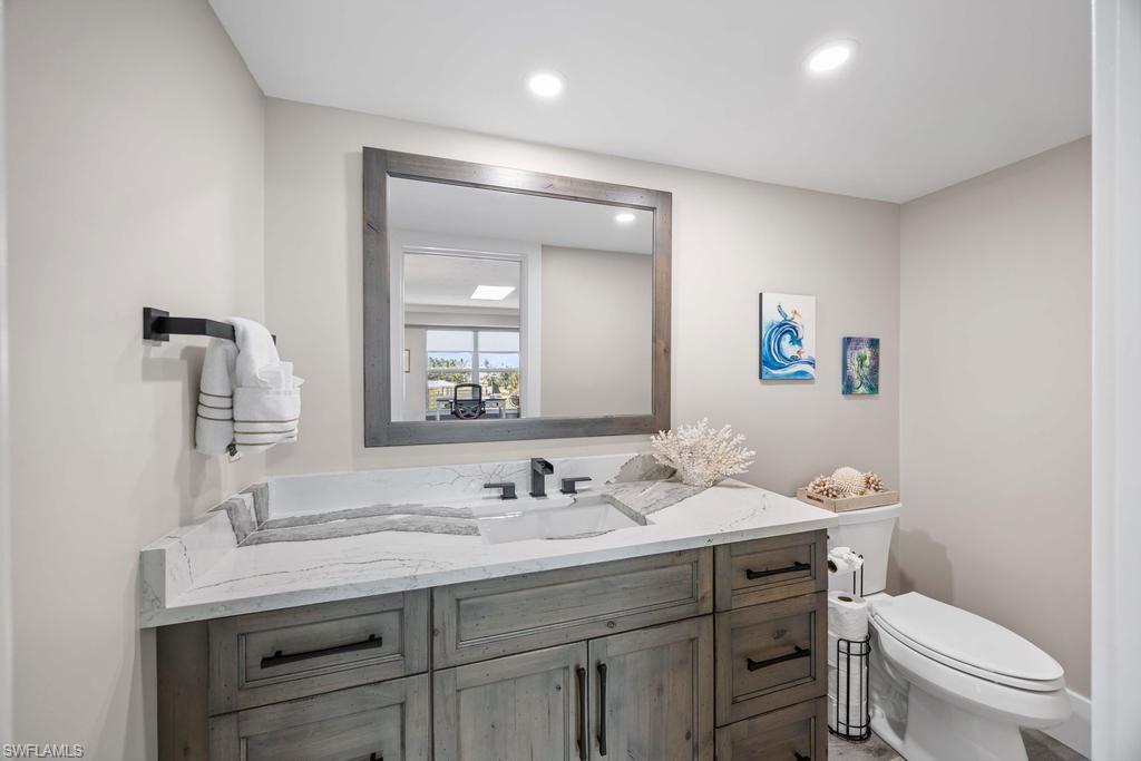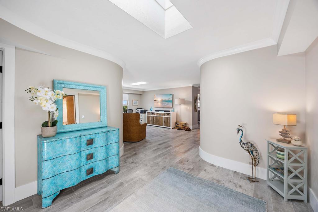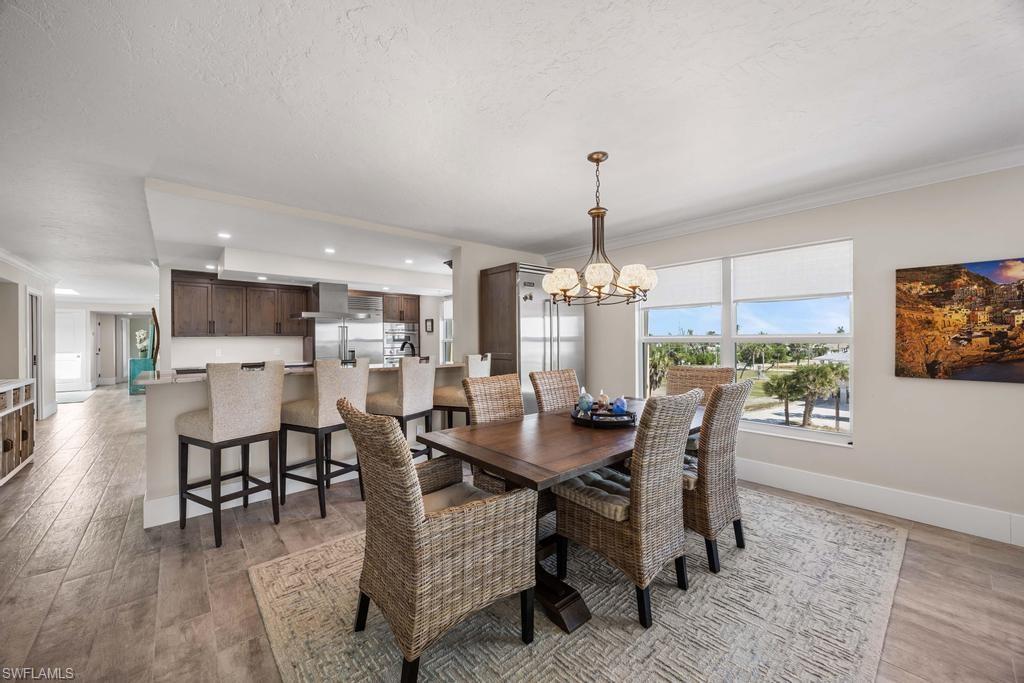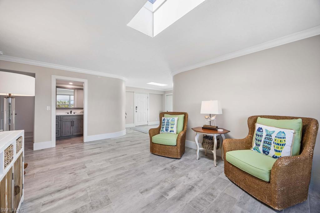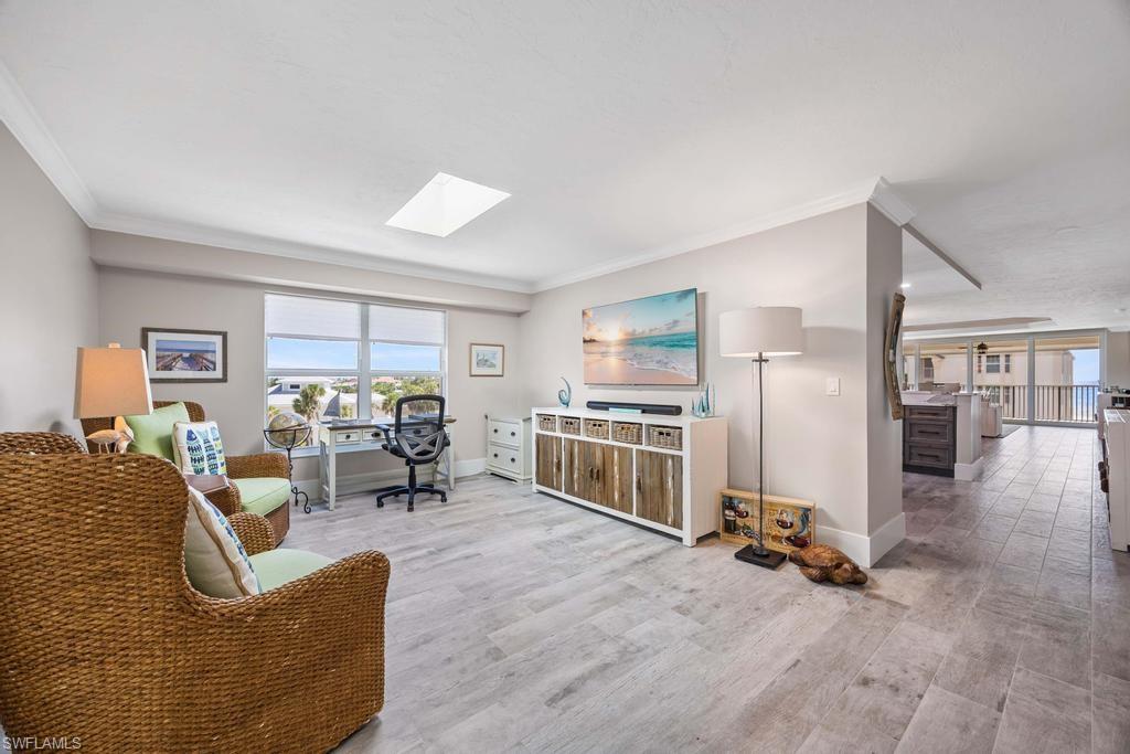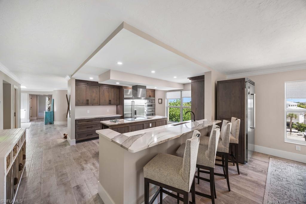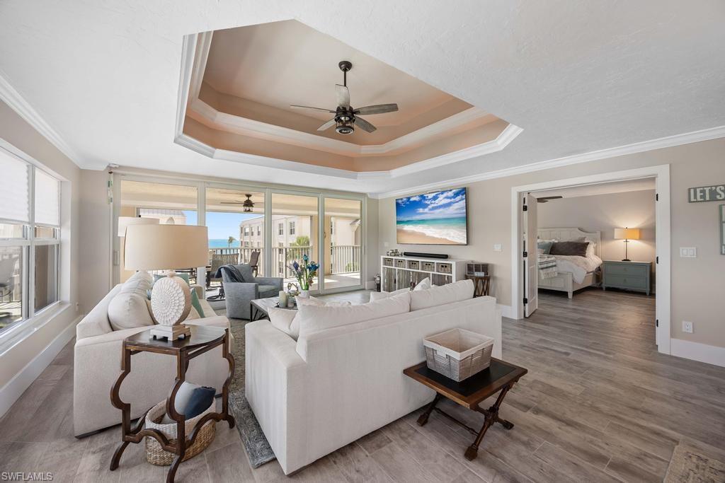 Experience the pinnacle of coastal contemporary luxury in this stunning 3-bedroom plus den, 3.5-bath Gulf-view penthouse, completely renovated in 2024 with exceptional craftsmanship and designer finishes. The custom-designed kitchen is a chef’s dream, featuring Thermador induction cooktop, professional series appliances, a Sub-Zero refrigerator/freezer, and an additional Viking refrigerator. Custom cabinetry and Cambria quartz countertops add a sleek, elegant touch, while ceramic tile flooring flows seamlessly throughout the open-concept living spaces. Walls of impact windows and doors showcase sweeping Gulf of Mexico views, and skylights fill the home with abundant natural light, creating a bright and inviting coastal ambiance. A private staircase leads to the upper sundeck area, the perfect retreat for entertaining or relaxing while enjoying spectacular sunsets over the water. Professionally furnished by Robb & Stucky, this residence embodies timeless design and modern sophistication.