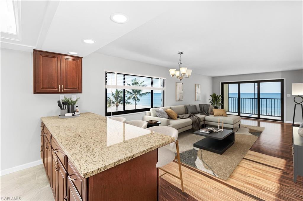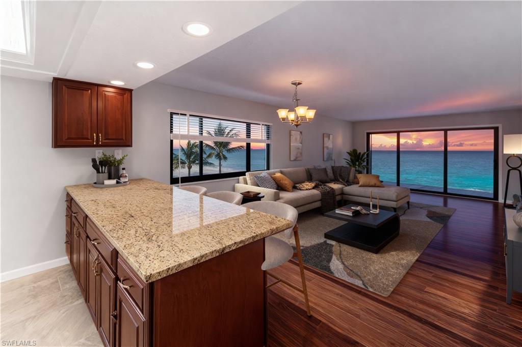 Rare 3 bedroom/2 bathroom FULL GULF FRONT Condo! Cascades Condominium is a great community with only 12 units in the building and has not had a condo for sale in 6 years. This 4th floor, corner unit is fully renovated featuring breathtaking panoramic water views from every window. Beautiful upgrades include new cabinets in the kitchen and baths, granite counter tops, new appliances, tray ceiling in kitchen, plantation shutters throughout, new light fixtures, new AC, new water heater and new flooring throughout. Electric was completely updated 2024. Have peace of mind with new impact resistant windows as well as electric hurricane shutters. Primary bedroom has an en-suite bathroom with designer finishes and walk in custom built closets. The split floorpan is perfect for entertaining guests. Large in unit laundry! Under building covered carport and storage cage included. Enjoy nightly sunsets right from the lanai or step out onto the sugar white sand of Fort Myers Beach. Located Mid Island close to Publix, Junkanoo, Fresh Catch, Snook Bight Marina and Newton Park. Schedule a showing today!