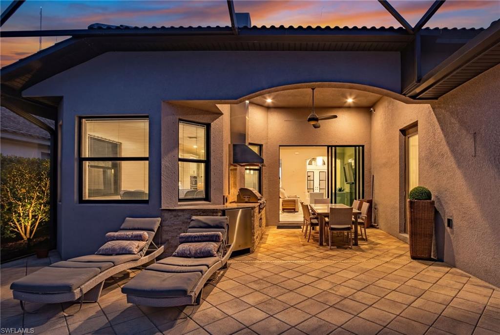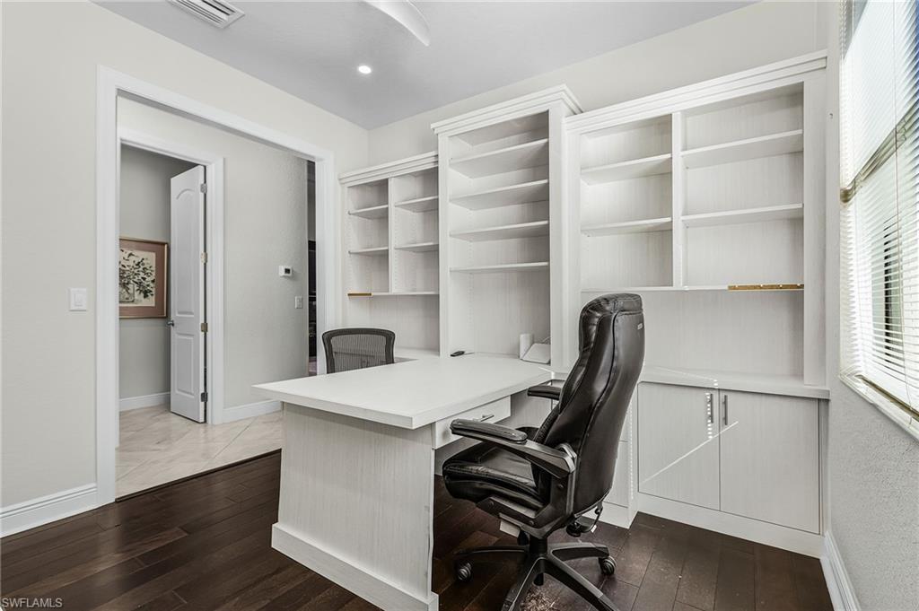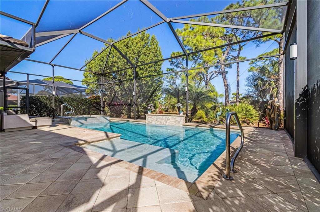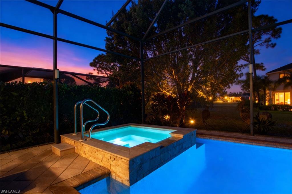 Welcome to Cordova at Spanish Wells. Built in 2016, this 3+Den/2.5 bath single-story pool home is situated on a quiet street with views of tropical foliage and hole #3 east of the 27-hole golf course at Spanish Wells Golf & Country Club. The "Serino Provincial" boasts light-filled interior spaces for seamless living. Luxurious finishes from granite tops in kitchen and baths, custom built in desk and wood flooring in the den/office, custom closets, to stunning built in shelves and cabinets with electric fireplace in the living room. Kitchen has custom pantry and dry bar with built in wine fridge and cabinet storage on both side of island. Outdoors features a large sunny pool with sun shelf and cascading water feature and attached spa, surrounded by a paved sundeck and covered lanai with outdoor kitchen. In this natural-gas community, Cordova residents enjoy gas cooking and grilling, gas heat for their pool, even tankless gas hot water heating. Lawn maintenance, irrigation, internet, cable TV and social membership to the club included in HOA. Golf and sports memberships available for an additional fee. Spanish Wells Golf and Country club offers golf courses, formal and casual dining, tennis, pickleball, bocce courts and a fitness center with classes. Prime location close to the beach, restaurants and shopping.