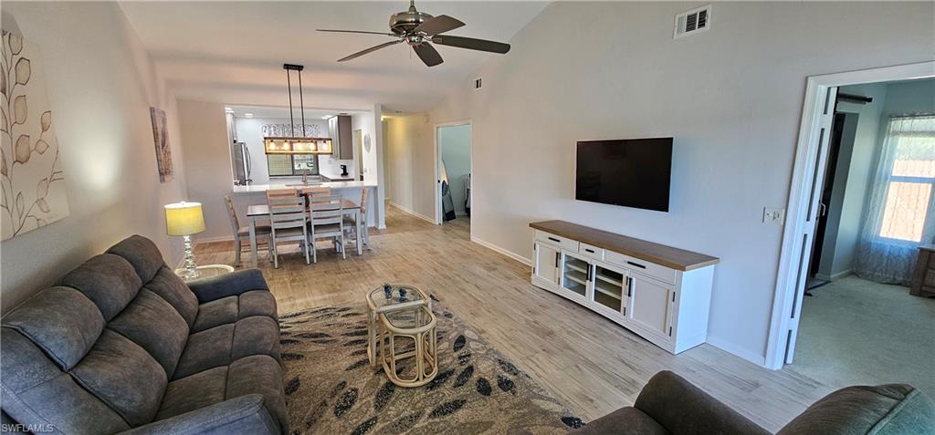 Enjoy living the southwest Florida lifestyle in this fabulously updated 3 bedroom 2 bath corner unit condo on the top floor with a stunning and expansive lakeview. Relax and unwind on your private screened lanai and watch the fish jump in the lake just outside. This 3rd and top floor home provides the new owner with peace of mind and comfort that there will be no noisy neighbors above you and boasts plank style tile flooring and high ceilings throughout the main living areas which provide an open and spacious feel to the home. The updated kitchen looks out over the main living area so you don’t miss any of the action and features stainless steel appliances and quartz counters. The roomy master bedroom suite features an updated private bath with a large tiled walk in shower and spacious walk in closet. There are 2 guest bedrooms perfect for hosting company or turn one of them into an office or den. Discover the charm of Deauville Lake Club which is ideally located just minutes to downtown, 5th Avenue shopping and dining and some of the finest beaches in Naples. Deauville offers 2 clubhouses, 2 pools, a spa, grills, tennis courts, shuffleboard and in a park-like peaceful setting with picnic areas and benches to sit and enjoy nature. This active community and membership offers dancing, water aerobics, bingo, card games, exercise classes, and for those with a creative flair, the philanthropic artist group offers a chance to indulge in artistic pursuits while contributing to the community. Recent updates have further enhanced the living experience at Deauville as the buildings now boast impact-resistant windows and sliders, new roofs, carports, and freshly painted exteriors. The modernized smoke alarms ensure safety, while the inclusion of cable and Wi-Fi in the HOA dues adds to the convenience of residents including poolside Wi-Fi. Sold fully furnished turnkey!