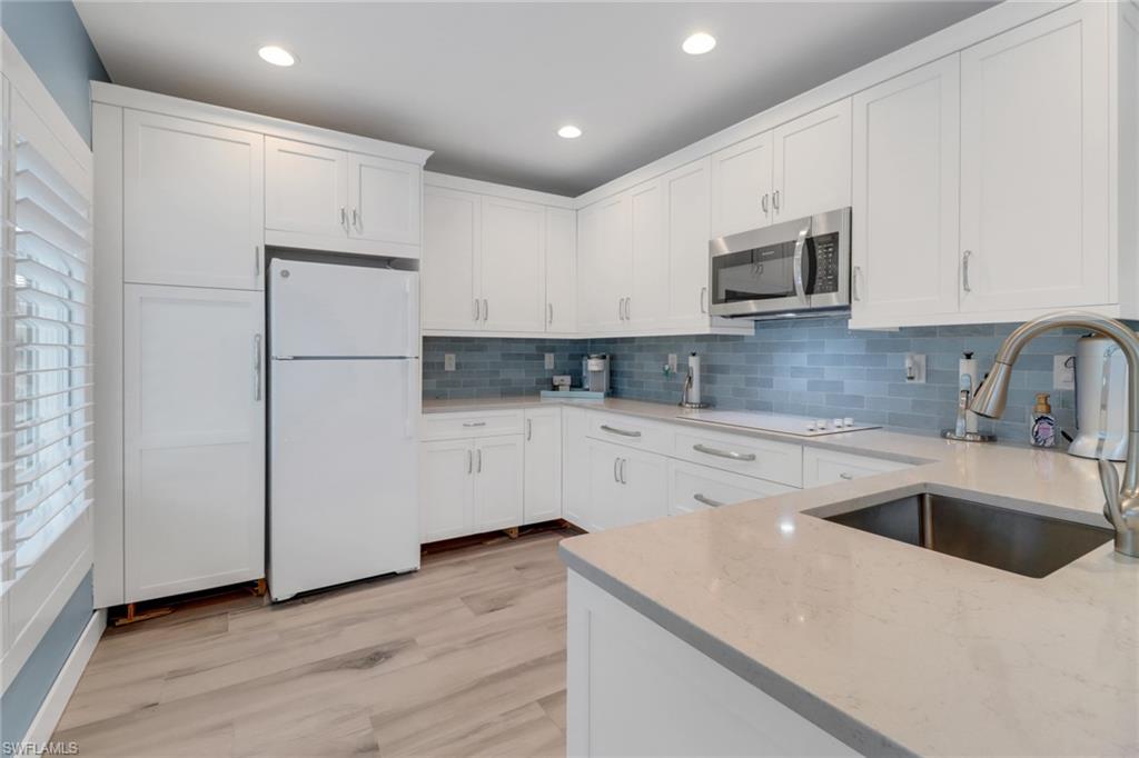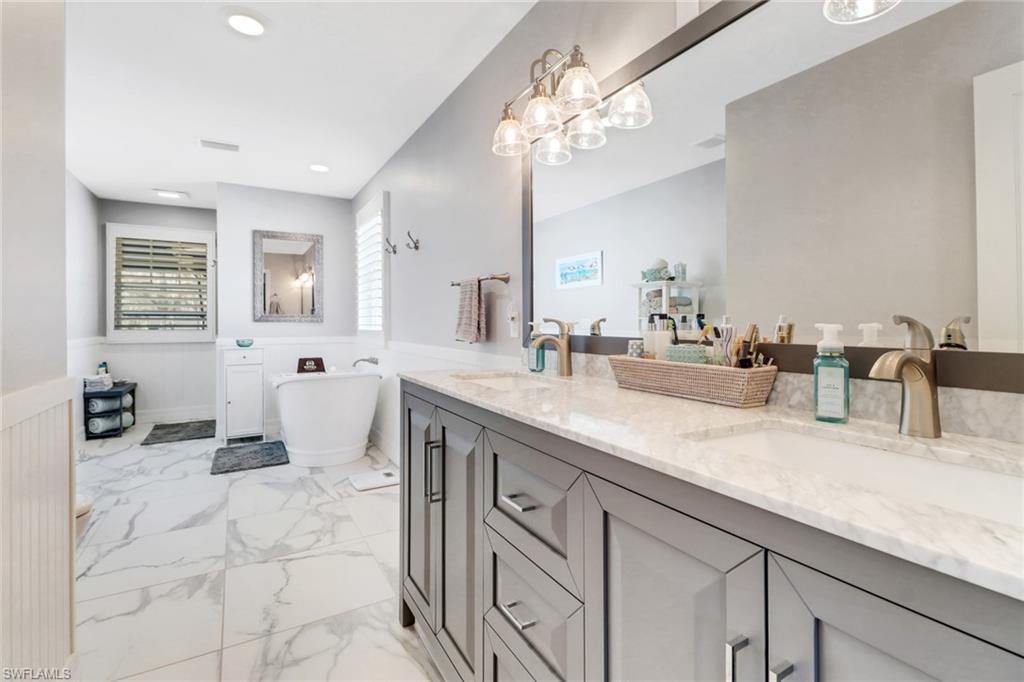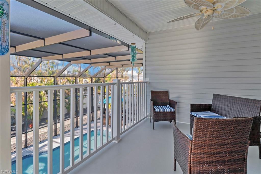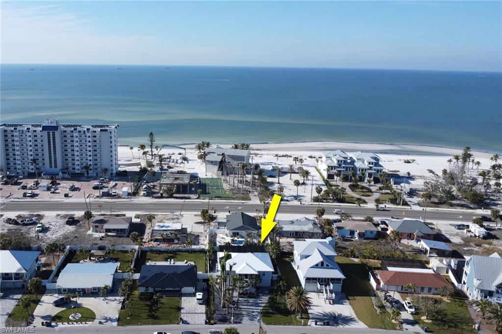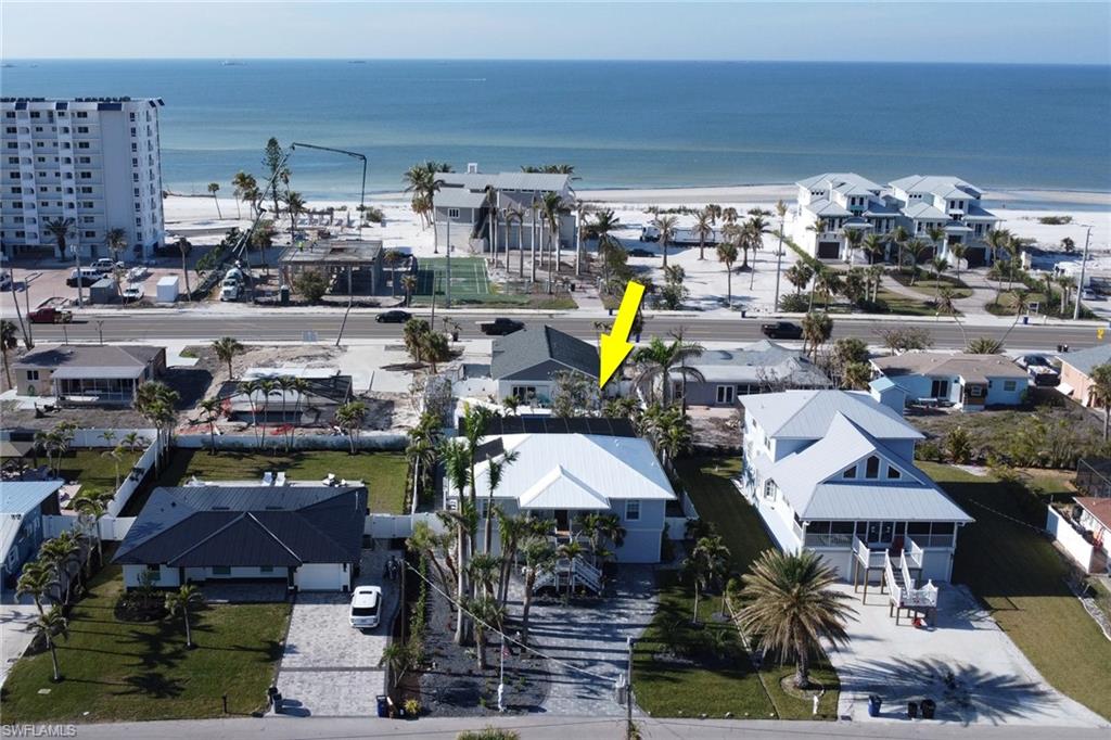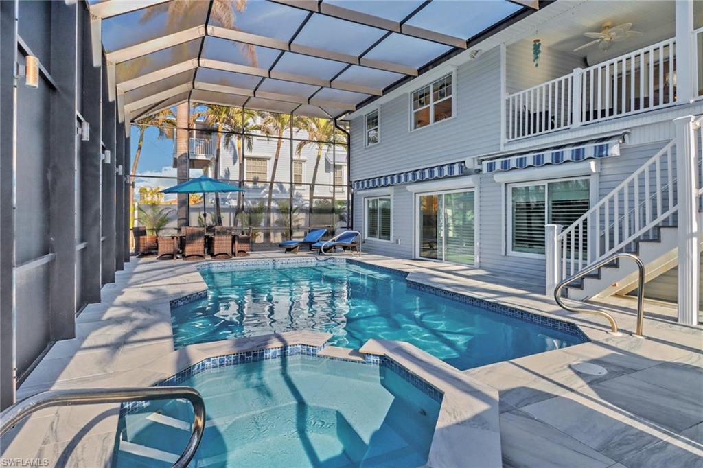 Located on the quiet South End of Estero Island, this stunning property offers a resort-like experience, with partial Gulf views and beach access just across the street. The elevated construction of this meticulously updated and maintained home, presents a unique opportunity to indulge in the coastal lifestyle, while the ELEVATOR, Metal Roof, upgraded Pavers, composite Decking, Automated features including lighting and irrigation, custom tile inlays in the salt water POOL & SPA, and 2-story Enclosure create a captivating outdoor space. The interior boasts a modern kitchen, with new solid wood cabinets, quartz countertops and sleek stainless appliances, including a beverage fridge, in the large island. Complemented by a 36 inch cooktop with vent hood, and engineered wood floors throughout. The renovated primary bathroom ensuite is a peaceful retreat, with dual sinks, stand alone soaking tub and separate tiled shower. With convenient access to Lover's Key, Bonita Springs, and Naples, this property is a captivating blend of luxury and coastal convenience. This is a MUST SEE property with a separate apartment downstairs. The fully renovated "Cabana/Guest house" has Two Bedrooms, a full Bath, full Kitchen Plus additional Living and storage space, with separate mini splits and tankless Hot Water Heater, Concrete, Epoxy and Plank Tile Flooring. Some other recent improvements include, Reverse Osmosis water system upstairs, Remote Controlled Storm Shutters (except 3 windows accordian: 2 front, 1 back), Remote Controlled Awnings by Pool (POOL completely redone in 2023), Automated Landscape Irrigation (well shared with neighbor) and Lighting, Automated Pool/Spa System with App, 2 Story Enclosure with Super Gutters & Super Screens), 125 gallon propane tank for pool heater & BBQ Grills.