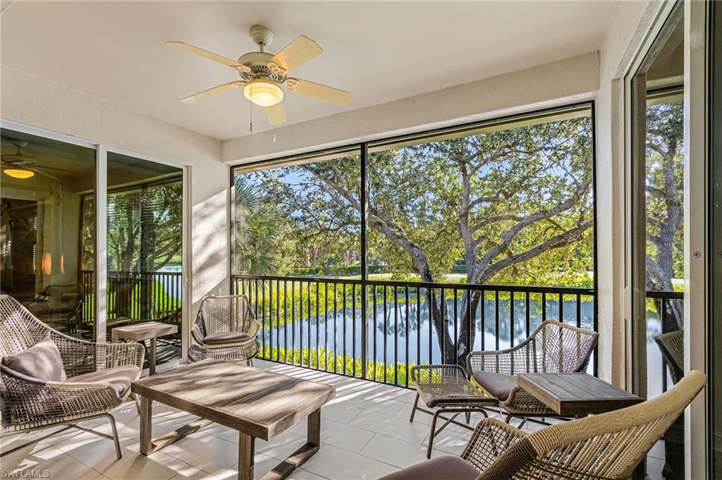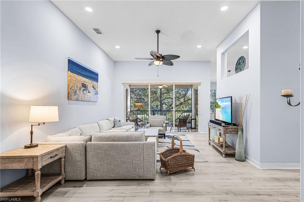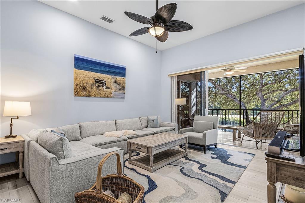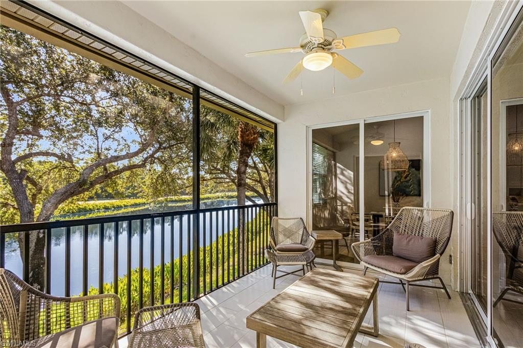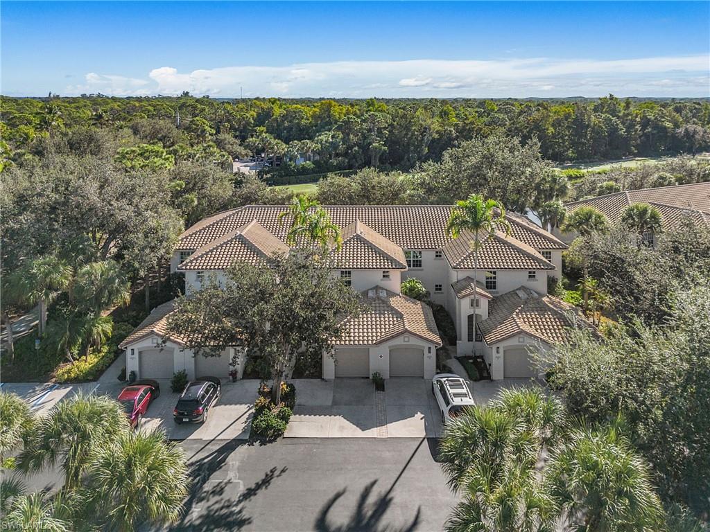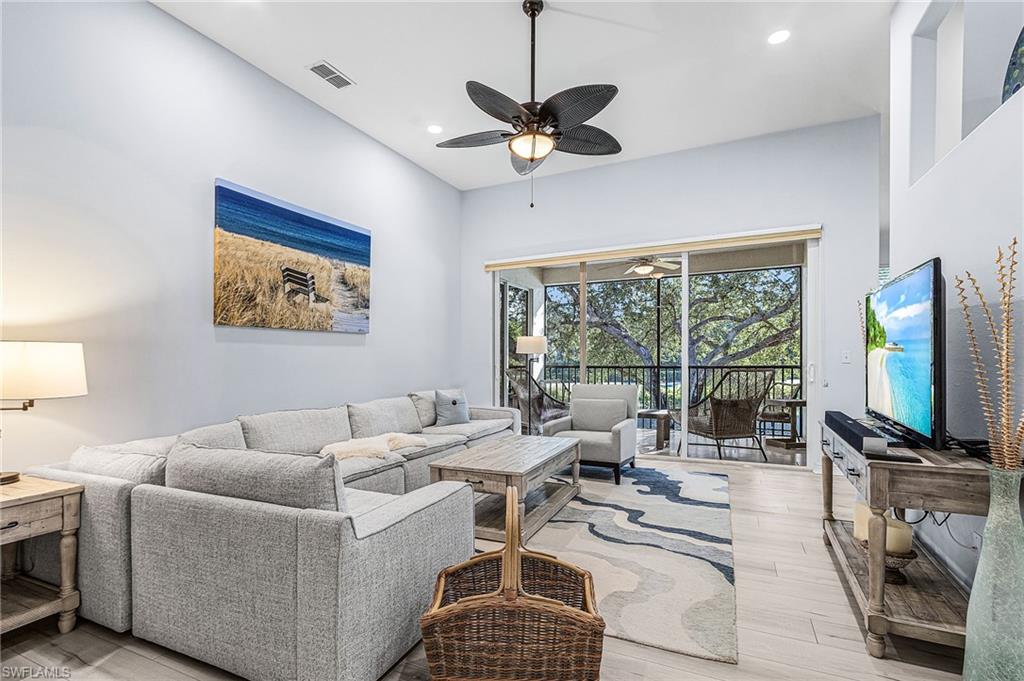 Step into this pristine second-floor coach home in Pelican Sound, one of Southwest Florida's top bundled golf communities. Offered turnkey furnished in a fresh coastal style with stylish accents, this residence boasts stunning views from the lake to the first fairway of the Lakes course. The updated kitchen features sleek quartzite countertops, tall 42-inch white cabinets, crisp white appliances, and convenient pull-out drawers for easy organization. Throughout the main living areas, soaring volume ceilings enhance the sense of space, complemented by durable luxury vinyl plank flooring that runs seamlessly from room to room. Recent upgrades—such as hurricane-resistant windows and sliding doors installed in 2025, refreshed baths, modernized kitchen elements, and new flooring—ensure the entire home feels thoughtfully refreshed and contemporary. Relax in the tranquil primary suite, which includes a tray ceiling, direct lanai access, and a spacious walk-in closet. The fully renovated primary bath offers a long vanity with dual sinks, an updated tiled shower, and a seamless shower door. For guests, a pocket door provides privacy along the hallway to the guest bedroom and its adjacent bath, which has been updated with a new vanity and quartzite countertop. The versatile third bedroom, with double doors, currently serves as a home office or den. Outside, park your car or golf cart in the one-car garage, with additional pads for two more vehicles and nearby guest parking. Access your private entrance via a dedicated stairwell, and enjoy the bright east-facing exposure that fills the space with morning light. Conveniently located near the Corkscrew Road gate, this lightly used vacation condo remains in exceptional condition—simply unpack and settle in! For an active lifestyle, Pelican Sound offers 27 holes of championship golf, 14 pickleball courts, 8 tennis courts, and 6 bocce areas, plus a state-of-the-art fitness center with professional staff. Bordering the Estero River with Gulf access, the community provides secure dry boat storage, kayaks, canoes, and paddleboards. A standout feature is the shuttle service—a scenic pontoon boat ride through Estero Bay to Lovers Key State Park Beach, perfect for spotting wildlife and soaking in breathtaking views. Residents also enjoy the clubhouse with exceptional dining options right in the neighborhood, so you never need to venture far for a memorable meal. Just moments from RSW International Airport, Coconut Point, and an array of shopping and restaurants, this is the ultimate spot to live the Florida dream!