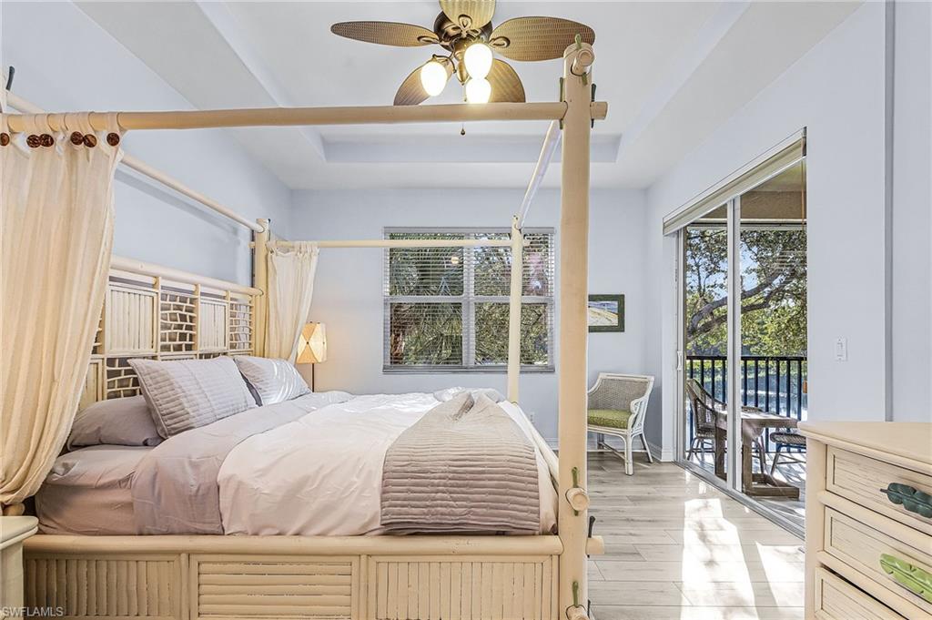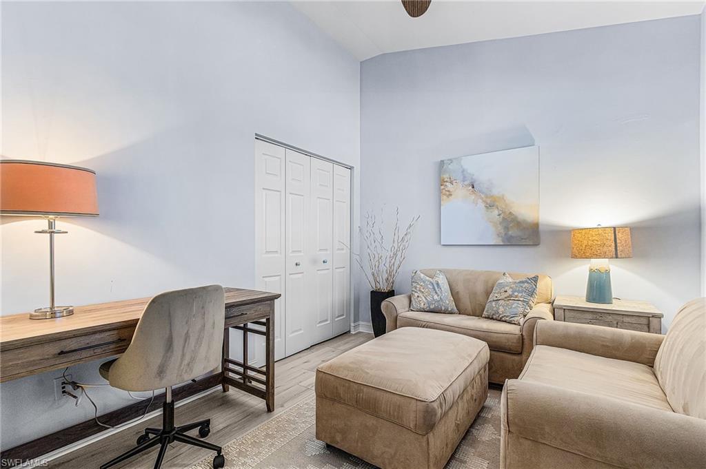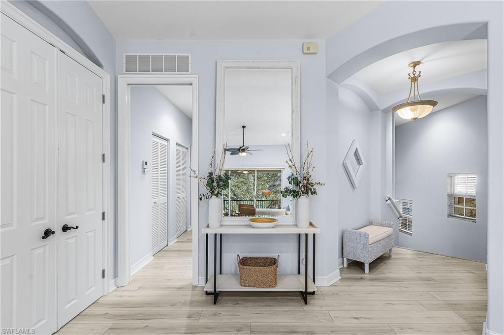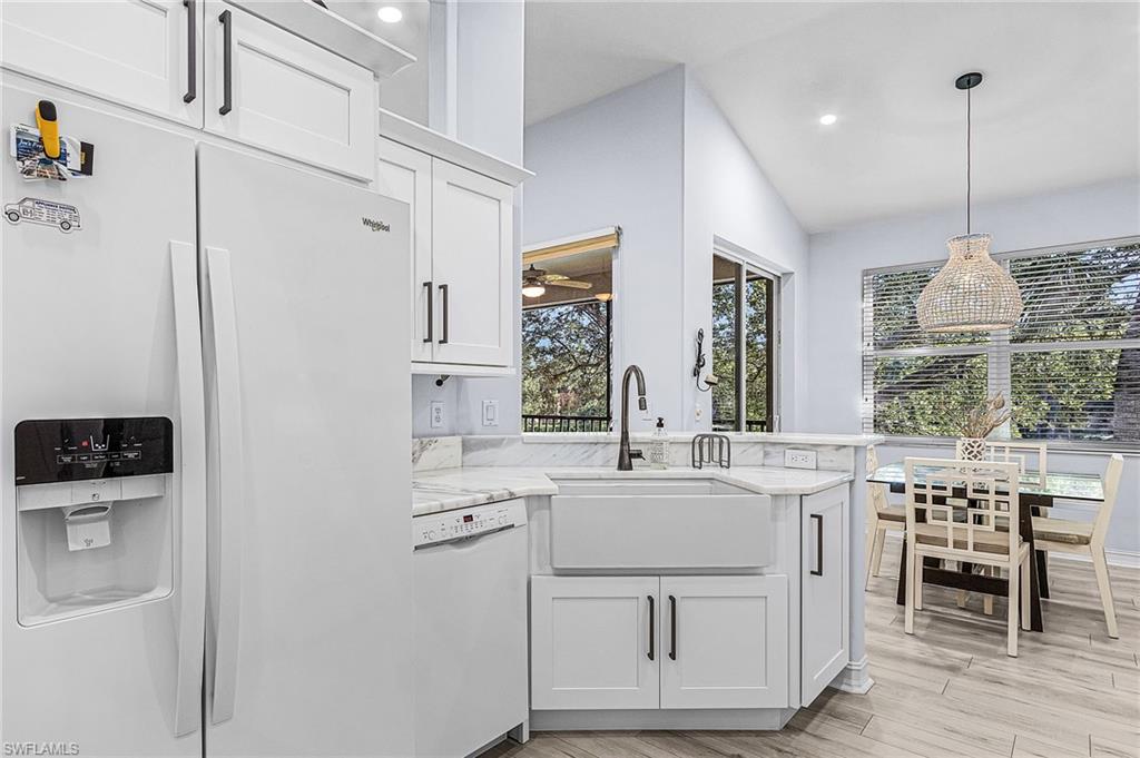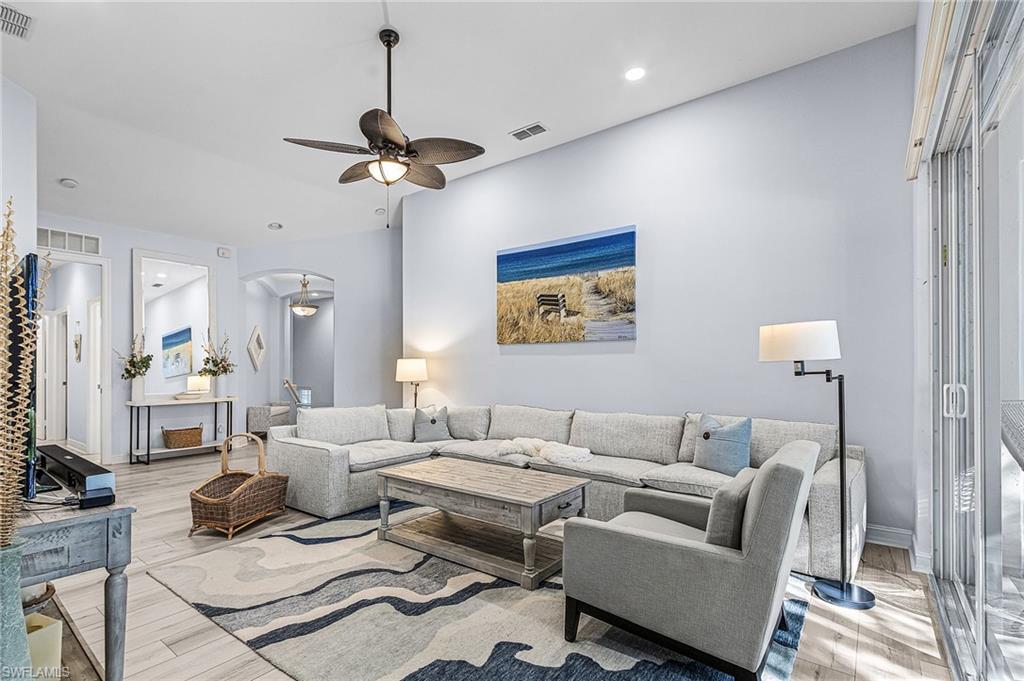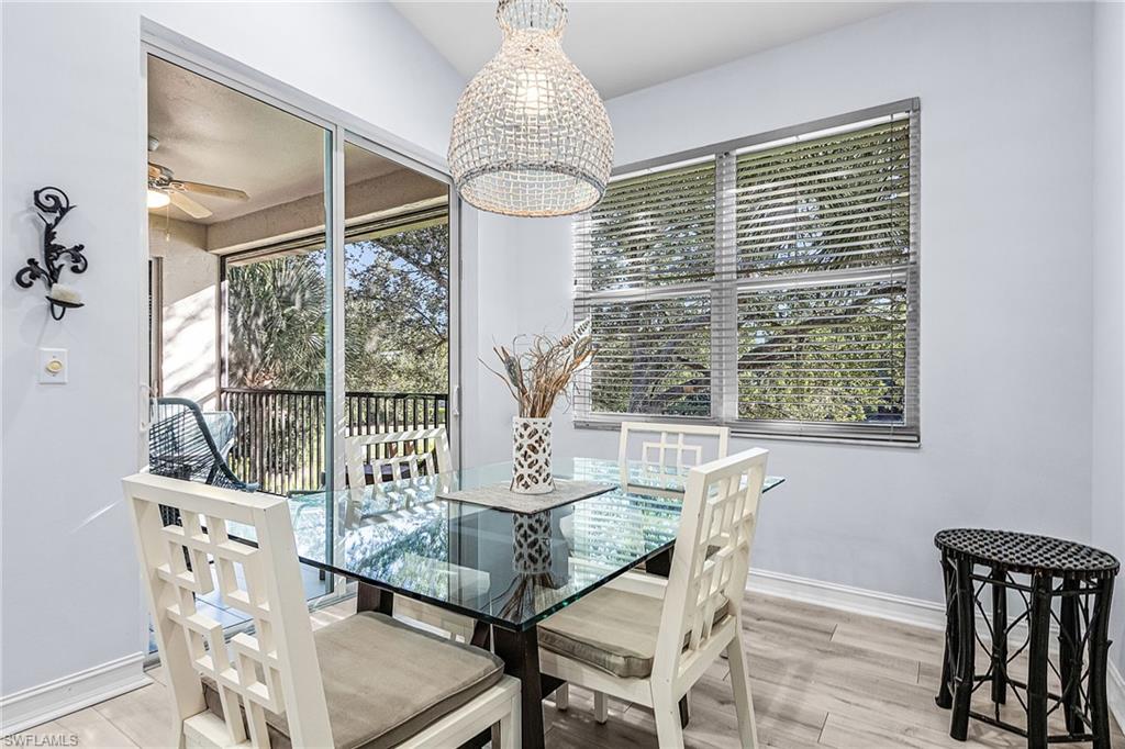 Step into this pristine second-floor coach home in Pelican Sound, one of Southwest Florida's top bundled golf communities. Offered turnkey furnished in a fresh coastal style with stylish accents, this residence boasts stunning views from the lake to the first fairway of the Lakes course. The updated kitchen features sleek quartzite countertops, tall 42-inch white cabinets, crisp white appliances, and convenient pull-out drawers for easy organization. Throughout the main living areas, soaring volume ceilings enhance the sense of space, complemented by durable luxury vinyl plank flooring that runs seamlessly from room to room. Recent upgrades—such as hurricane-resistant windows and sliding doors installed in 2025, refreshed baths, modernized kitchen elements, and new flooring—ensure the entire home feels thoughtfully refreshed and contemporary. Relax in the tranquil primary suite, which includes a tray ceiling, direct lanai access, and a spacious walk-in closet. The fully renovated primary bath offers a long vanity with dual sinks, an updated tiled shower, and a seamless shower door. For guests, a pocket door provides privacy along the hallway to the guest bedroom and its adjacent bath, which has been updated with a new vanity and quartzite countertop. The versatile third bedroom, with double doors, currently serves as a home office or den. Outside, park your car or golf cart in the one-car garage, with additional pads for two more vehicles and nearby guest parking. Access your private entrance via a dedicated stairwell, and enjoy the bright east-facing exposure that fills the space with morning light. Conveniently located near the Corkscrew Road gate, this lightly used vacation condo remains in exceptional condition—simply unpack and settle in! For an active lifestyle, Pelican Sound offers 27 holes of championship golf, 14 pickleball courts, 8 tennis courts, and 6 bocce areas, plus a state-of-the-art fitness center with professional staff. Bordering the Estero River with Gulf access, the community provides secure dry boat storage, kayaks, canoes, and paddleboards. A standout feature is the shuttle service—a scenic pontoon boat ride through Estero Bay to Lovers Key State Park Beach, perfect for spotting wildlife and soaking in breathtaking views. Residents also enjoy the clubhouse with exceptional dining options right in the neighborhood, so you never need to venture far for a memorable meal. Just moments from RSW International Airport, Coconut Point, and an array of shopping and restaurants, this is the ultimate spot to live the Florida dream!