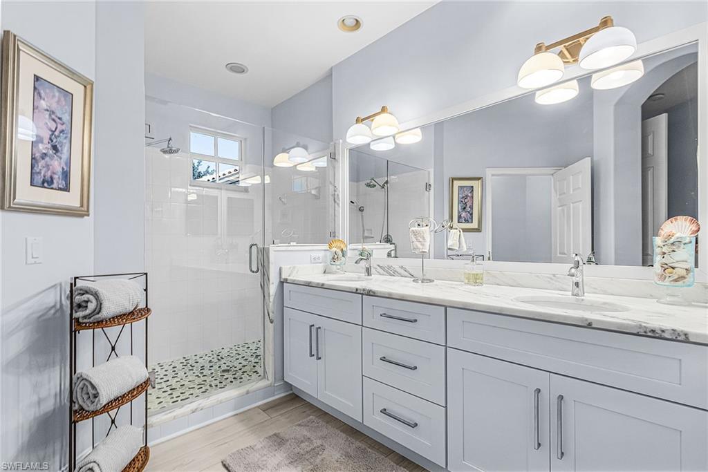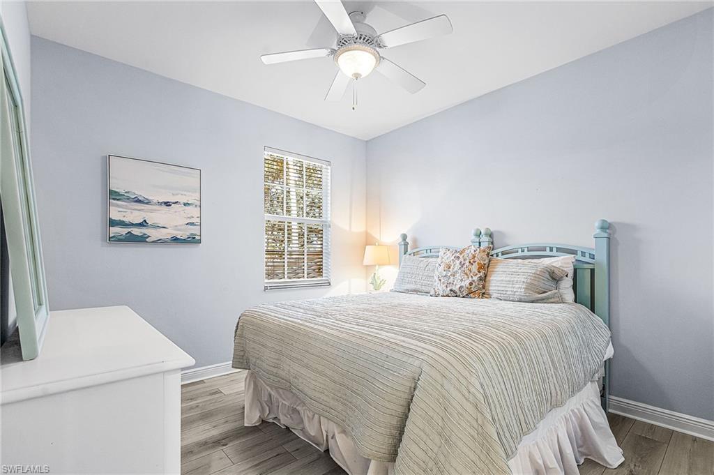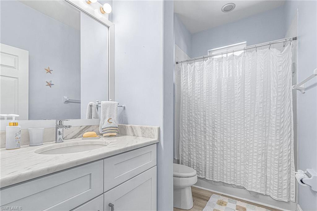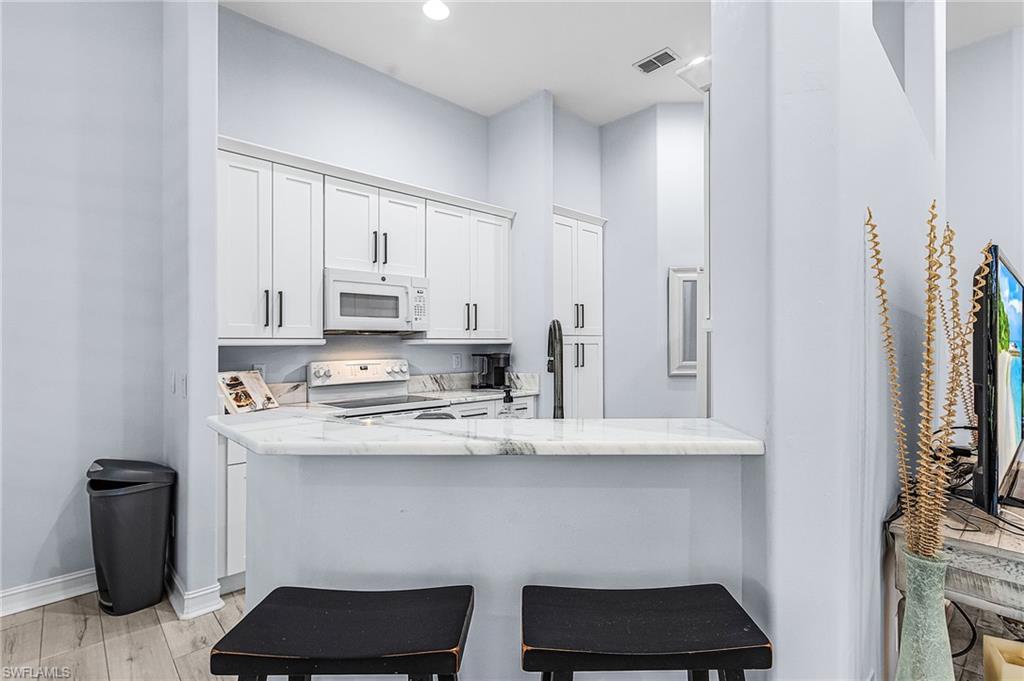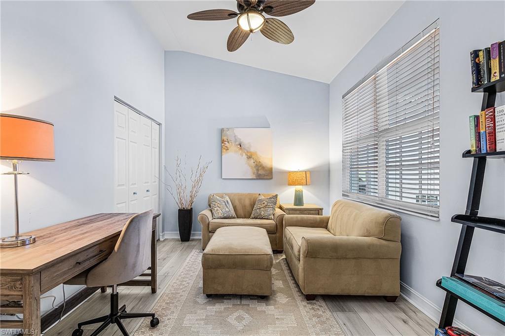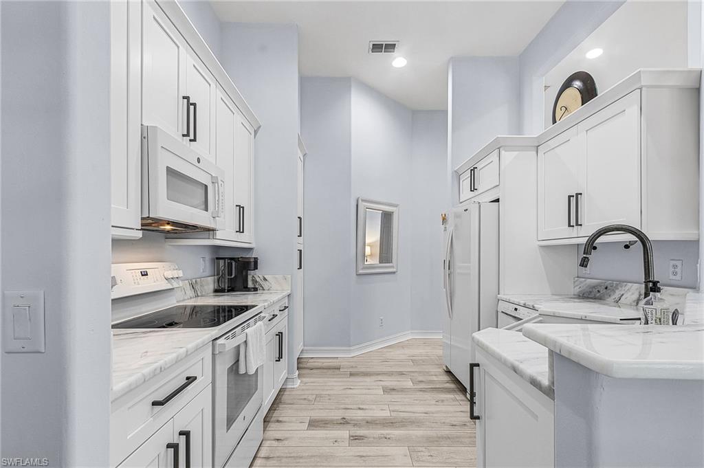 Step into this pristine second-floor coach home in Pelican Sound, one of Southwest Florida's top bundled golf communities. Offered turnkey furnished in a fresh coastal style with stylish accents, this residence boasts stunning views from the lake to the first fairway of the Lakes course. The updated kitchen features sleek quartzite countertops, tall 42-inch white cabinets, crisp white appliances, and convenient pull-out drawers for easy organization. Throughout the main living areas, soaring volume ceilings enhance the sense of space, complemented by durable luxury vinyl plank flooring that runs seamlessly from room to room. Recent upgrades—such as hurricane-resistant windows and sliding doors installed in 2025, refreshed baths, modernized kitchen elements, and new flooring—ensure the entire home feels thoughtfully refreshed and contemporary. Relax in the tranquil primary suite, which includes a tray ceiling, direct lanai access, and a spacious walk-in closet. The fully renovated primary bath offers a long vanity with dual sinks, an updated tiled shower, and a seamless shower door. For guests, a pocket door provides privacy along the hallway to the guest bedroom and its adjacent bath, which has been updated with a new vanity and quartzite countertop. The versatile third bedroom, with double doors, currently serves as a home office or den. Outside, park your car or golf cart in the one-car garage, with additional pads for two more vehicles and nearby guest parking. Access your private entrance via a dedicated stairwell, and enjoy the bright east-facing exposure that fills the space with morning light. Conveniently located near the Corkscrew Road gate, this lightly used vacation condo remains in exceptional condition—simply unpack and settle in! For an active lifestyle, Pelican Sound offers 27 holes of championship golf, 14 pickleball courts, 8 tennis courts, and 6 bocce areas, plus a state-of-the-art fitness center with professional staff. Bordering the Estero River with Gulf access, the community provides secure dry boat storage, kayaks, canoes, and paddleboards. A standout feature is the shuttle service—a scenic pontoon boat ride through Estero Bay to Lovers Key State Park Beach, perfect for spotting wildlife and soaking in breathtaking views. Residents also enjoy the clubhouse with exceptional dining options right in the neighborhood, so you never need to venture far for a memorable meal. Just moments from RSW International Airport, Coconut Point, and an array of shopping and restaurants, this is the ultimate spot to live the Florida dream!