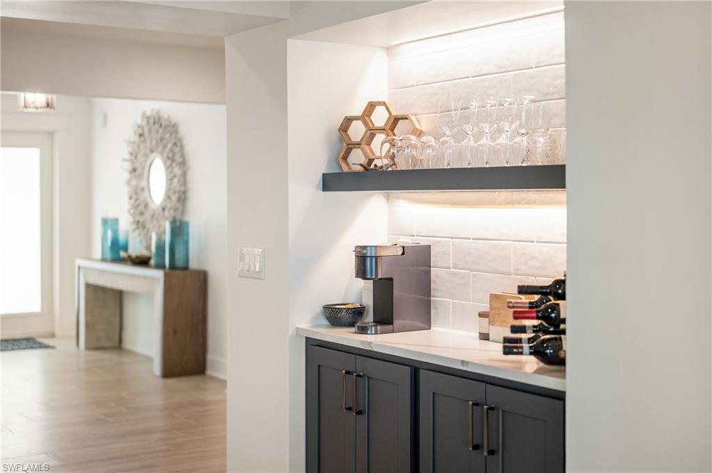This exceptional crown jewel, nestled on a quiet lagoon off Estero Bay, exemplifies the finest craftsmanship for the most discerning buyer. Timeless architectural character encompasses Front Row views of the Lagoon blend with modern architecture from the flat tile roof to include hurricane rated windows and sliders, custom oak stairway, porcelain tile work, stone work and hand-crafted wood work around door frames, baseboards, and cabinets. Total 3 bedrooms and 3 baths. The primary suite encompasses the circular 2nd floor with a Spa-like bath, walk in closet & waterfront view. On level one, step out to the resort style heated pool with made to order fountain, sundeck, bubbler and built in table. Fabulous outdoor kitchen and bar features stone counters, storage, refrigeration and marine grade stainless steel grill. Laguna Shores home is positioned on 60 feet of waterfrontage in a 'no wake zone' to protect the dolphins and manatees while capturing stunning panoramic views of the wildlife preserve. Other amenities include a newly constructed dock with 16,000 pound covered lift with wrap around captains walk to hold your dream boat. The home also features a two car garage, generator, 2 a/c units and flood gates. OMNI Hub app remote access provides pool control from your tablet or cell phone while you are away. Also, for the person who wants their toes in the sand, there are two community beach access points on Estero Blvd.