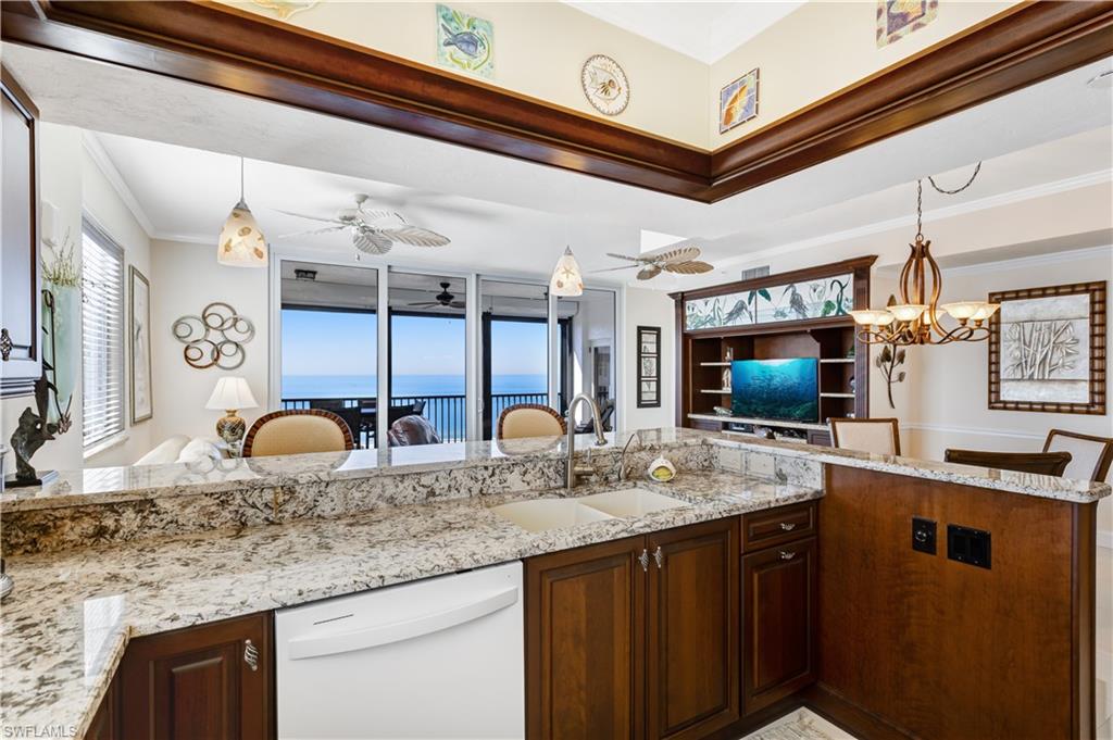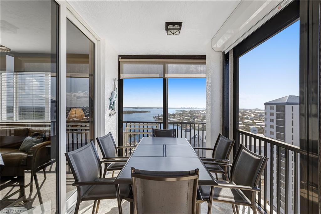 Welcome to the most beautiful grounds on Fort Myers Beach. This fully furnished 16th-floor Ocean Harbor penthouse offers the best of both worlds—stunning sunsets over the Gulf and peaceful sunrises across the Back Bay. Designed with versatility in mind, the floor plan features two ensuite bedrooms, each with its own private quarters, allowing for two fully equipped primary suites if desired. The custom kitchen has been tastefully updated with rich wood cabinetry, granite countertops, and abundant natural light that fills this corner residence. All windows and sliders are impact-resistant, the lanai features new electric storm shutters, there is a new hurricane-rated entry door, and all assessments have been paid. An in-residence laundry room provides added storage and convenience. Ocean Harbor offers some of the finest amenities on the island: • Six pickleball courts • Two tennis courts • Newly renovated community pool and clubhouse • State-of-the-art marina with 650+ feet of new seawall • Scenic boardwalk along the Back Bay Everyday conveniences are just steps away with a private entrance to Publix, direct beach access, a beach trolley stop, and the security of a gated community. This residence includes a premium under-building parking space close to the lobby, an additional assigned open space, and a private storage closet for bikes and beach gear. New carports are currently being installed. Pets allowed with Limits