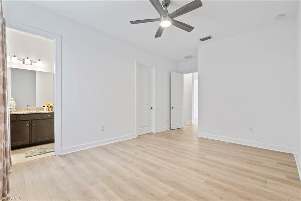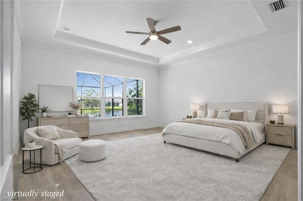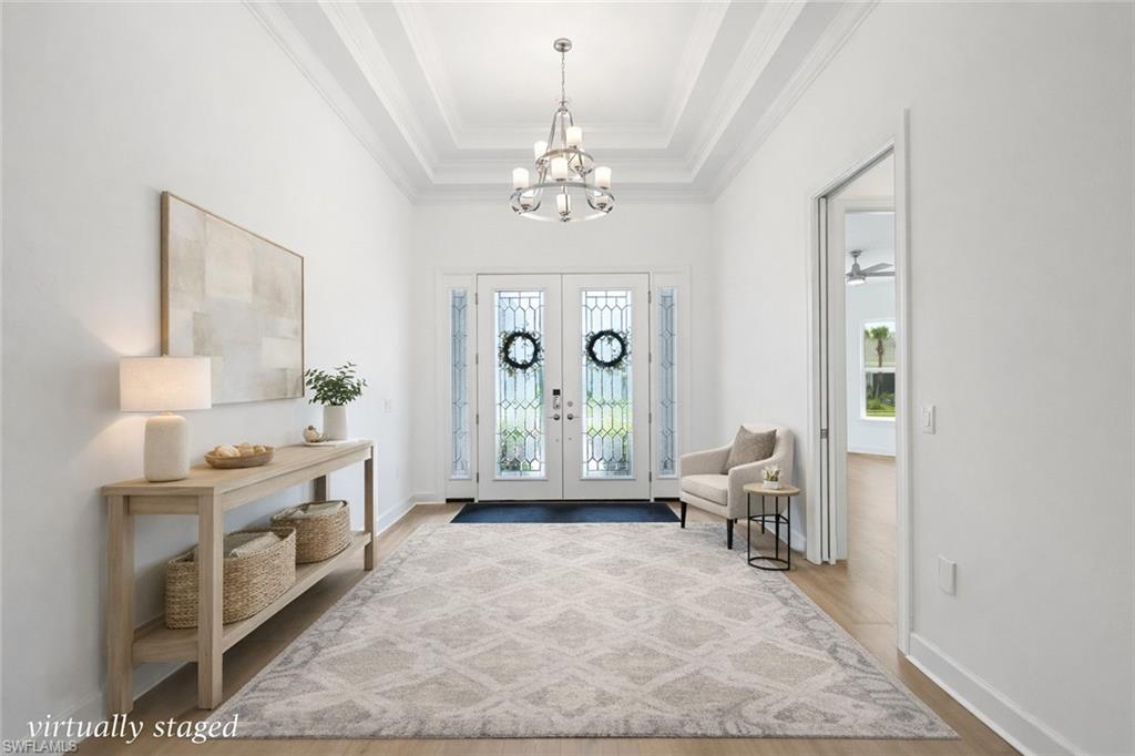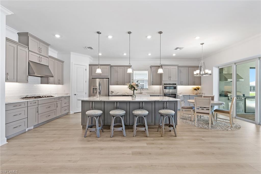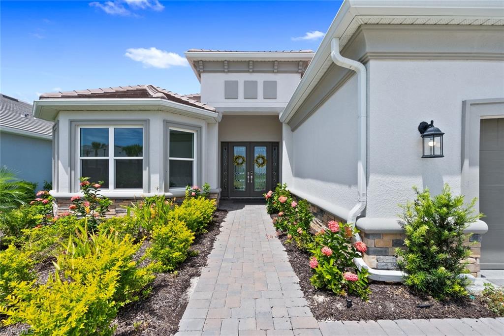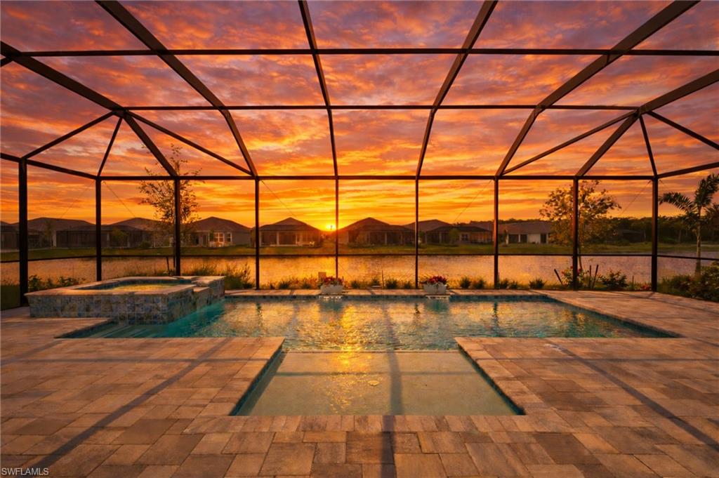 Located in the prestigious, gated community of Esplanade by the Islands, this newly completed 2024 Pallazio residence—the largest single-story floor plan in the community—offers an exceptional blend of sophistication, comfort, and resort-style living. Tucked away on a quiet cul-de-sac, the home spans 3,071 square feet and has been thoughtfully designed to provide privacy, flexibility, and effortless indoor-outdoor living. The residence features three spacious bedrooms, three full bathrooms, and a generously sized den, ideal for a home office, media room, or additional guest space. From the moment you step inside, refined finishes and architectural details create a sense of understated luxury throughout. At the heart of the home, the extended gourmet kitchen is both beautiful and functional, highlighted by upgraded quartz countertops, soft-close cabinetry with abundant storage, under-cabinet lighting, and a natural gas cooktop. An oversized island with an additional prep sink anchors the open-concept layout, making it perfect for both entertaining and everyday living. Expansive impact-rated sliders open to a private lakefront outdoor retreat with desirable western exposure. The custom heated pool is equipped with an extended deck, sun shelf, automatic pool filler, and electric hurricane shutters, while the fully appointed outdoor kitchen with natural gas grill creates a seamless space to relax or host guests against tranquil water views and evening skies. Throughout the home, luxury vinyl flooring, tray ceilings with crown molding, solid-core interior doors, and thoughtfully selected finishes elevate the living experience. Additional upgrades include a tankless natural gas water heater, central vacuum system, stylish paddle fans, and a brand-new washer and dryer. The 2.5-car tandem garage is equally impressive, offering epoxy flooring, built-in cabinetry with a work counter, and pull-down attic access, delivering both convenience and polished functionality. Residents of Esplanade by the Islands enjoy world-class, resort-style amenities, including the Bahama Bar, a full-service spa, an infinity-edge pool, tennis, pickleball, bocce ball, and an active social calendar. A new restaurant and state-of-the-art culinary center are currently under construction, further enhancing the lifestyle offering. With low HOA fees and a prime location just minutes from Marco Island and downtown Naples, this exceptional home delivers luxury, location, and lifestyle in perfect harmony.