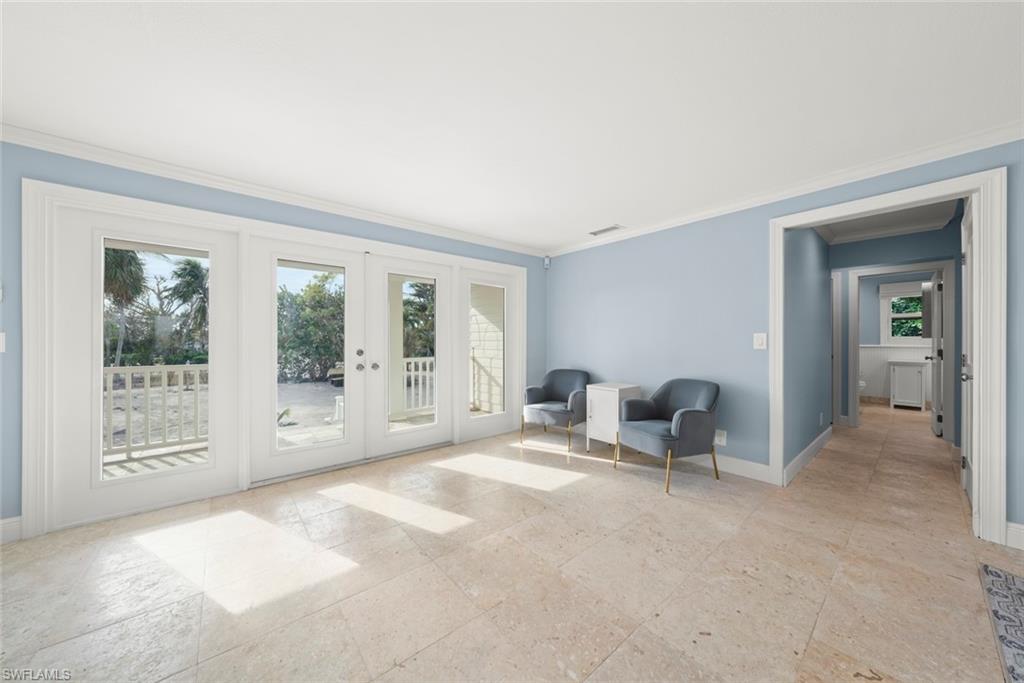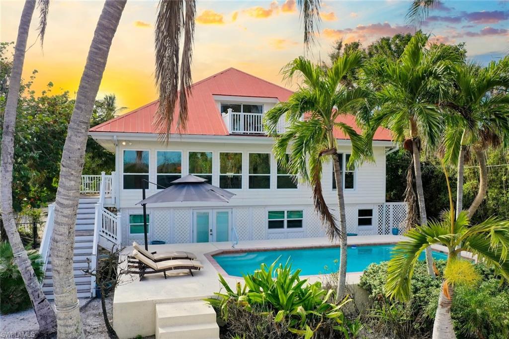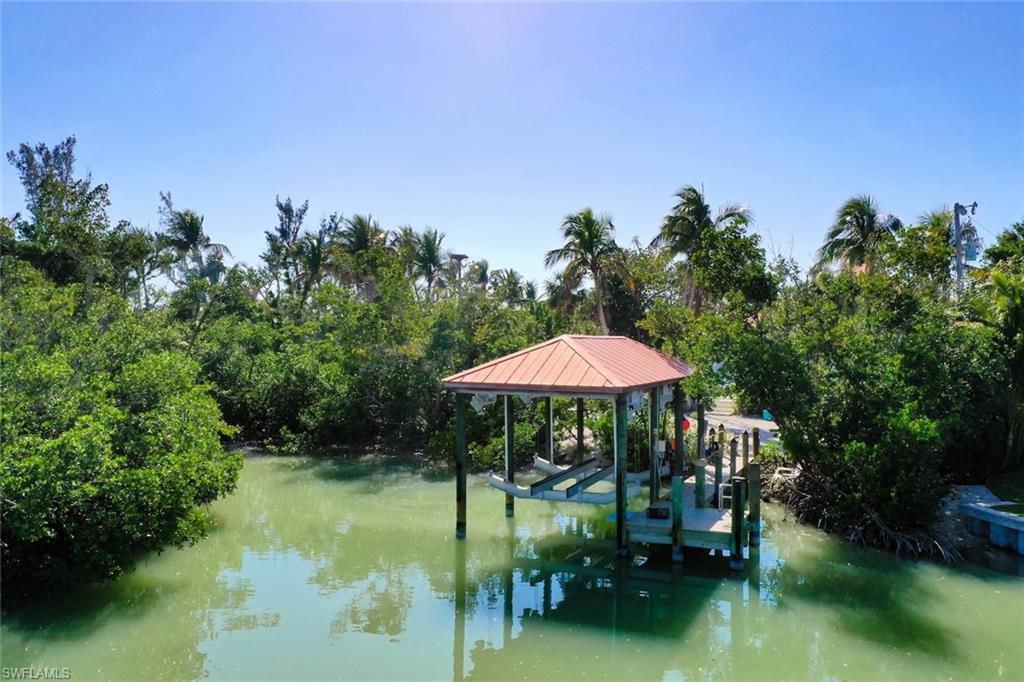 Welcome to your Captiva Island oasis! This Gorgeous home is the perfect island get-a-way- situated on Roosevelt channel offering direct Gulf access from your private dock and a rare boathouse with 20,000lb. boat lift- the natural shoreline adds privacy and allows for a great kayak/SUP launch area. Just a short stroll to one of the best beaches and shelling locations! This 3 bedroom, 3 bath, pool home has Travertine floors throughout main living level and hardwood floors in the private, 2nd floor primary suite. The primary suite has vaulted/beamed ceiling & a private sunning deck w/water views. Primary bathroom has double sinks and custom glass tile. The kitchen has been completely renovated and cleverly designed to maximize storage and flow in the main living area, adding a custom island and space for a 60" range and hood, custom built-ins added in all bedroom closets, this home is light, bright and everything you want in an island home. After a day on the water, take a swim in the sparkling concrete elevated pool surrounded by lush tropical vegetation offering a feeling of seclusion and privacy. Newer Septic system, 2 a/c's 2022, washer & dryer 2025. Enjoy Island living, boating, fishing, shelling, sunning and stunning sunsets on Captiva Island. Property sold furnished, main living area and bedroom images are virtually staged adding accessories and artwork. Furniture is in place. 60" Range and hood in kitchen is virtually staged, propane tank installed and piped ready for range to be installed.