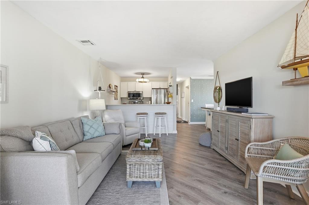 Waterfront Corner Residence with Direct Intersecting Canal Views! This beautifully redesigned second-floor 1-bedroom, 2-bath corner/end unit offers sweeping water views from three sides and expanded indoor living space after opening the lanai under air. Thoughtfully curated with a coastal-inspired interior and high-end finishes, this residence delivers both style and function. Notable Upgrades & Features: •Hurricane impact doors & windows •Plantation shutters throughout •High-end furnishings (included) •Raised ceilings in both remodeled bathrooms •Fully remodeled bathrooms, master shower only and full guest bath with shower and cast iron tub -upscale finishes •Exquisite quartz countertops •Stainless steel kitchen appliances •Luxury vinyl wood flooring •Decorator lighting and ceiling fans •Sun-shade blinds for added comfort and privacy •In-residence washer & dryer •Additional attic storage •Custom woodwork and private interior storage •Corner/end unit with intersecting canal views •Water views from three sides •Expanded living area with enclosed lanai under air. Enjoy your mornings watching dolphins, manatees, and boats glide by, or cast a line right from your waterfront setting. Located just steps from the white sandy beaches and turquoise waters of the Gulf of Mexico, this residence offers the ultimate coastal lifestyle. Walk to Santini Marina Plaza, featuring the full-service FishTale Marina, waterfront dining, and resort-style shops, and end your day with breathtaking sunset views over the Gulf. With weekly rental flexibility and pet-friendly policies, this property presents an excellent opportunity for personal enjoyment or investment. Your perfect “peace” of paradise awaits in Fort Myers Beach