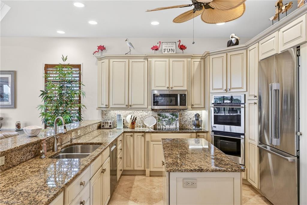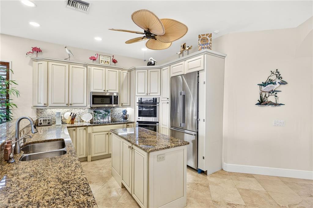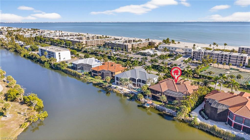 Custom designed and built with quality concrete construction, this three bedroom, four and a half bath residence lives like a private island retreat. Lush tropical landscaping and vibrant gardens frame the home, setting the tone before you even step inside. The great room is light, open, and elegant with marble floors, a wood burning fireplace, and a striking decorative glass window that anchors the space. Arched openings and thoughtful architectural details carry throughout, creating a home that feels refined yet relaxed. The gourmet kitchen is designed for both function and entertaining, featuring stainless steel appliances, custom cabinetry, granite countertops, a generous breakfast bar, pantry, and a butler’s station complete with wine cooler and ice maker. Just beyond, the family room offers custom-built ins and peaceful views of the Sanibel River, because even movie night should come with scenery. The primary suite is a private sanctuary filled with natural light and finished with crown molding, a walk-in closet, and a luxurious bath featuring a dressing table, dual vanities, a dramatic walk-in shower, and a separate soaking tub. Two additional guest bedrooms each offer ensuite baths, providing comfort and privacy for family and visitors alike. Indoor and outdoor living blend effortlessly as expansive glass doors open to a large, tiled lanai. The upper-level porch features a full outdoor kitchen with gas grill, sink, and refrigerator, making it easy to host sunset dinners overlooking the river. Below, the paver pool patio surrounds the heated pool and spa, delivering true resort style living with water views from every angle. All of this is perfectly positioned to offer serene riverfront living while being directly across the street from the beach. Quiet mornings on the water, afternoons by the pool, and sunsets over the Gulf. This home delivers the best of island living, inside and out.
