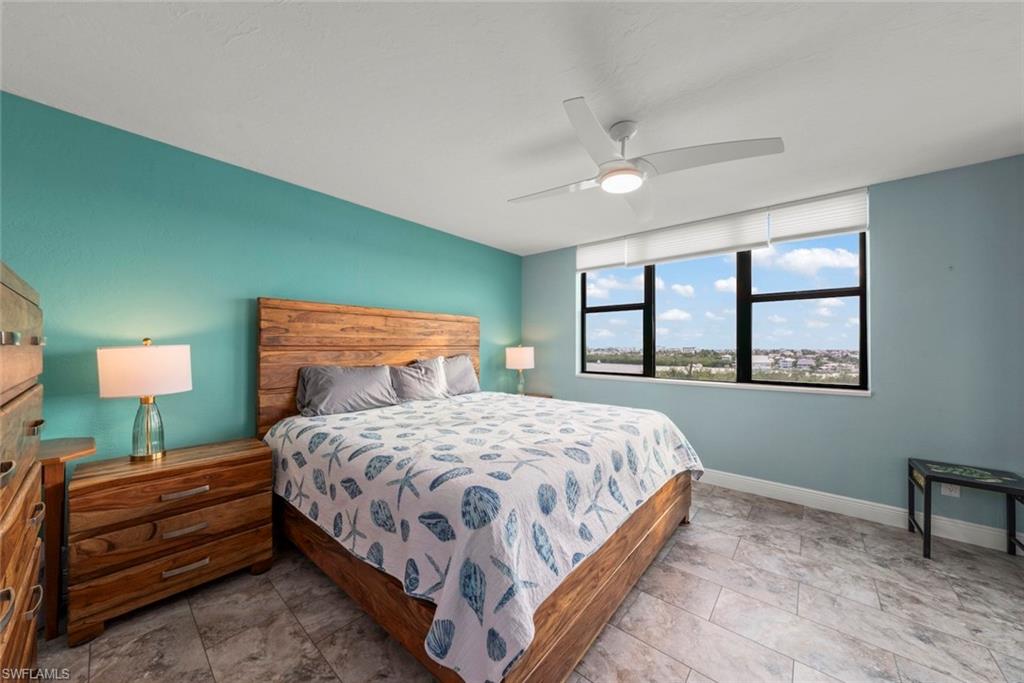 If you enjoy watching dolphins, manatees, and pelicans with spectacular views from every room, this is the place! This light and bright, turnkey-furnished, 2-bedroom, 2-bath corner unit on the 8th floor features a SW exposure, providing incredible year-round sunsets and endless bay and gulf views from Sanibel Island to Bonita Springs and beyond! Updates include hurricane-rated sliding glass doors and windows, HVAC system, paint and trim, LV flooring throughout, a stackable washer/dryer, window treatments, ceiling fans, and light fixtures. The galley-style kitchen updates include soft-close cabinets and drawers, quartz countertops, new appliances, tile backsplash, and a tray ceiling. The primary bedroom features bay views, lanai access, remote-controlled window shades, and an ensuite bathroom. Both bathrooms feature updated vanities, quartz countertops, new tile, fixtures, showers, and lighted mirrors. Boardwalk Caper is an active gated, direct gulf access community with reasonable HOA fees and over 200 boat slips with a 1/2 mile long boardwalk along a wide, deep water canal, with tennis, pickleball, and shuffleboard courts, and 4 pools. The building has new elevators, new lanai rail systems, a heated, resort-style pool on the bay, an exercise room, a community/entertainment room, a Tiki Bar and grilling area, a kayak/paddleboard launch, storage lockers, and more! The community grounds, docks, and amenities were recently updated, with plenty of boat slips available for sale or lease, plus the $1,800 quarterly condo fee is much lower than any comparable properties! The soft, white sand beach, with its vibrant restaurants and entertainment district, is just a short distance away, and the trolley stops right in front of the complex during the busy season. There's a popular seafood restaurant and marina right next door, with boat/kayak/sup rentals, a boat club, dolphin/shelling/sunset tours, fishing guides, and offshore charters. This is a great opportunity to relax in comfort, enjoy spectacular views, and experience everything the SWFL lifestyle has to offer!