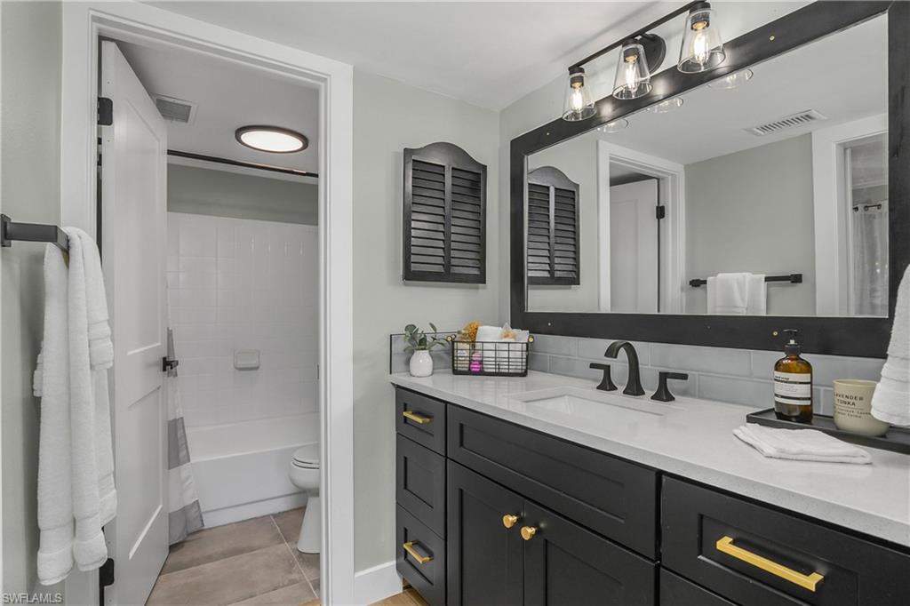 Amazing location just minutes from downtown Naples and affordable move in ready condition! This freshly renovated 1-bedroom, 1-bath condo with a private lanai is located in the desirable Lakewood community, only 10 minutes from Fifth Avenue’s renowned restaurants, shopping, and white-sand beaches. Situated on the top floor of a quiet three-story building with no neighbors above, this residence offers privacy along with peaceful views of the community pool and park-like grounds. The bright, open floor plan features a spacious living room flowing into a dedicated dining area—perfect for everyday living or entertaining. New laminate/Luxury Vinyl Wide Plank flooring adds warmth and easy maintenance throughout. The updated kitchen includes stainless steel appliances, two tone shaker all wood cabinetry, light quartz countertops, a breakfast bar, and washer/dryer hookups conveniently tucked into the kitchen area. The generously sized bedroom offers a large closet, while the bathroom has been updated with a new vanity and matching quartz countertop. An additional storage locker provides extra space for your belongings. Residents enjoy a community pool and spa, elevator access, and one deeded covered carport space with ample guest parking. HOA fees include water, basic cable, high-speed internet, landscaping, trash removal, and more. The association allows 30-day rentals up to three times per year and small pets. The community is set on a public golf course with optional Lakewood Country Club membership—no mandatory fees. Enjoy pay-as-you-play golf, along with optional access to tennis, pickleball, and clubhouse dining. Conveniently located next to Publix, with shopping and dining nearby, and just five miles to Olde Naples and the beaches. This is an excellent opportunity for a first-time buyer, seasonal resident, or investor seeking strong rental potential. Easy to show and move-in ready.