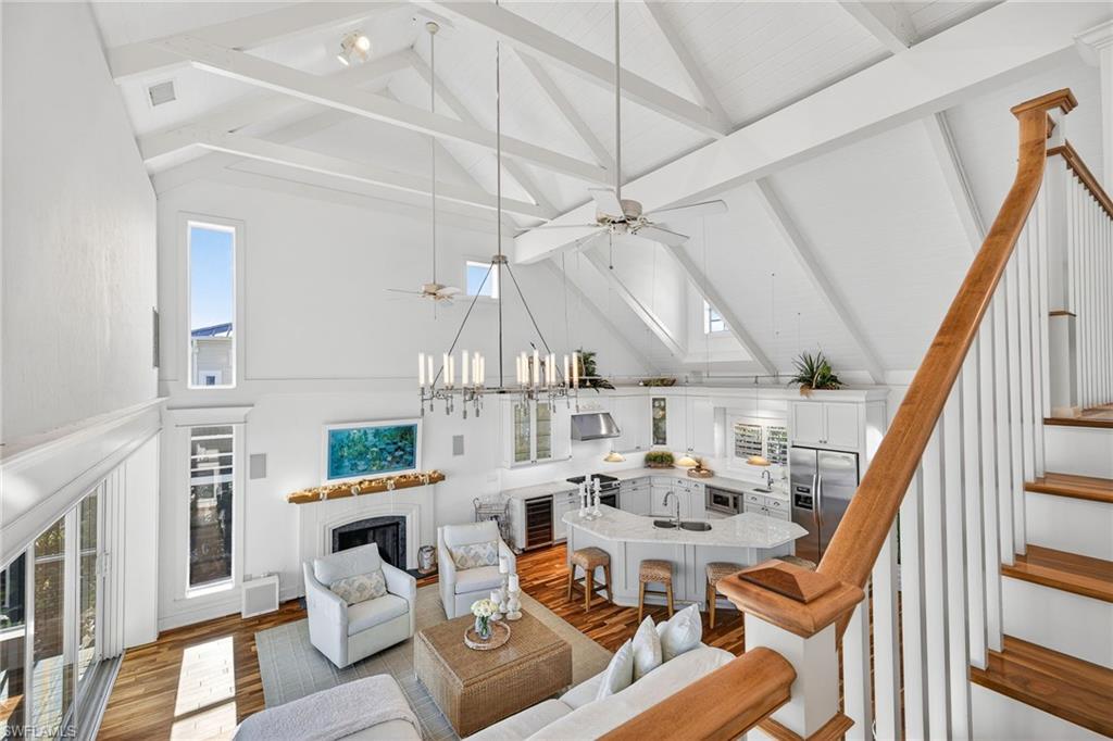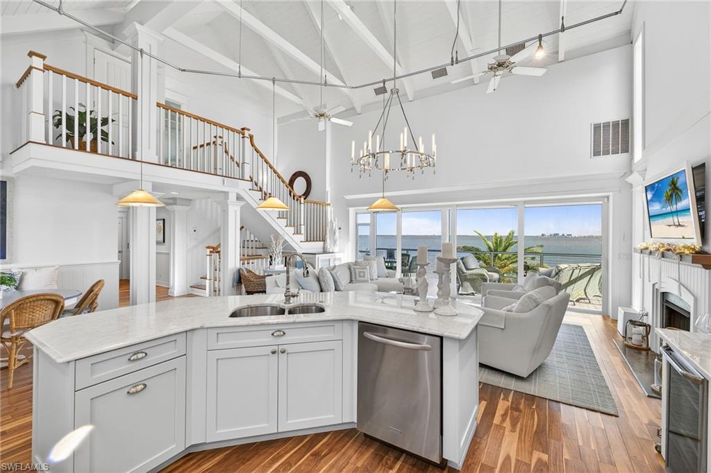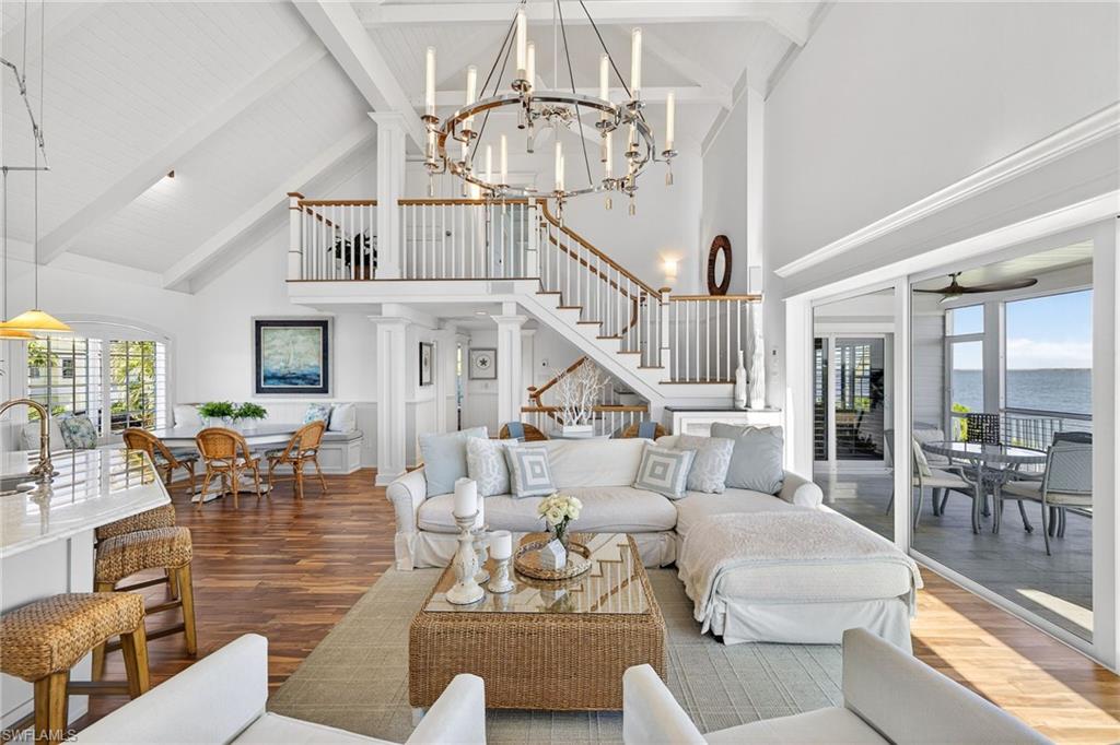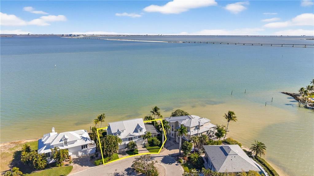 This exceptional fully furnished waterfront residence offers a refined coastal lifestyle with multiple indoor and outdoor living spaces designed to capture expansive bay views. The main living level features an open-concept design with soaring vaulted ceilings and exposed beams, providing seamless flow from the kitchen to the living area and out to the waterfront balcony with endless views. Designed for both comfort, and entertaining. The kitchen is equipped with a gas range, and the living area is anchored by a fireplace, adding both functionality and warmth. Also located on the main floor are two bedrooms and two bathrooms, including a guest suite with an ensuite bath and bay views. An elevator services all three levels, offering convenient access throughout the home. The private primary suite showcases incredible water views, a spacious bathroom, and an oversized walk-in closet. Outdoor living is equally impressive, highlighted by a covered outdoor kitchen overlooking the pool and bay. A heated pool allows for year-round enjoyment, making this an ideal setting for entertaining and waterfront living.