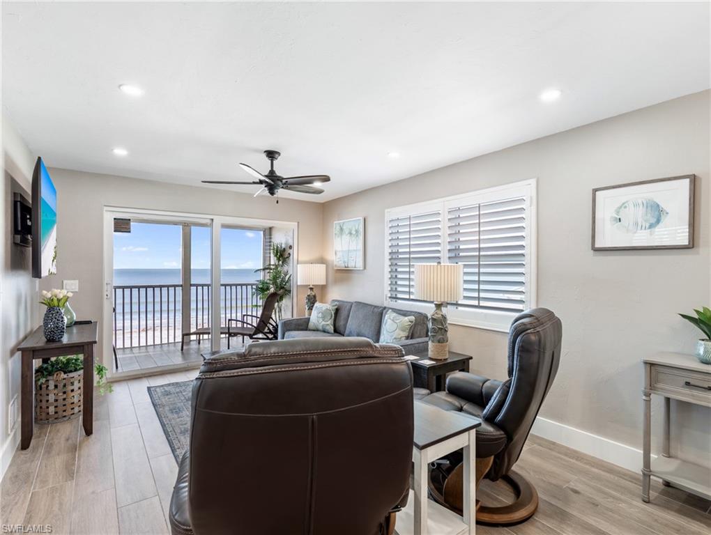 Stunning Gulf of Mexico beachfront views define this turnkey 4th-floor end-unit condo — a beautifully renovated coastal retreat designed for comfort, style, and effortless living. This fully updated 2-bedroom, 1.5-bath residence features tile flooring throughout and thoughtful designer touches, including plantation shutters and chic coastal furnishings. The split-bedroom layout offers privacy for you and your guests, while the bright and spacious great room takes full advantage of the natural light only an end unit can provide. The modern kitchen shines with Cambria countertops, new stainless steel appliances, a convenient bar-top seating area, and a cozy dinette space. Step outside to your private lanai and listen to the waves roll in — the perfect spot to unwind and take in the Gulf breeze. Tile flooring extends outdoors for a seamless indoor-outdoor feel. Peace of mind comes standard with impact-resistant windows, doors, and sliders, complemented by electric hurricane shutters. A rare bonus: this unit includes coveted under-building parking. Whether you choose to enjoy this condo year-round or take advantage of the flexible 7-day rental program, the possibilities are wide open. Spectacular sunsets, sugar-white sand, and the vibrant energy of Fort Myers Beach — now in full resurgence — are all at your doorstep. Minutes from shopping, dining, entertainment, and local hotspots. This is more than a condo — it’s your place in paradise. Welcome home.